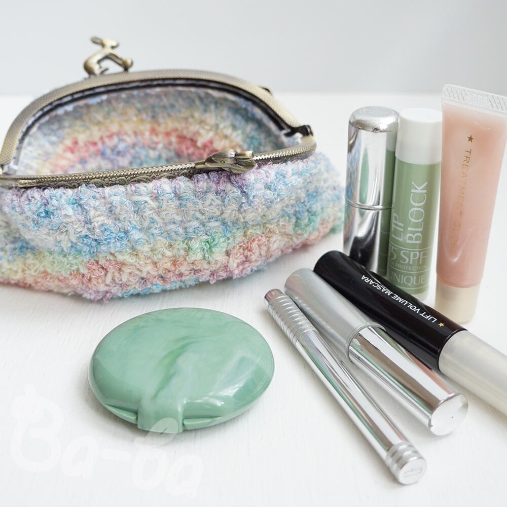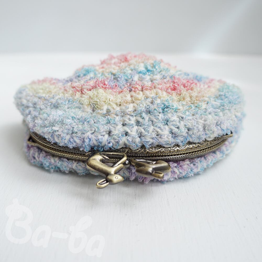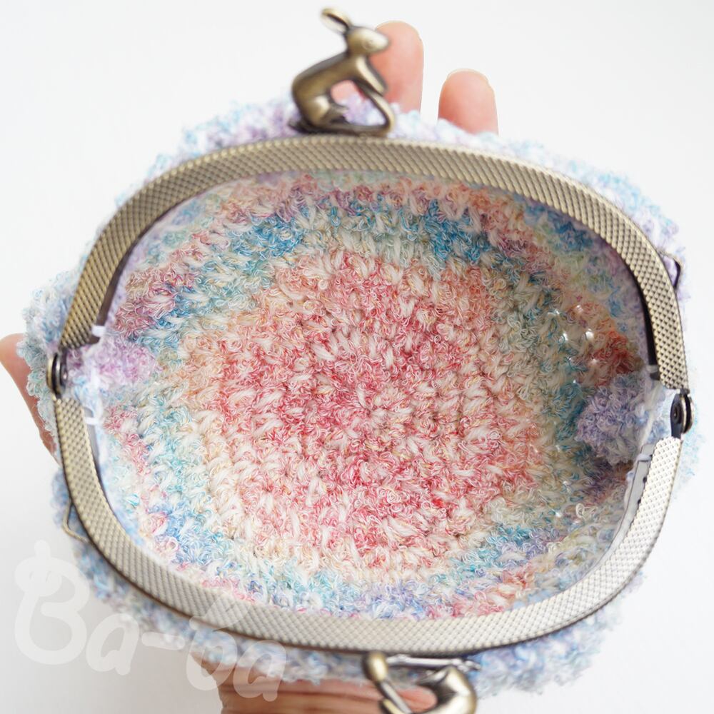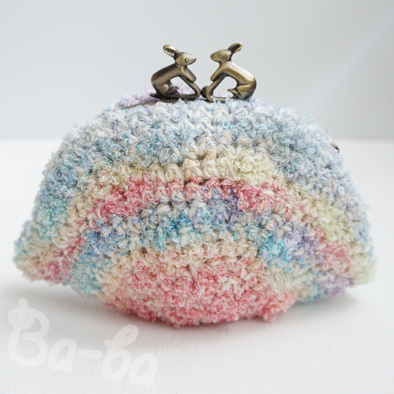 虹色段染めのモールヤーンをふんわりと編み上げ、がま口に仕上げました。