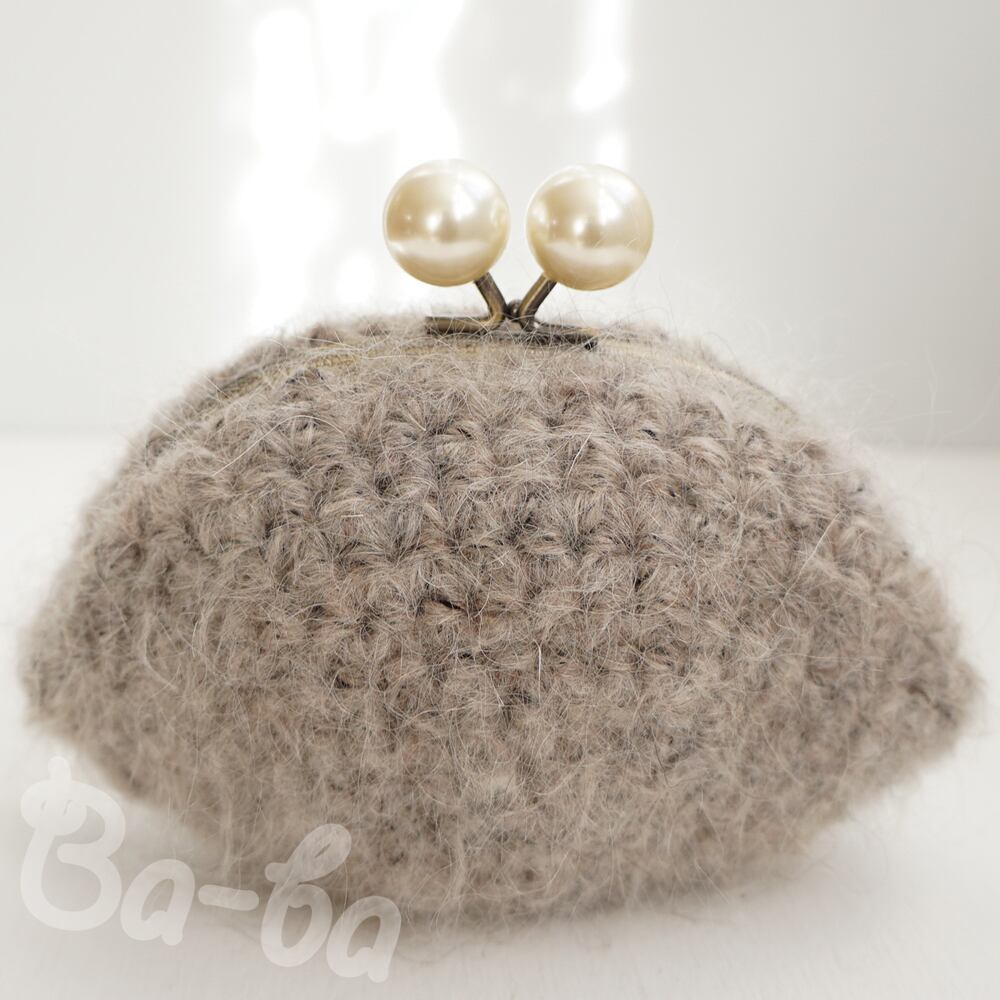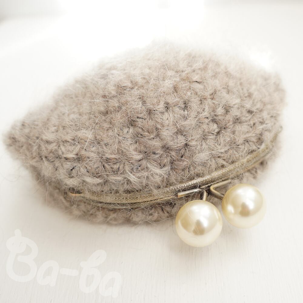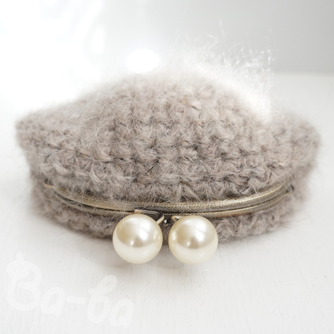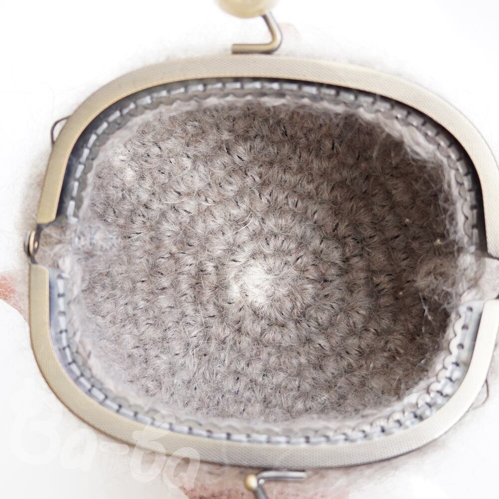 毛足の長いモヘヤ毛糸をふんわりと編み上げ、がま口に仕上げました。