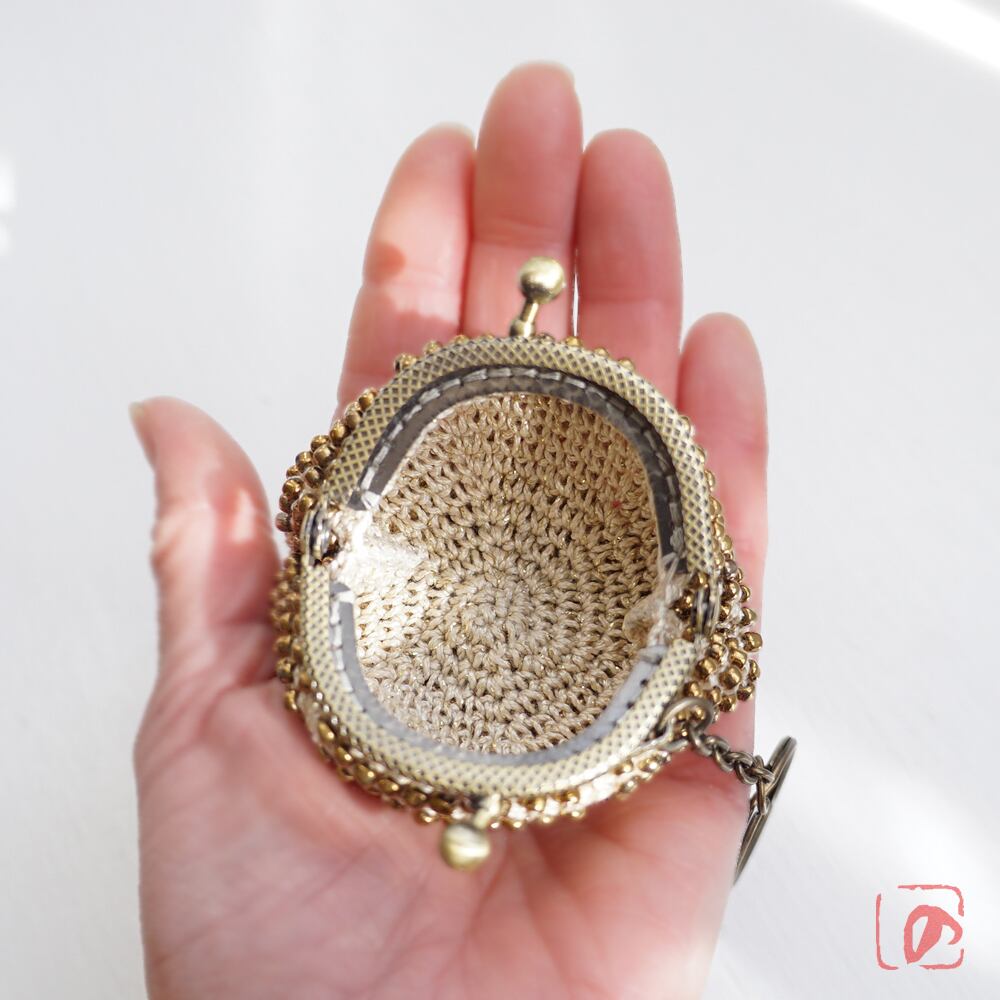口金 : アンティークゴールド(型押し柄)、5cm、丸型、チェーンとリング付き