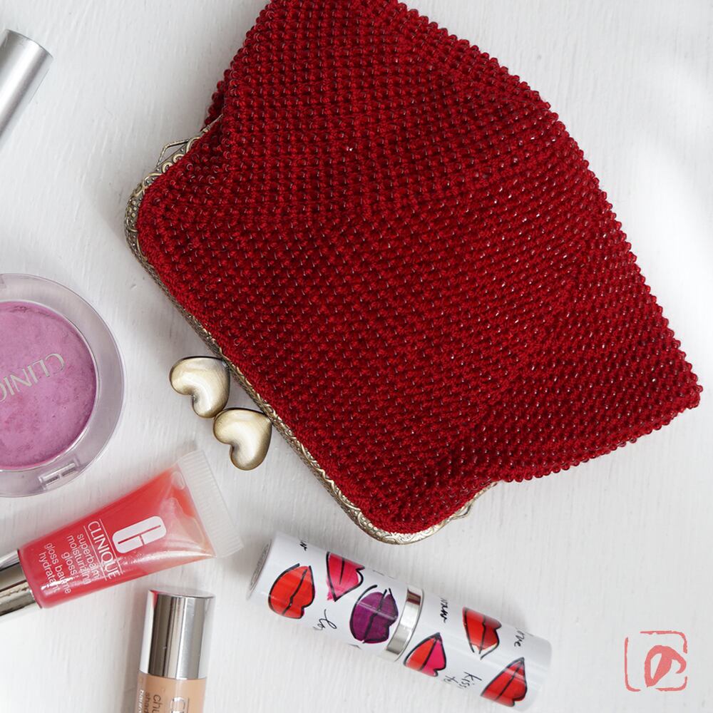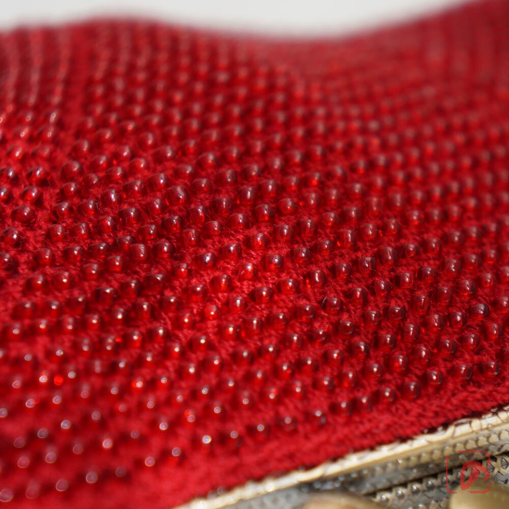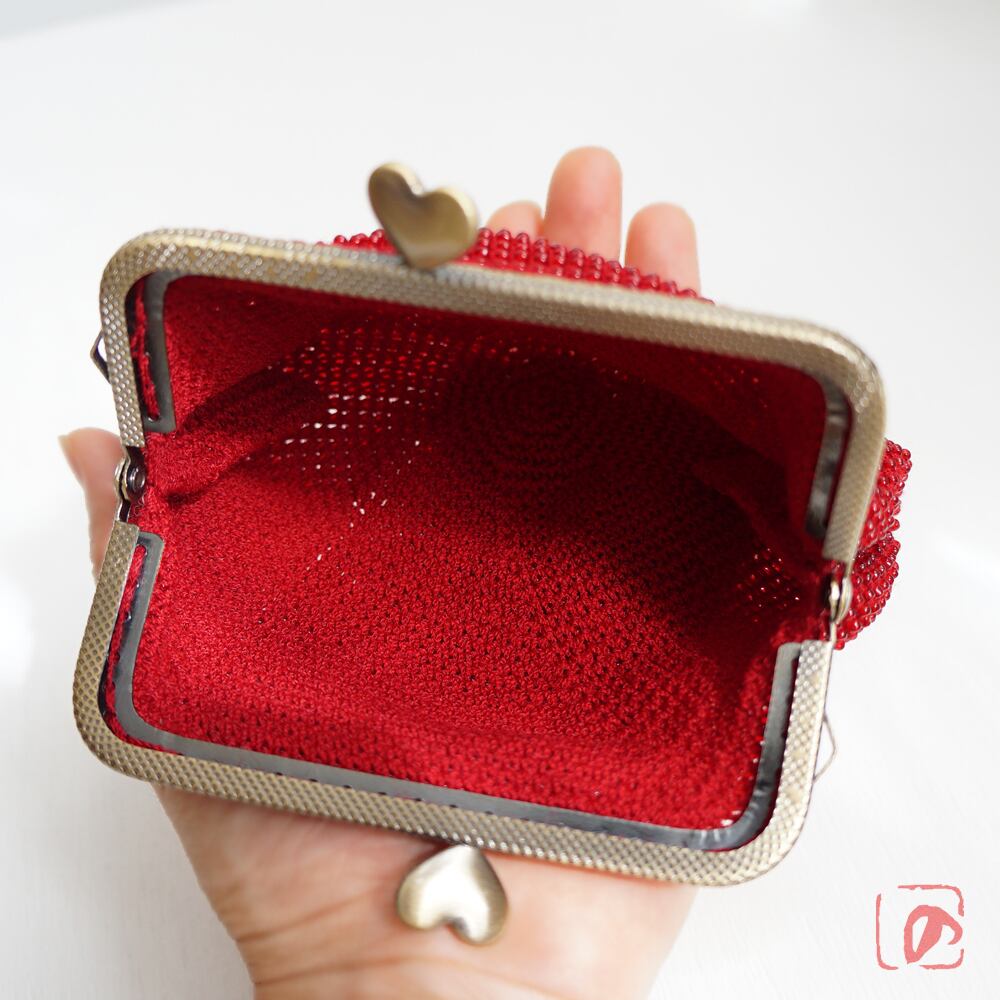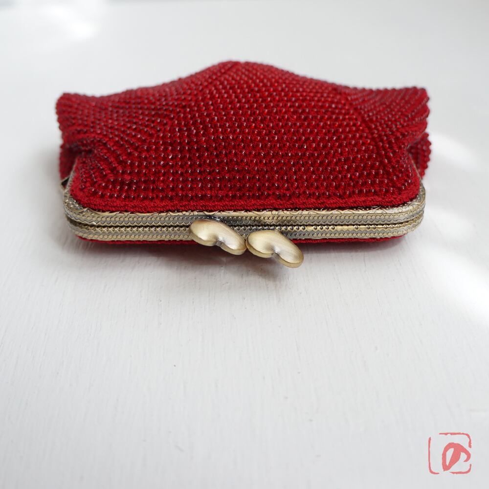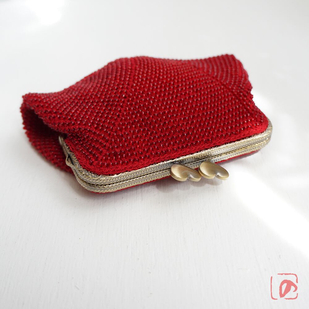 赤色の糸とビーズを使用、鮮やかながま口です。