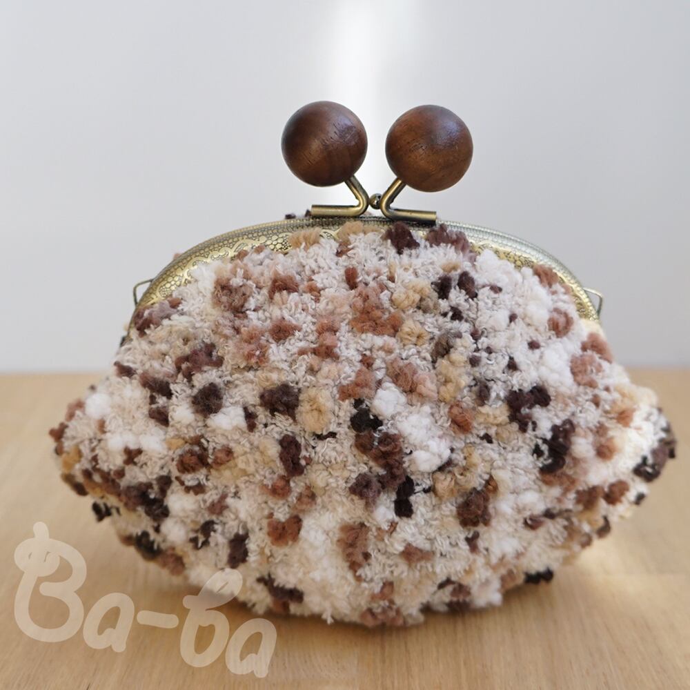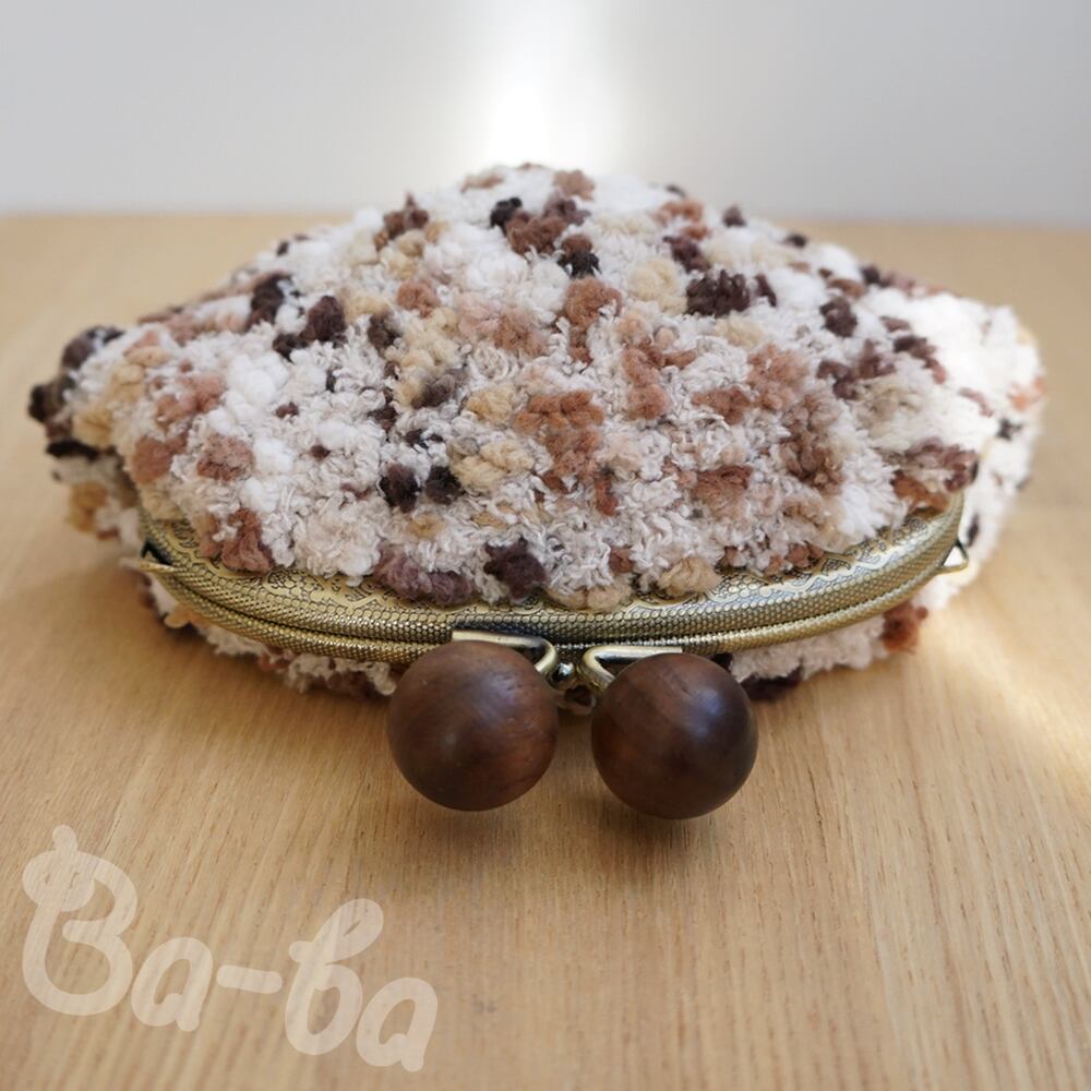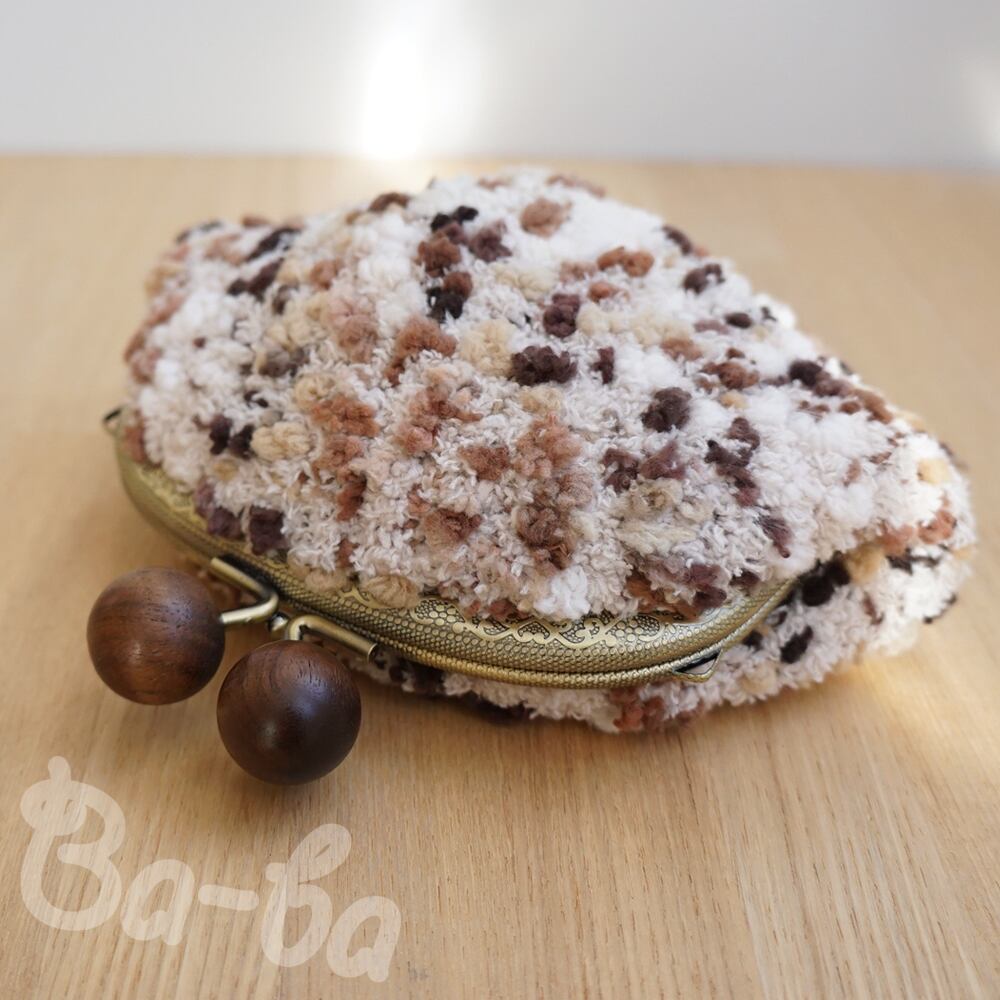 うし色のモールヤーンをふんわりと編み上げ、がま口に仕上げました。