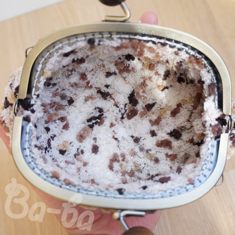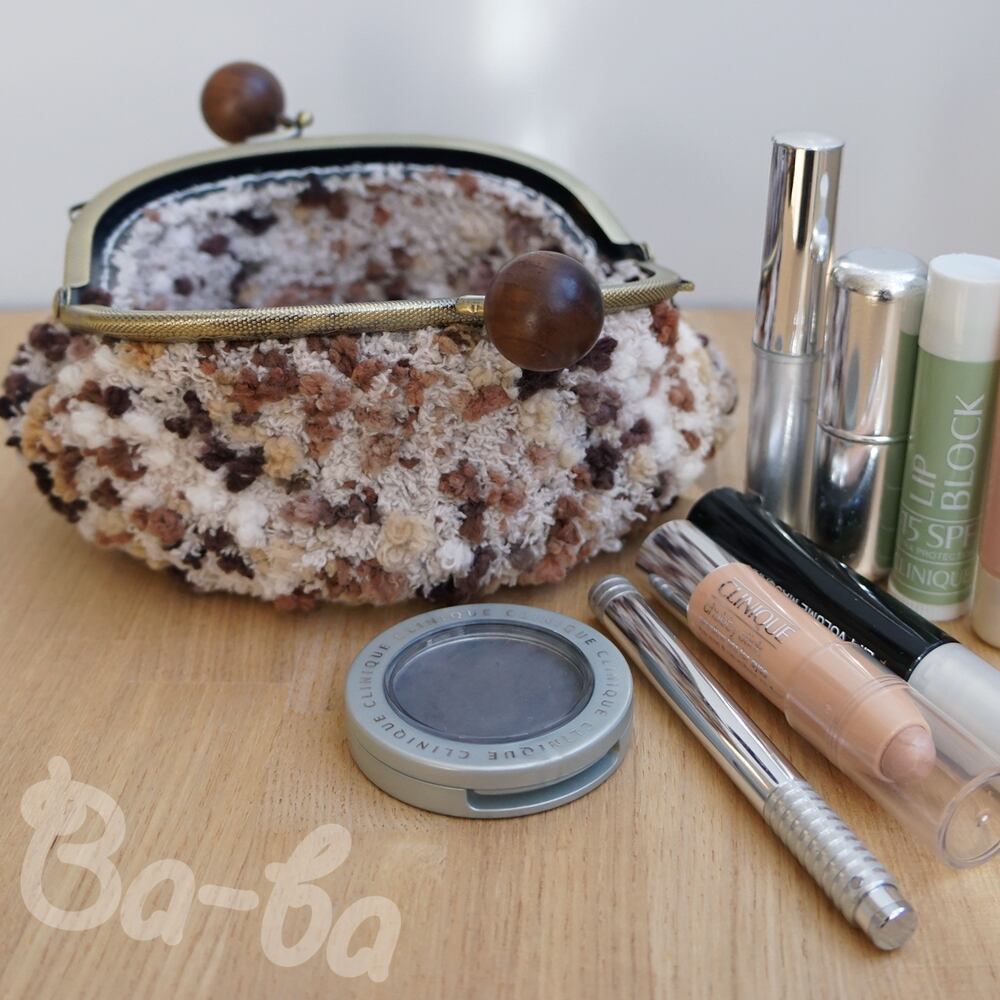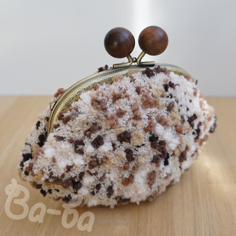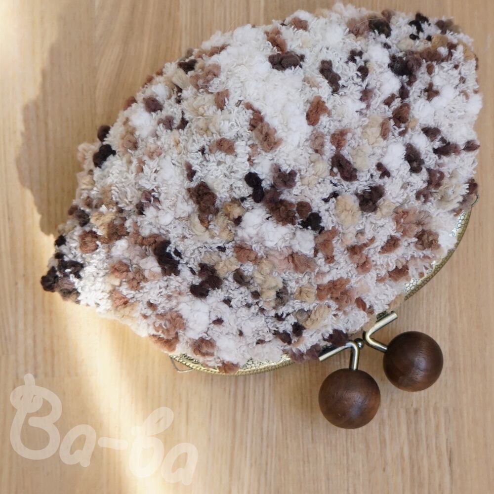 うし色のモールヤーンをふんわりと編み上げ、がま口に仕上げました。