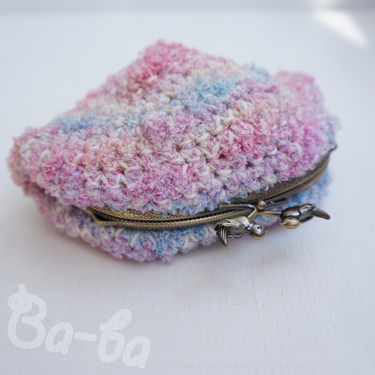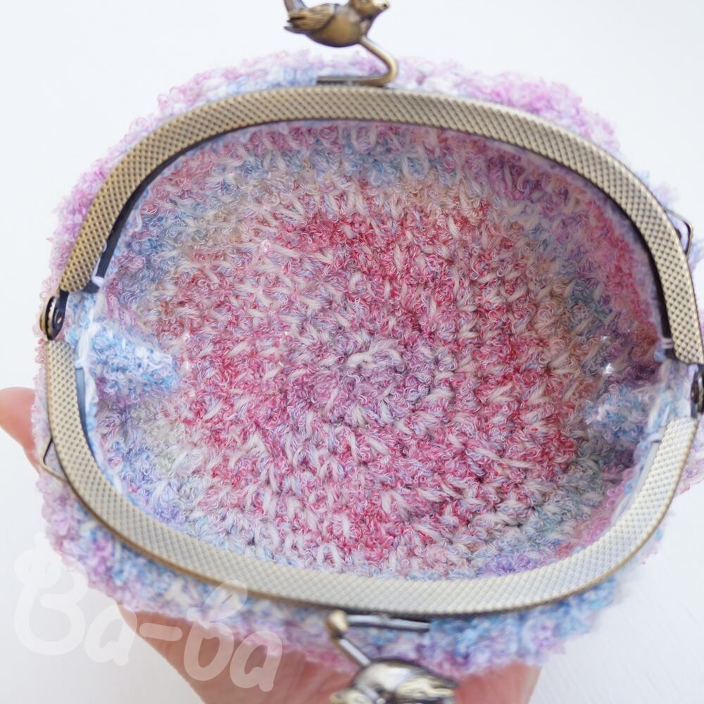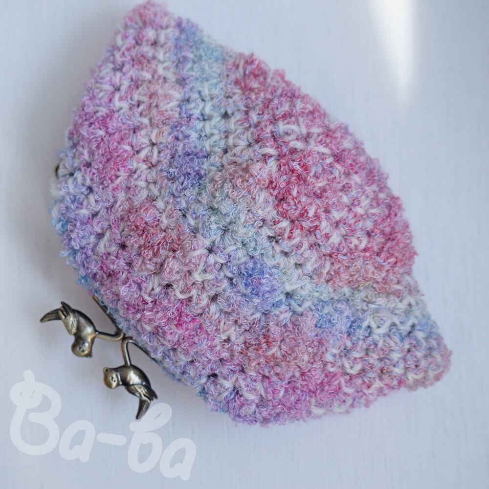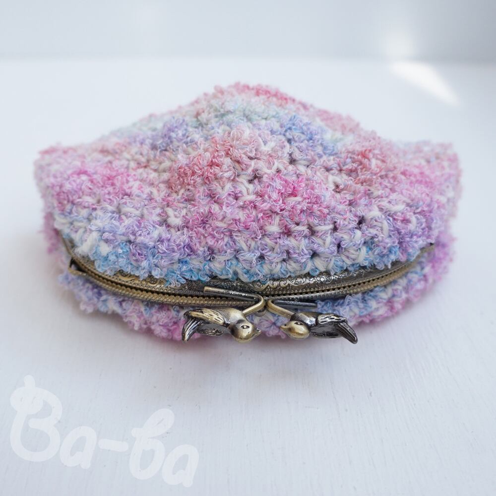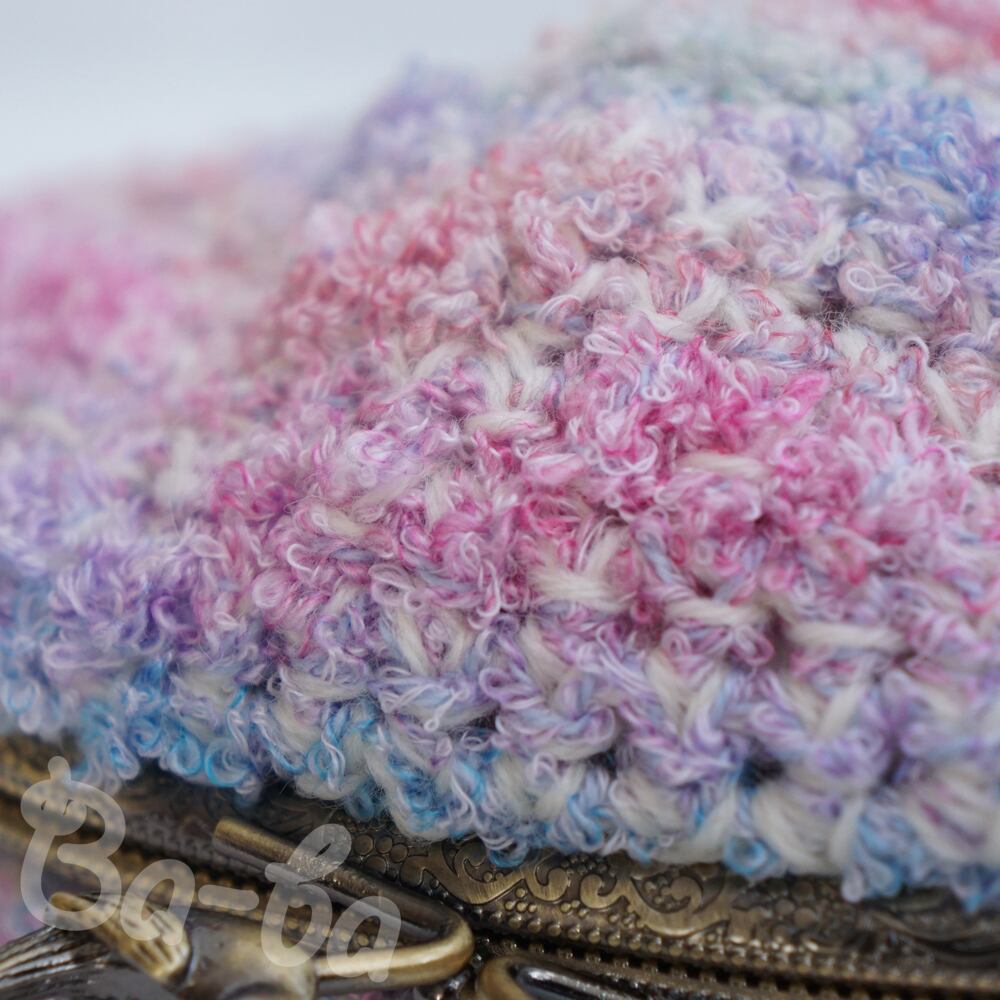 虹色の毛糸をふんわりと編み上げ、がま口に仕上げました。
