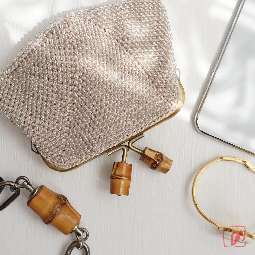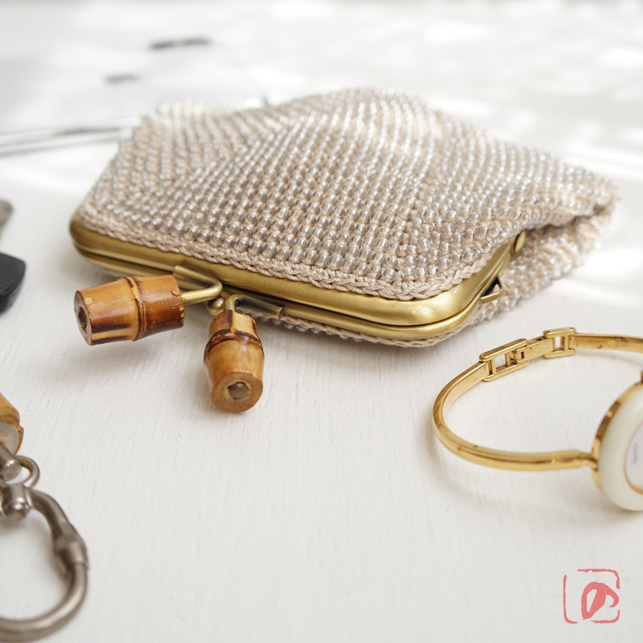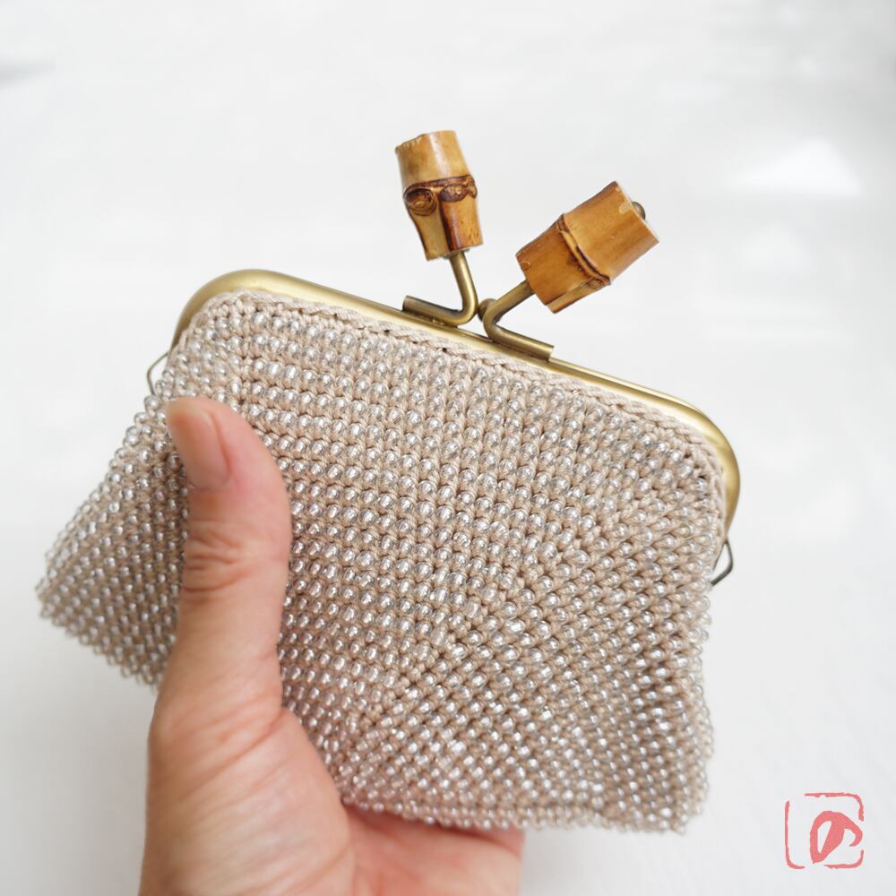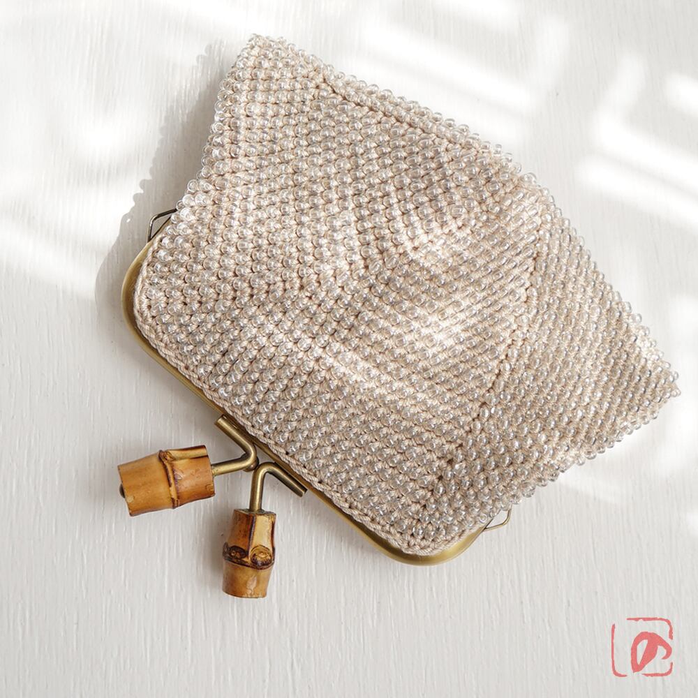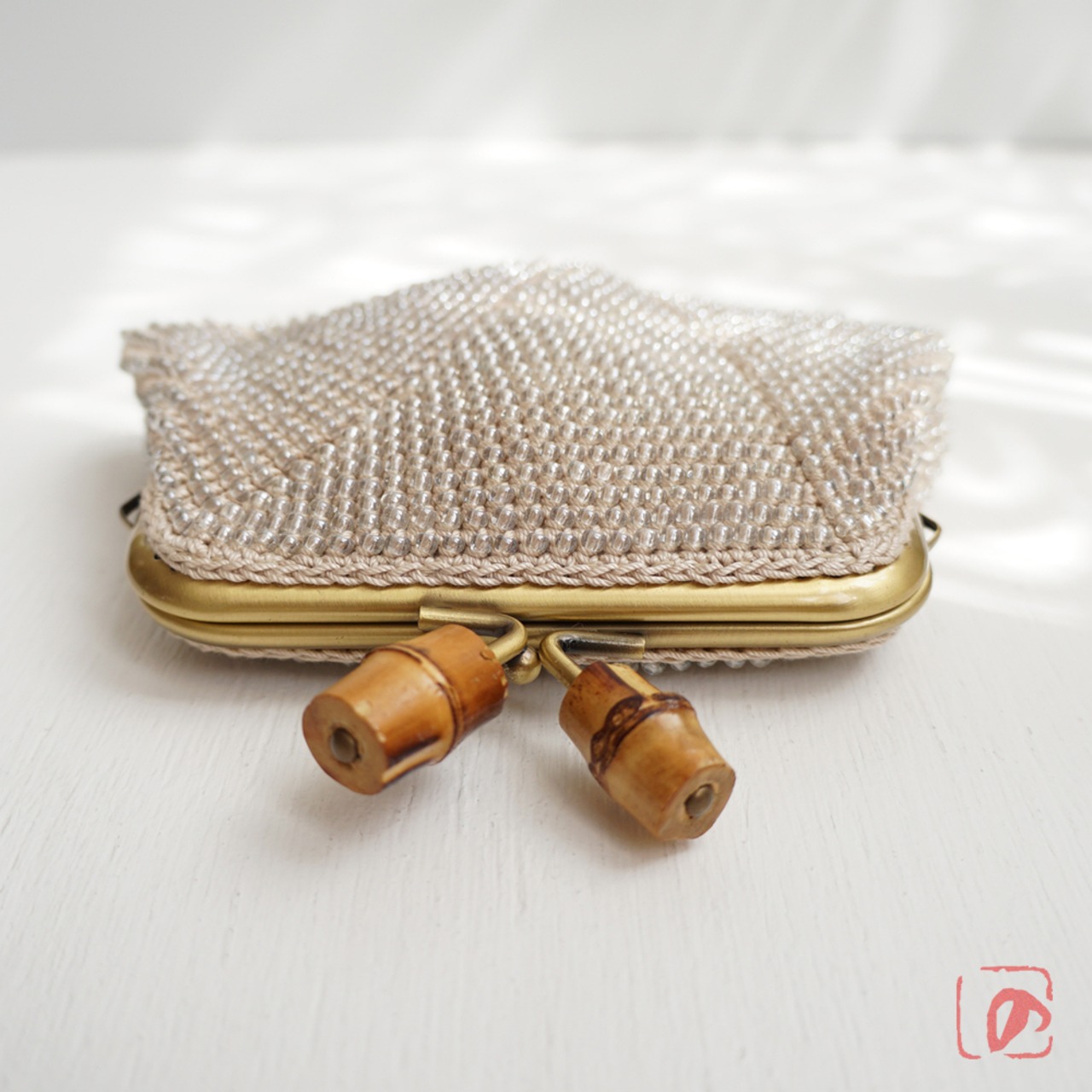 ばあば作、大きめ・総ガラスビーズのスクエアがま口(beige・1530)