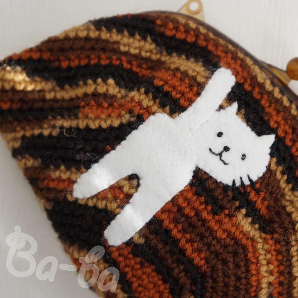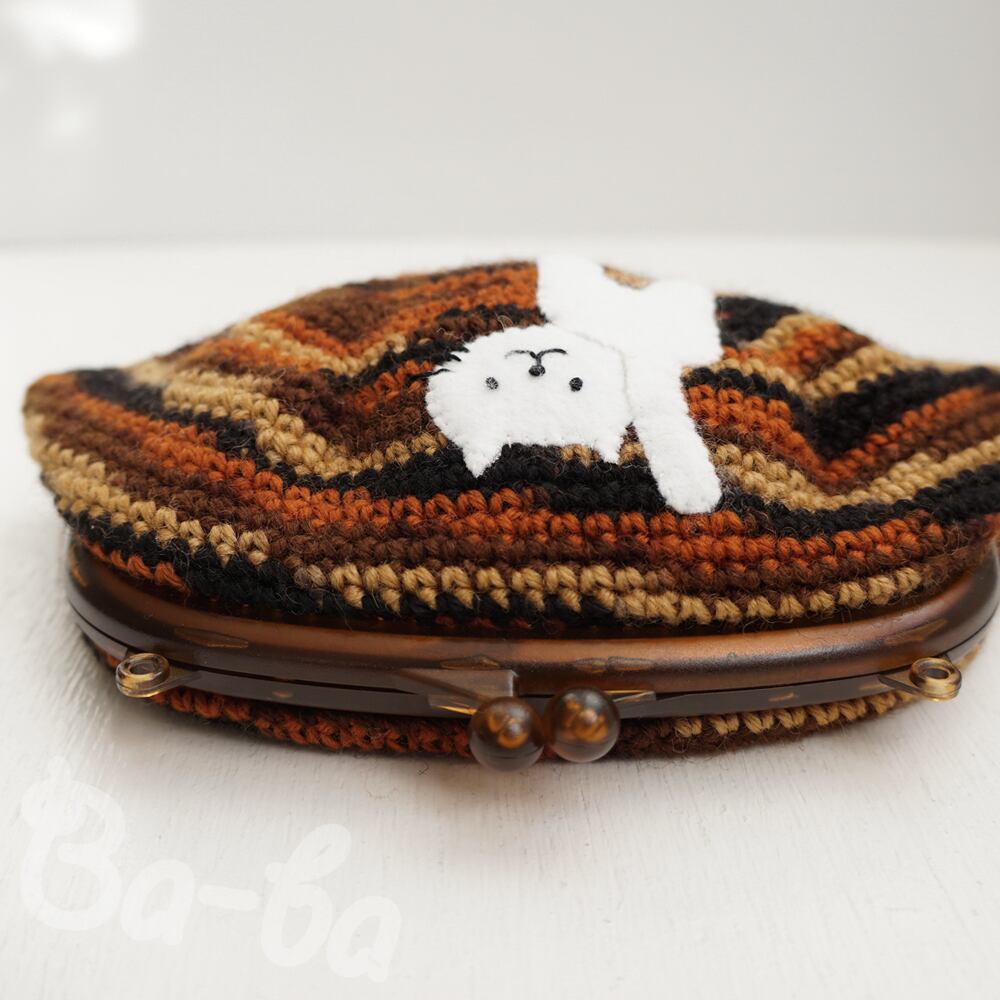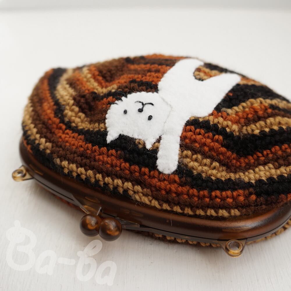 茶色グラデーション編み地のがま口に、ふりかえるシロのアップリケをしました。