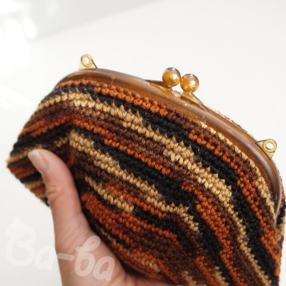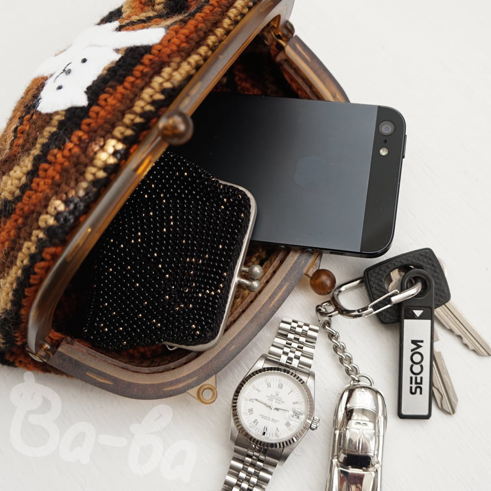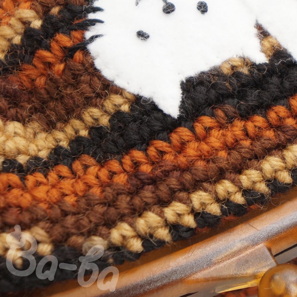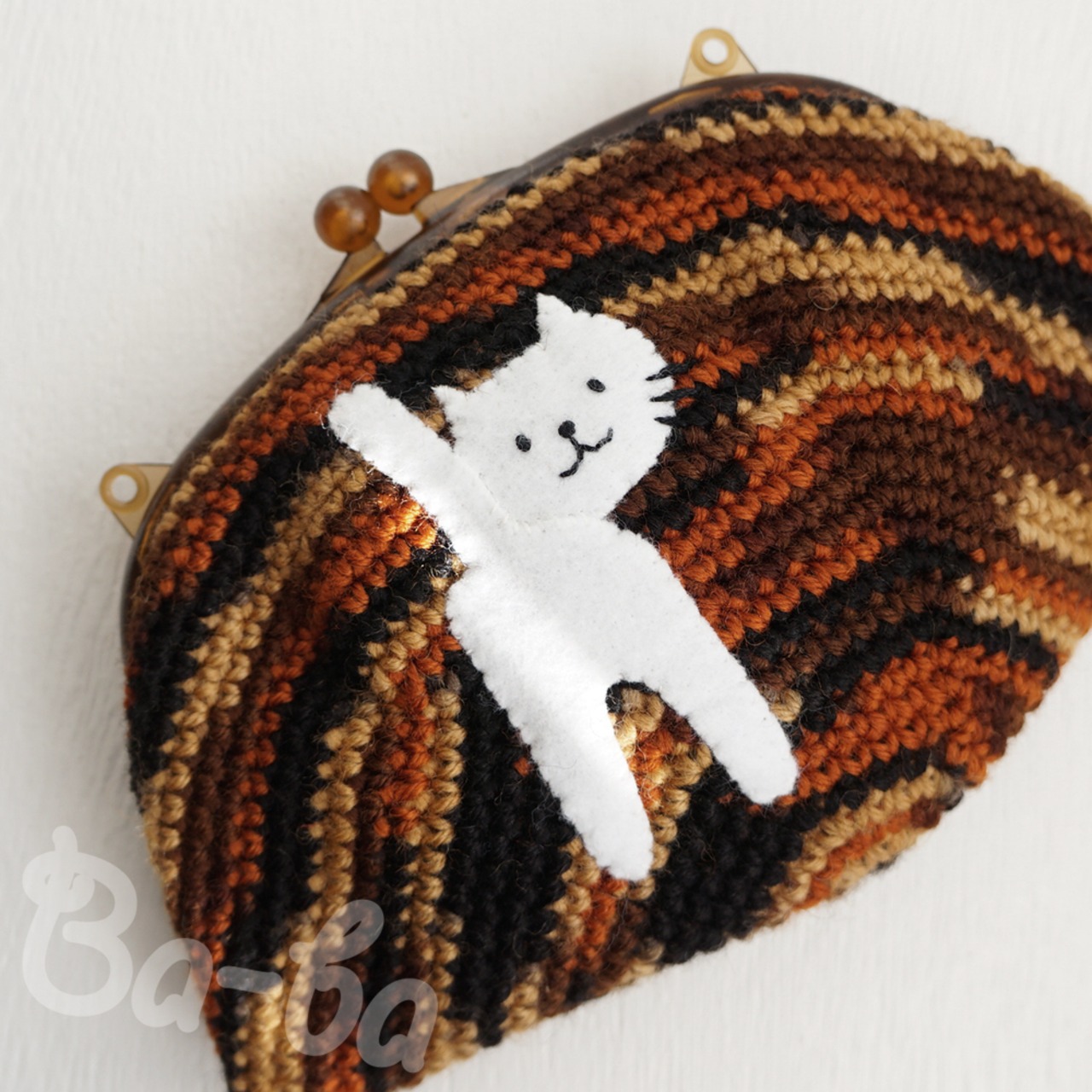 茶色グラデーション編み地のがま口に、ふりかえるシロのアップリケをしました。