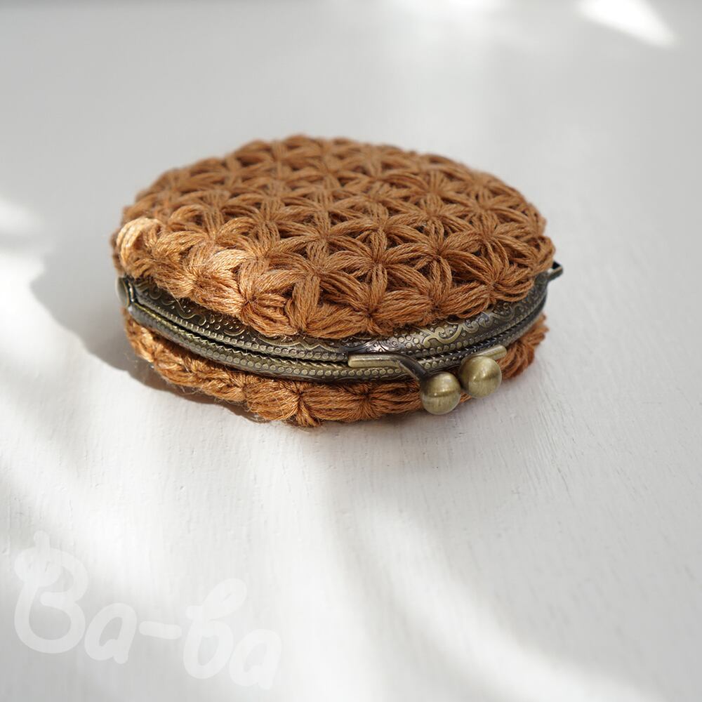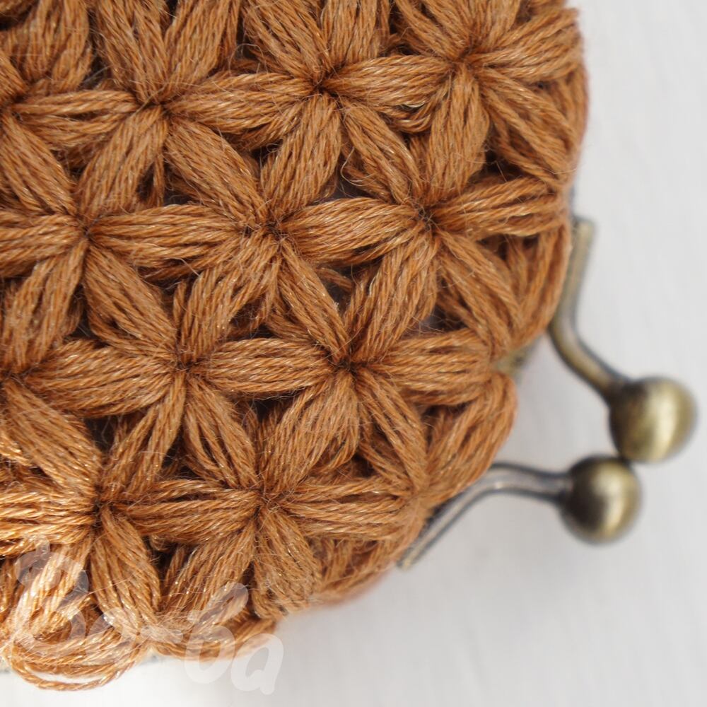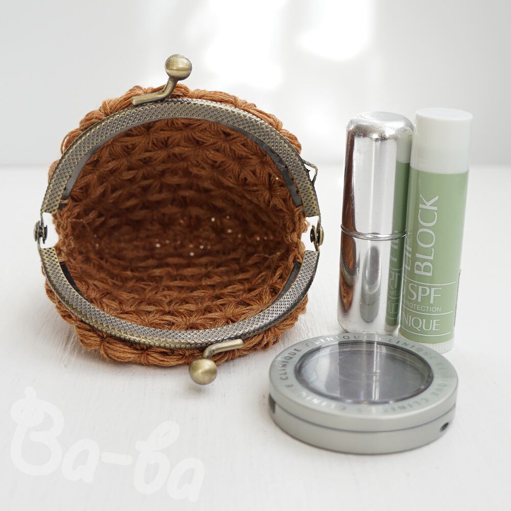 キャラメル色の麻混紡糸をふんわりと編み上げ、シンプルな口金と組み合わせました。