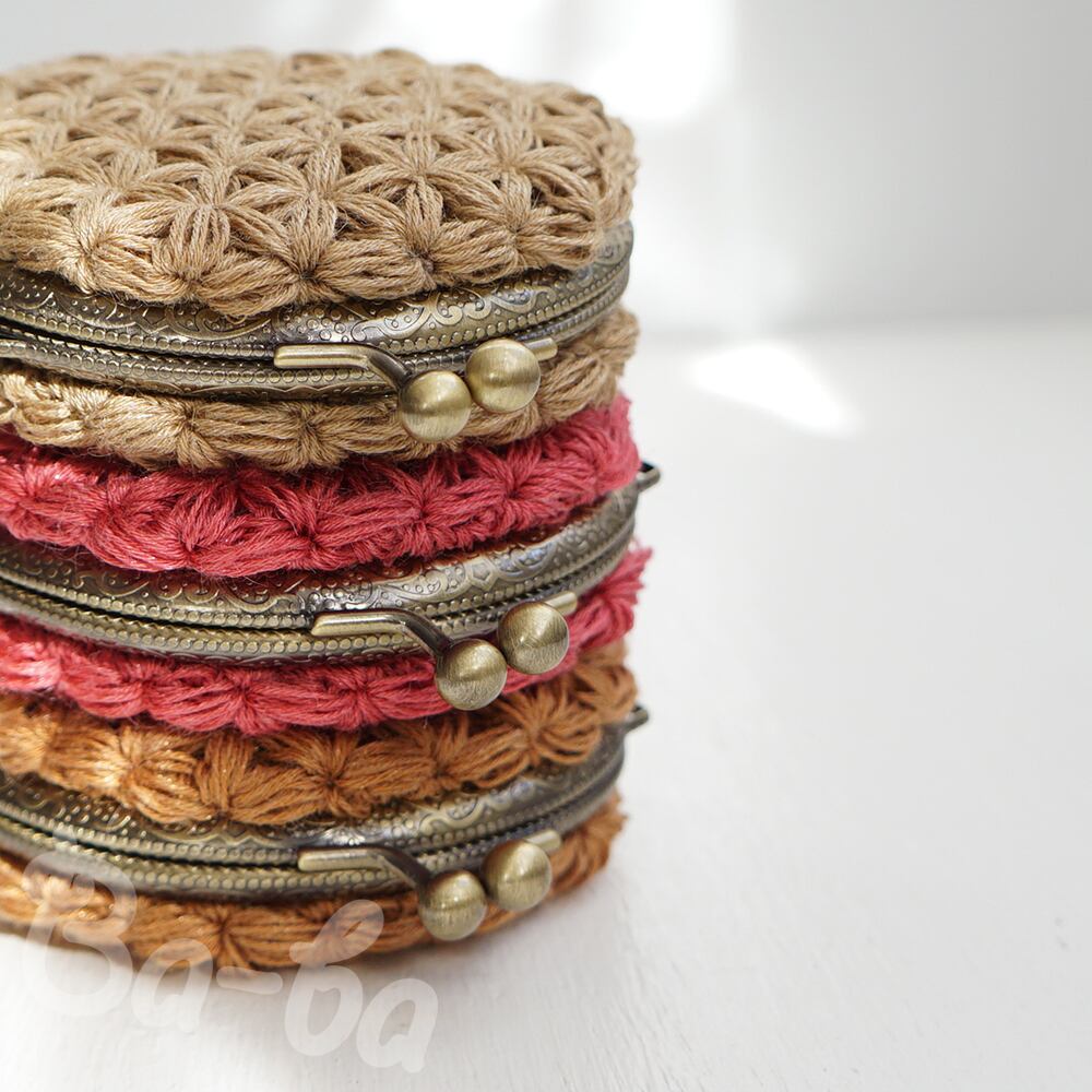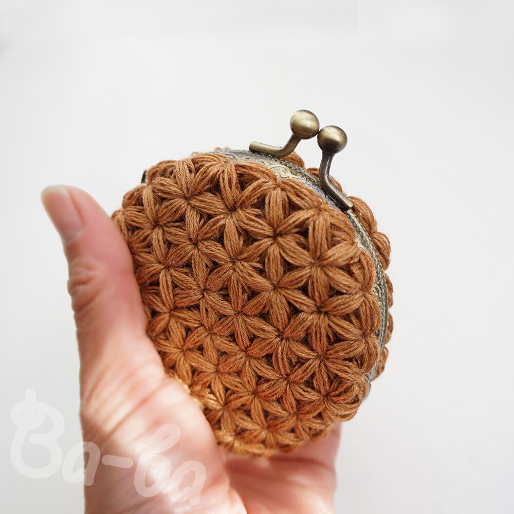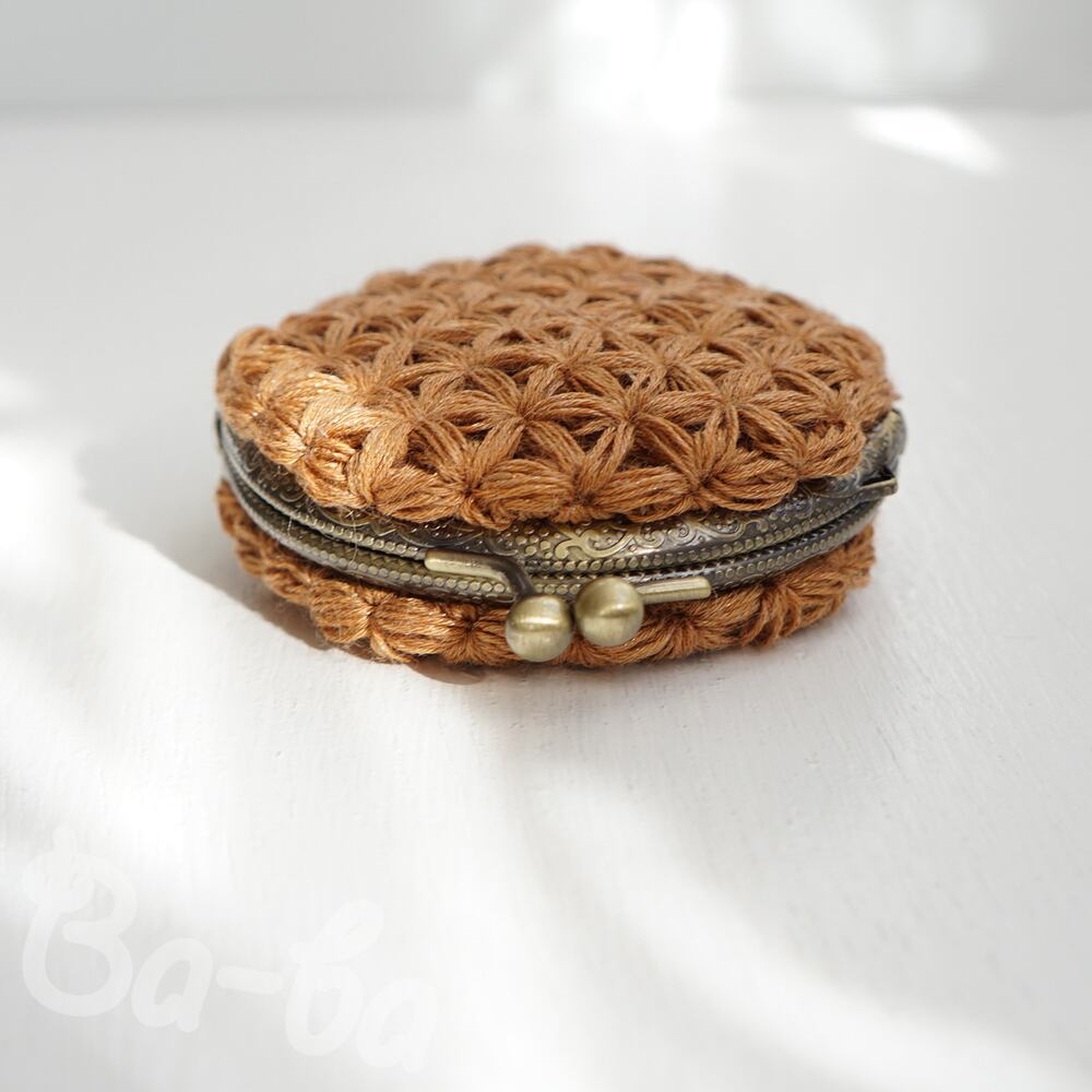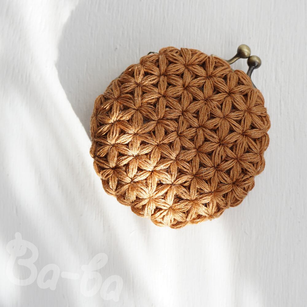キャラメル色の麻混紡糸をふんわりと編み上げ、シンプルな口金と組み合わせました。
