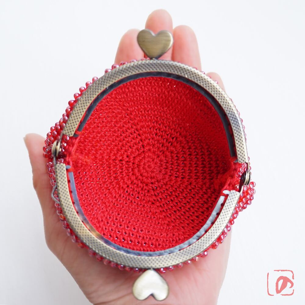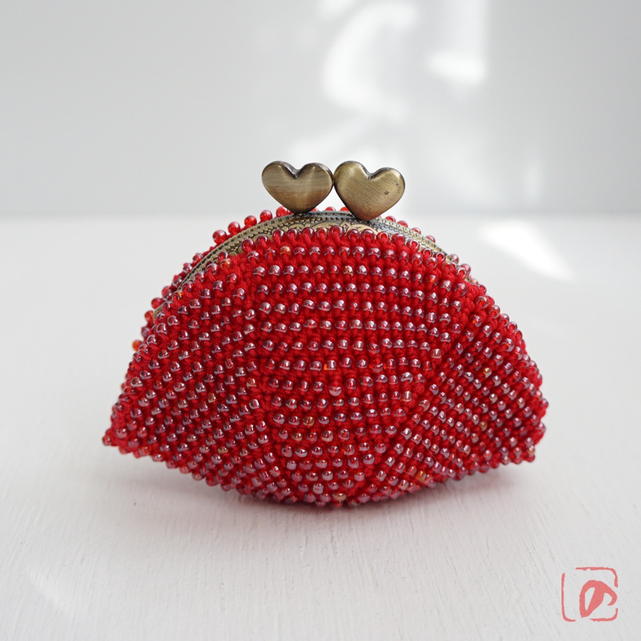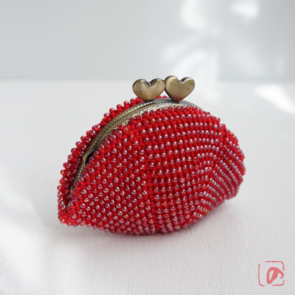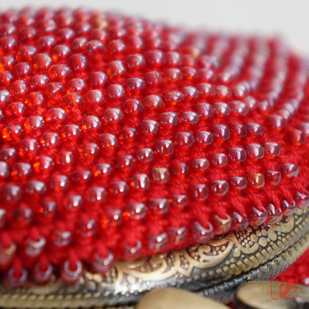 糸とビーズの色を揃えた、真っ赤ながま口です。