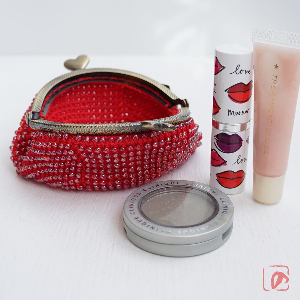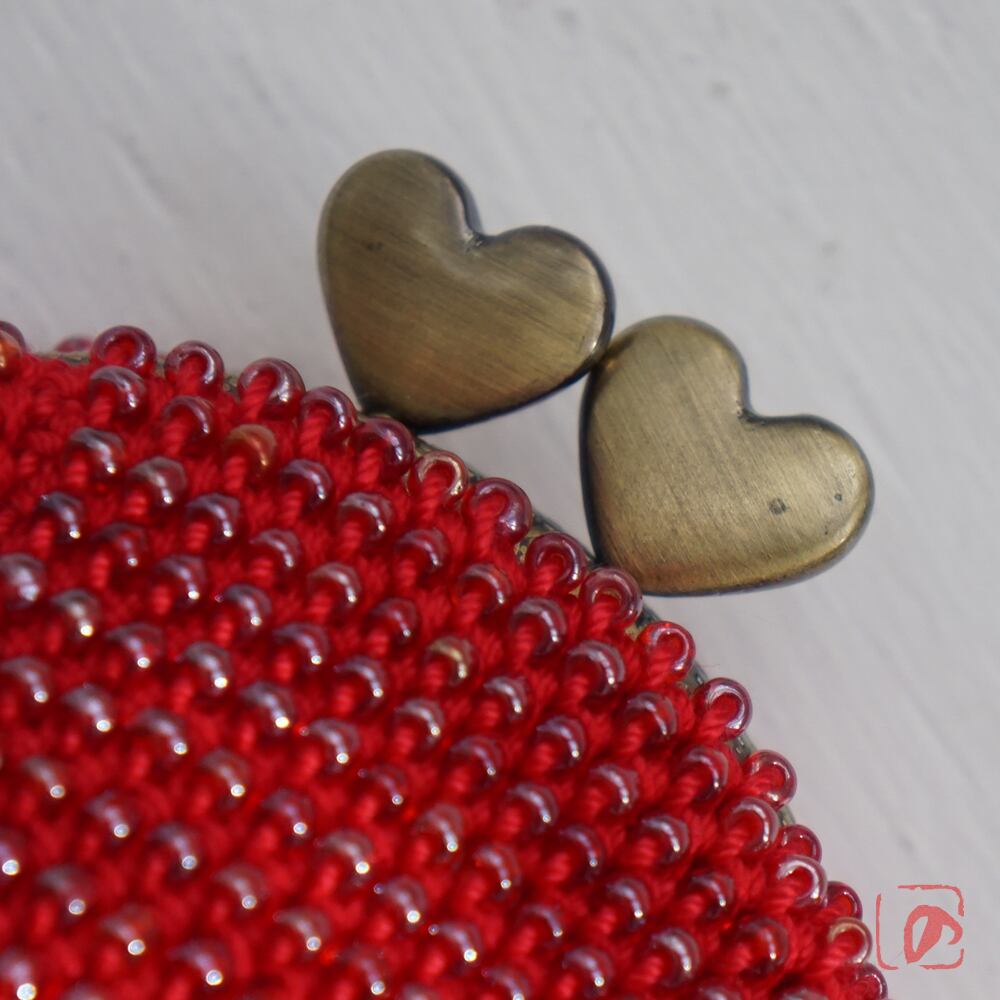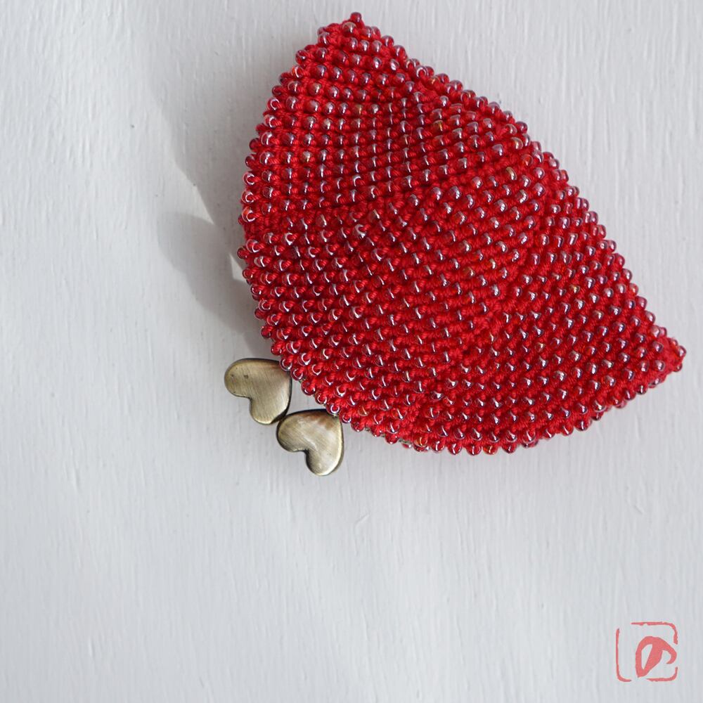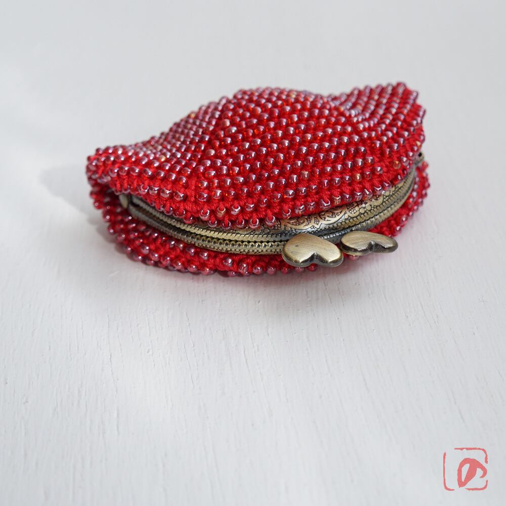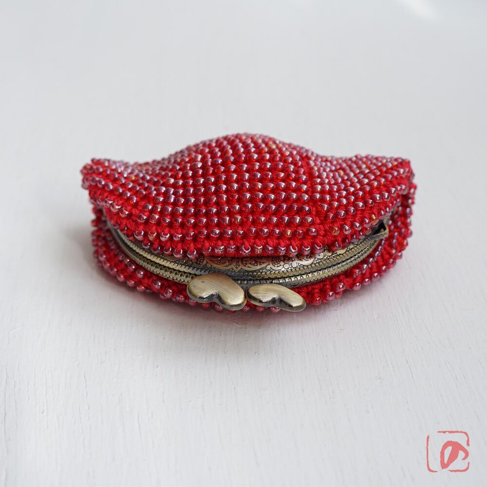 糸とビーズの色を揃えた、真っ赤ながま口です。