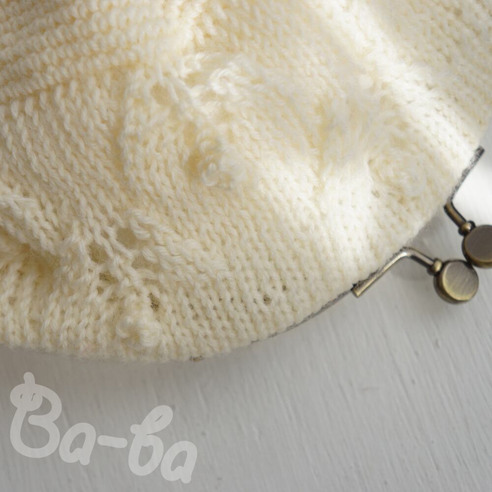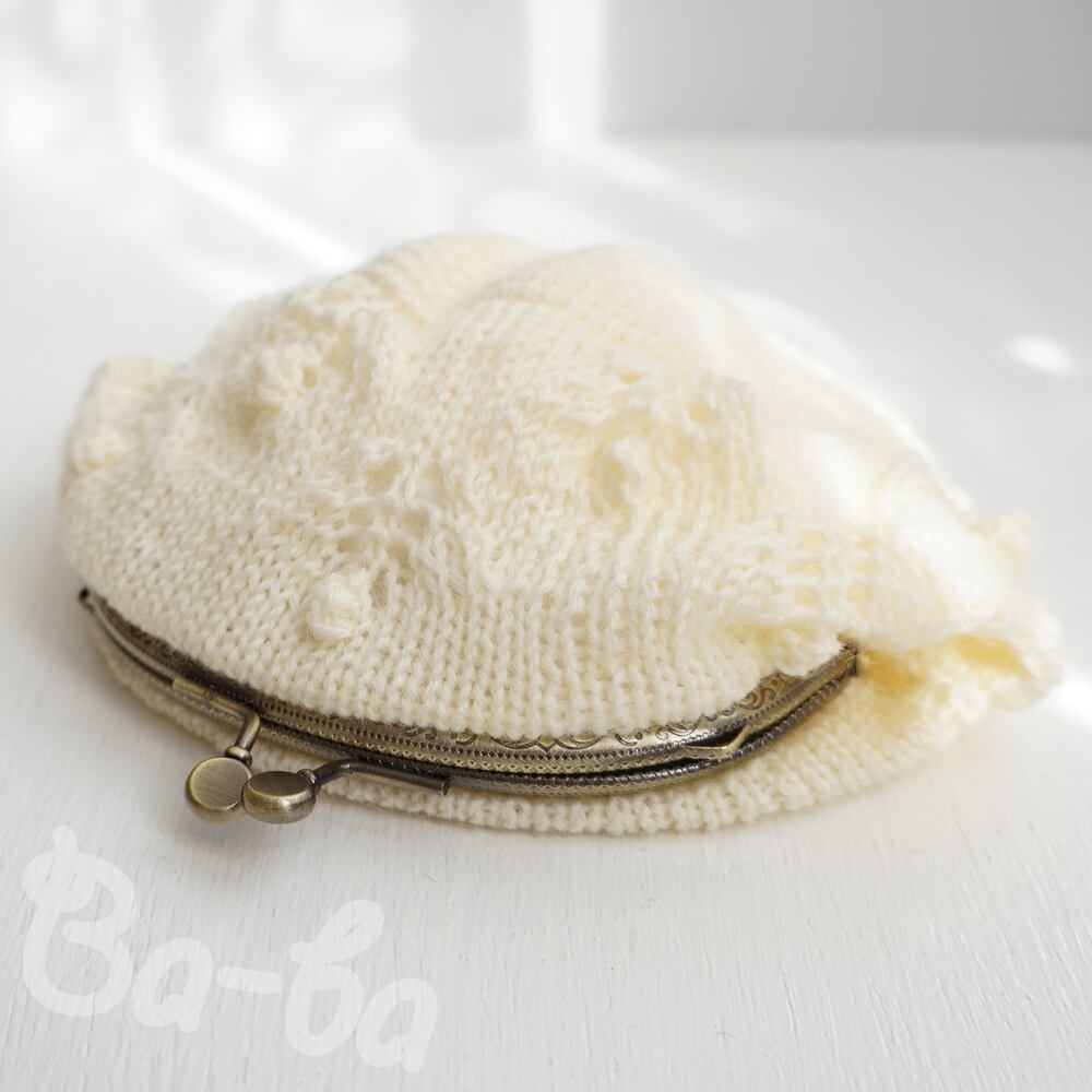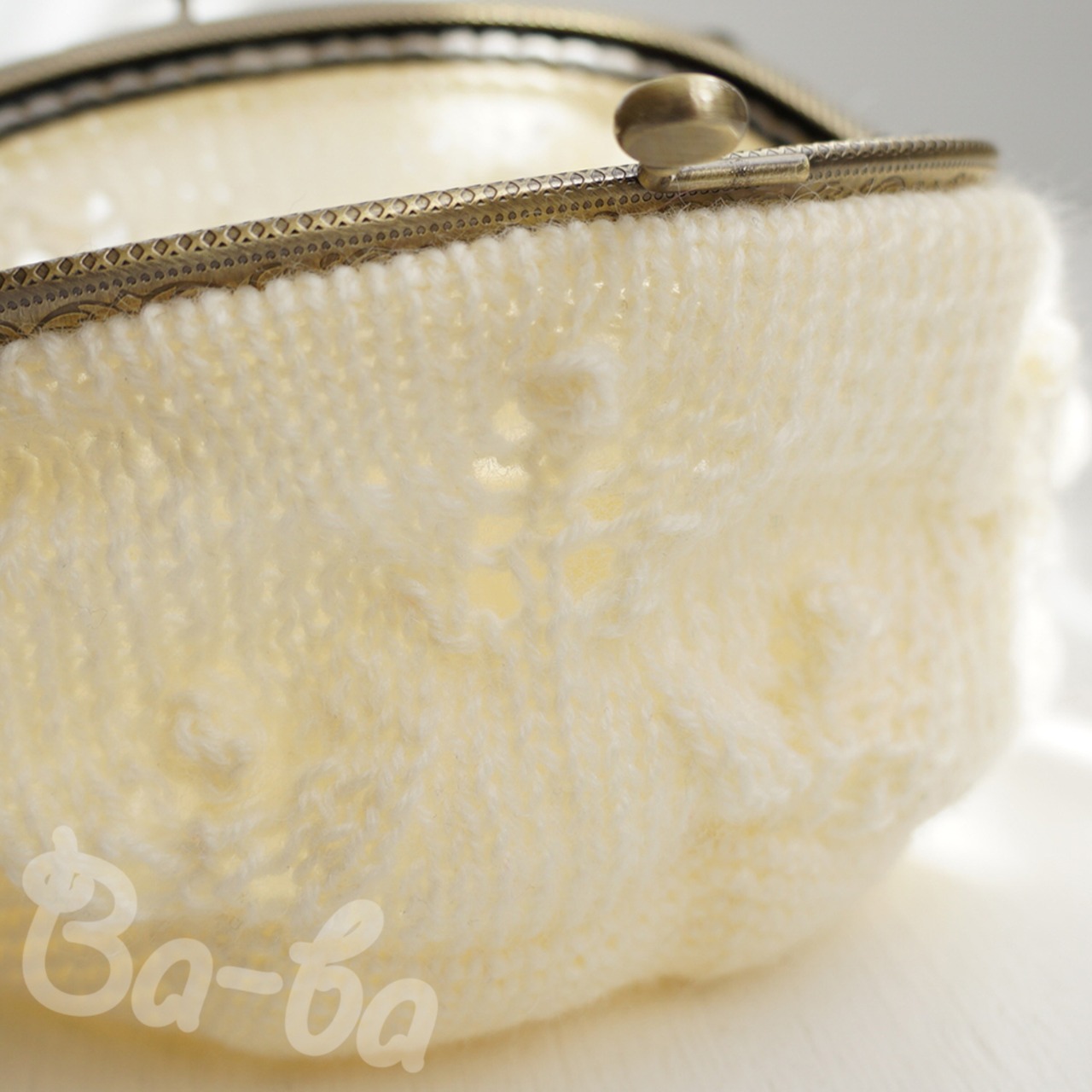 ミルク色の暖かな毛糸を模様編みで編み上げ、がま口に仕上げました。