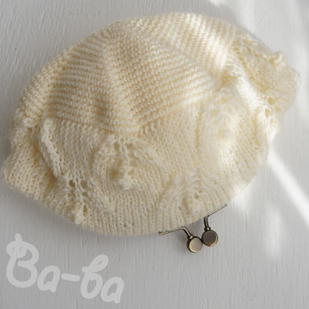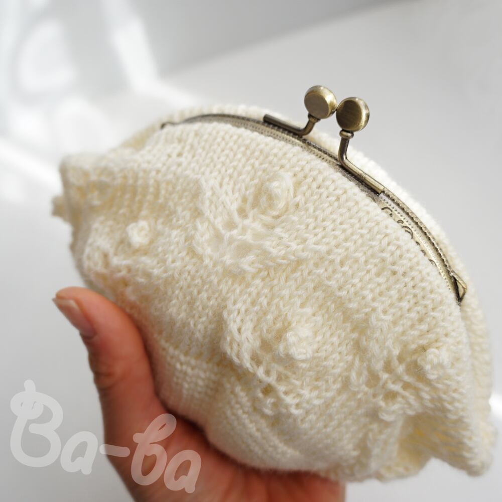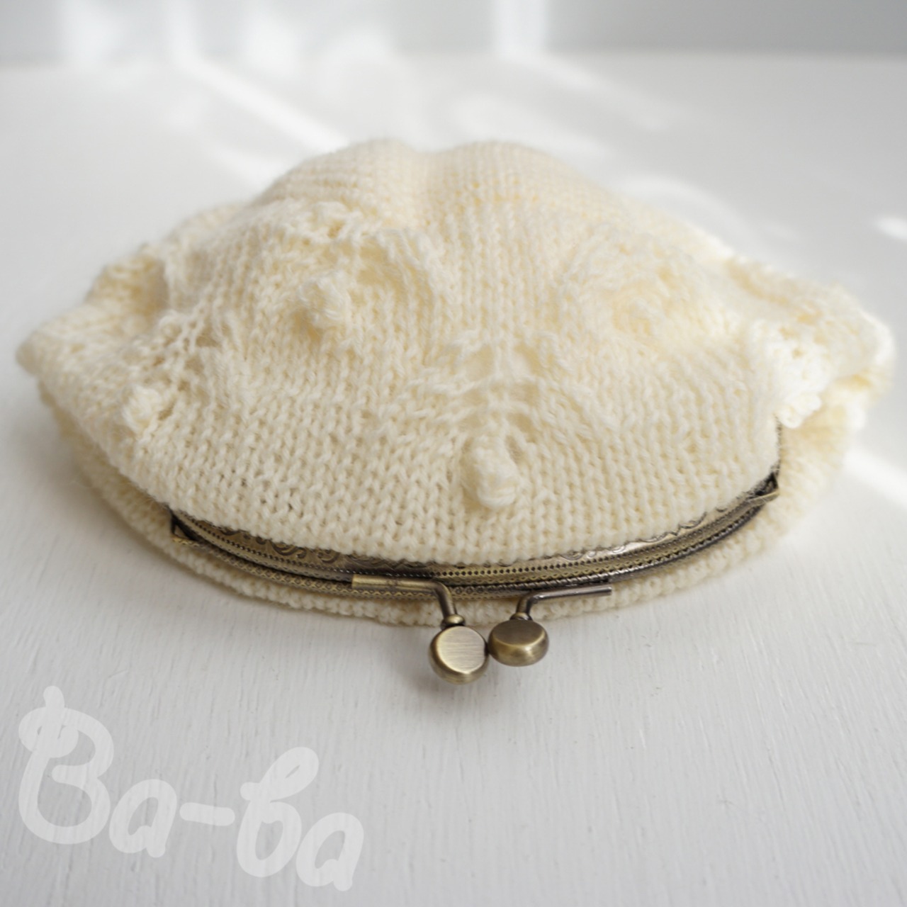 ミルク色の暖かな毛糸を模様編みで編み上げ、がま口に仕上げました。