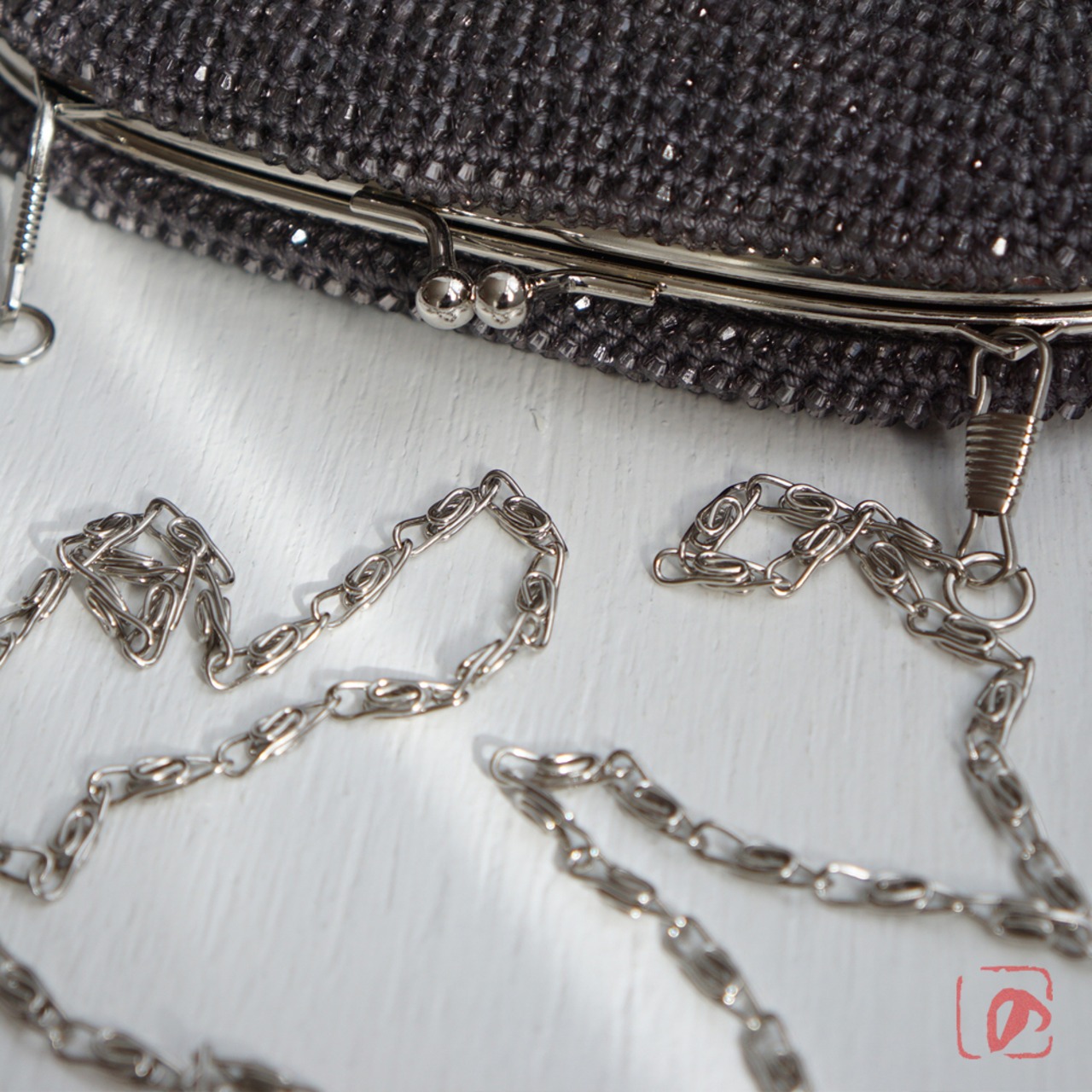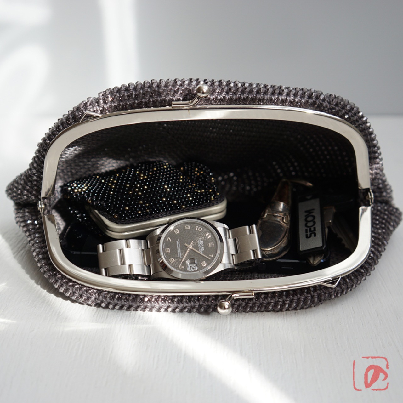 幅15cmくし型の口金を使用、大きめのポーチとして、またオプションのチェーン等でアレンジ
