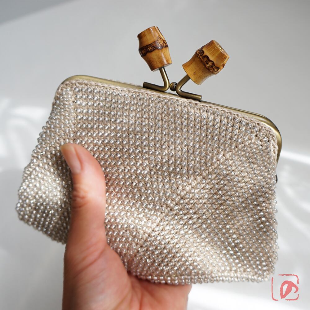 ばあば作☆☆さらに大きめ・ガラスビーズのスクエアがま口(natural・1561)