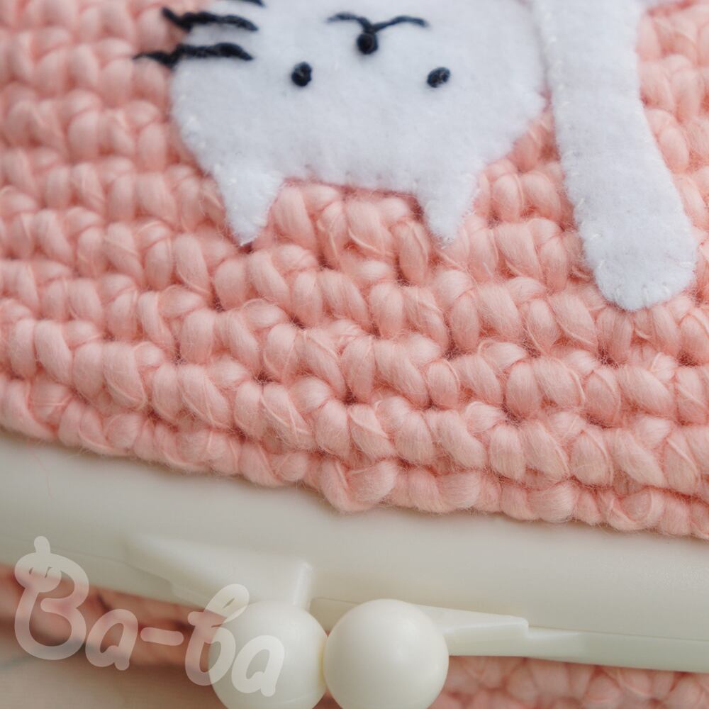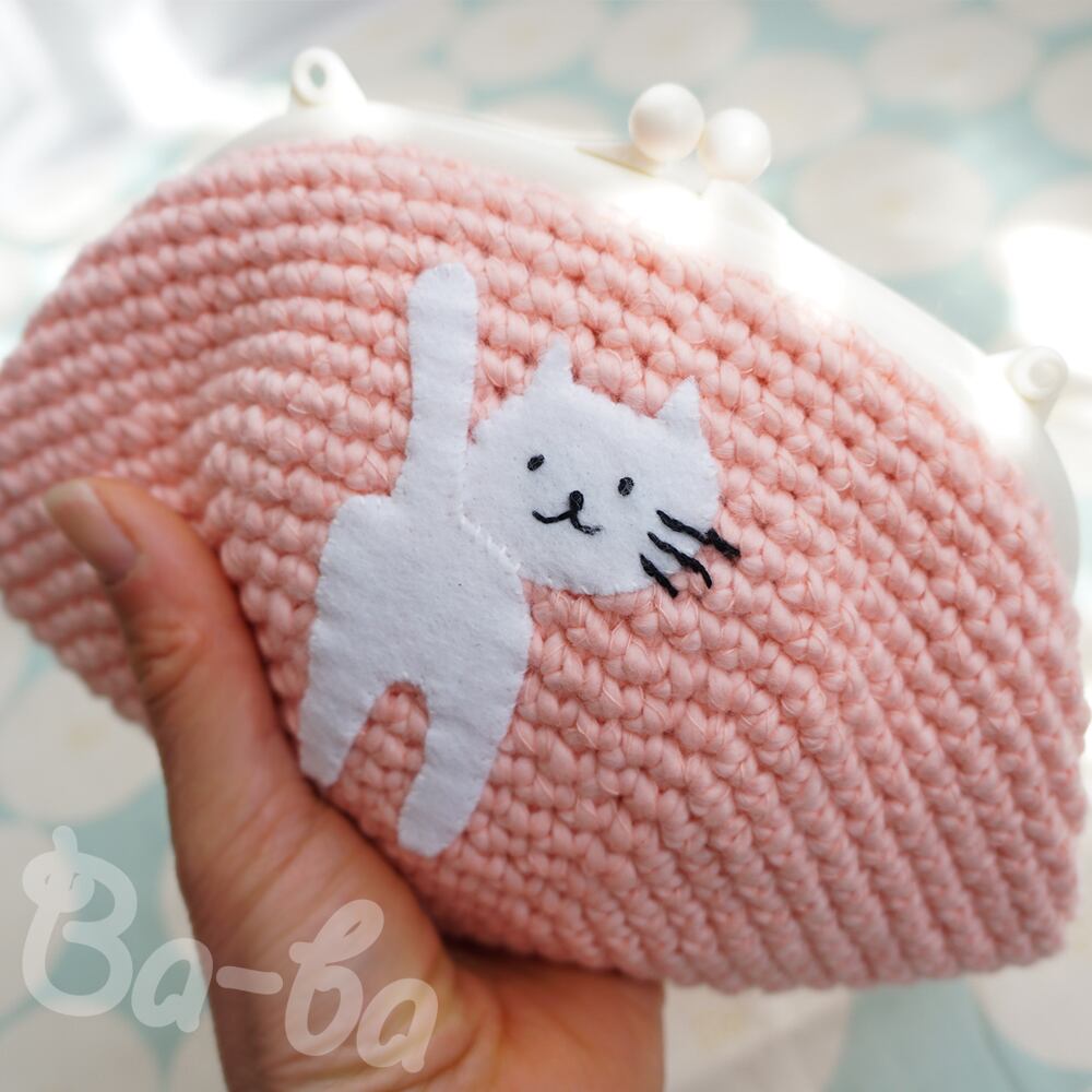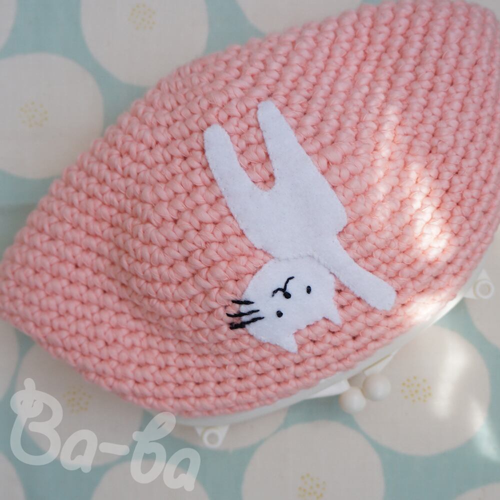 ピンク色コットンの編み地のがま口に、ふりかえるシロのアップリケをしました。
