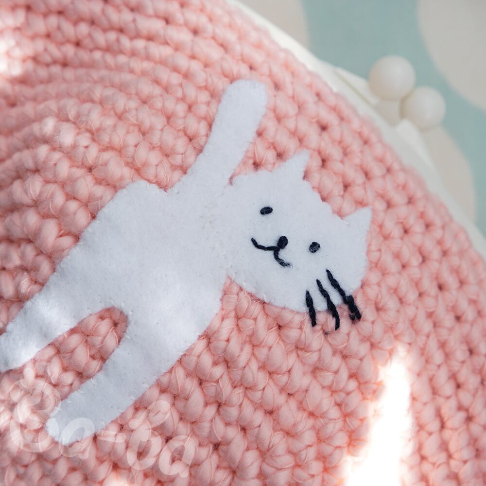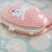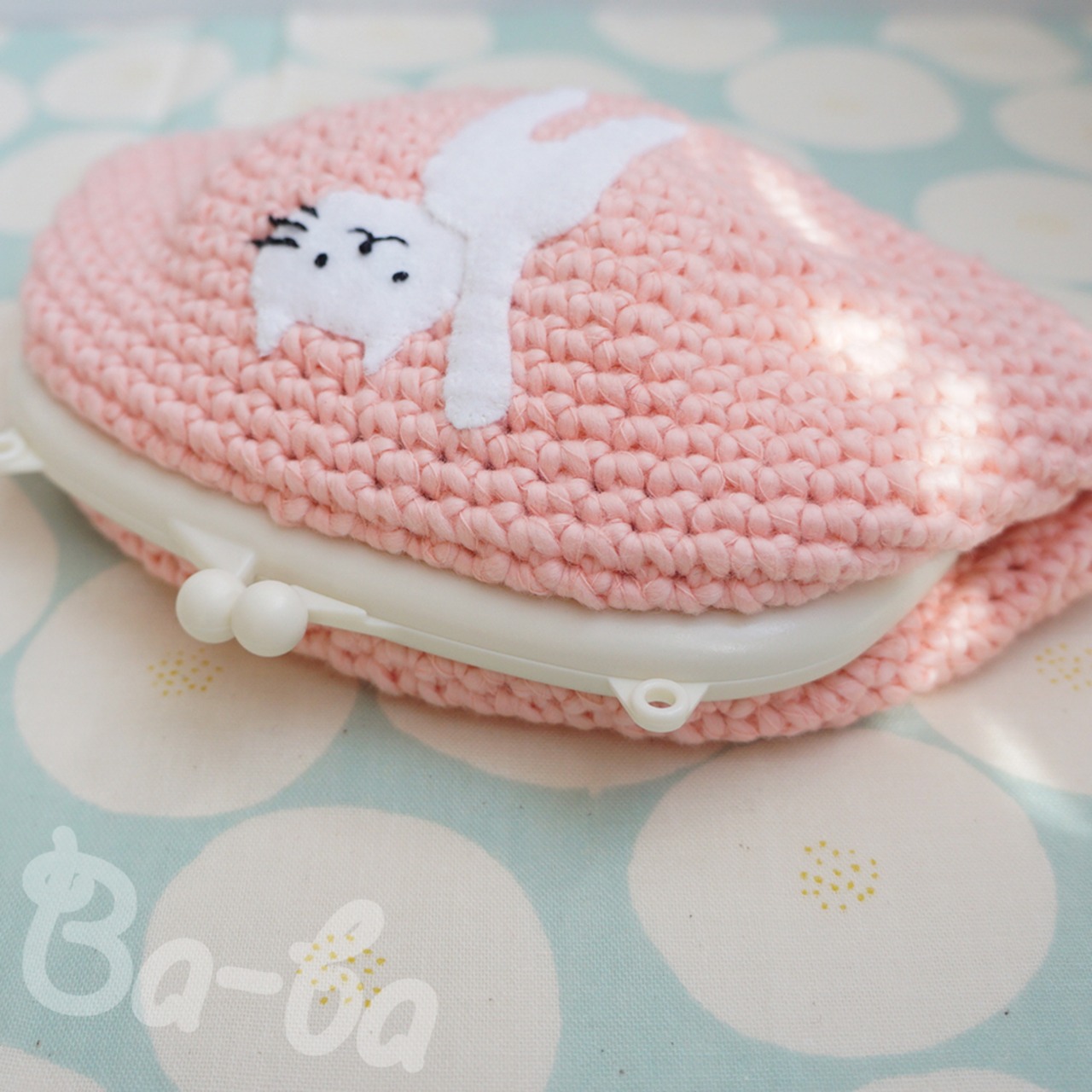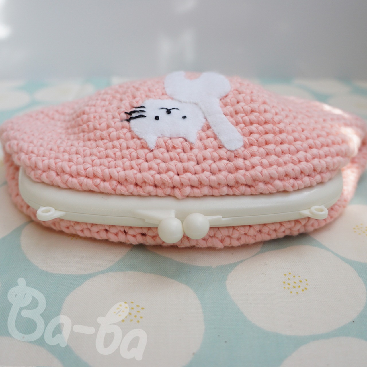 ピンク色コットンの編み地のがま口に、ふりかえるシロのアップリケをしました。