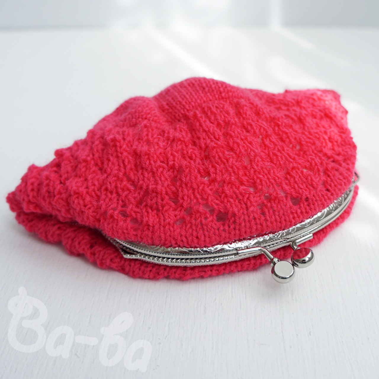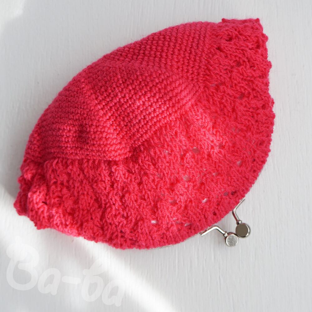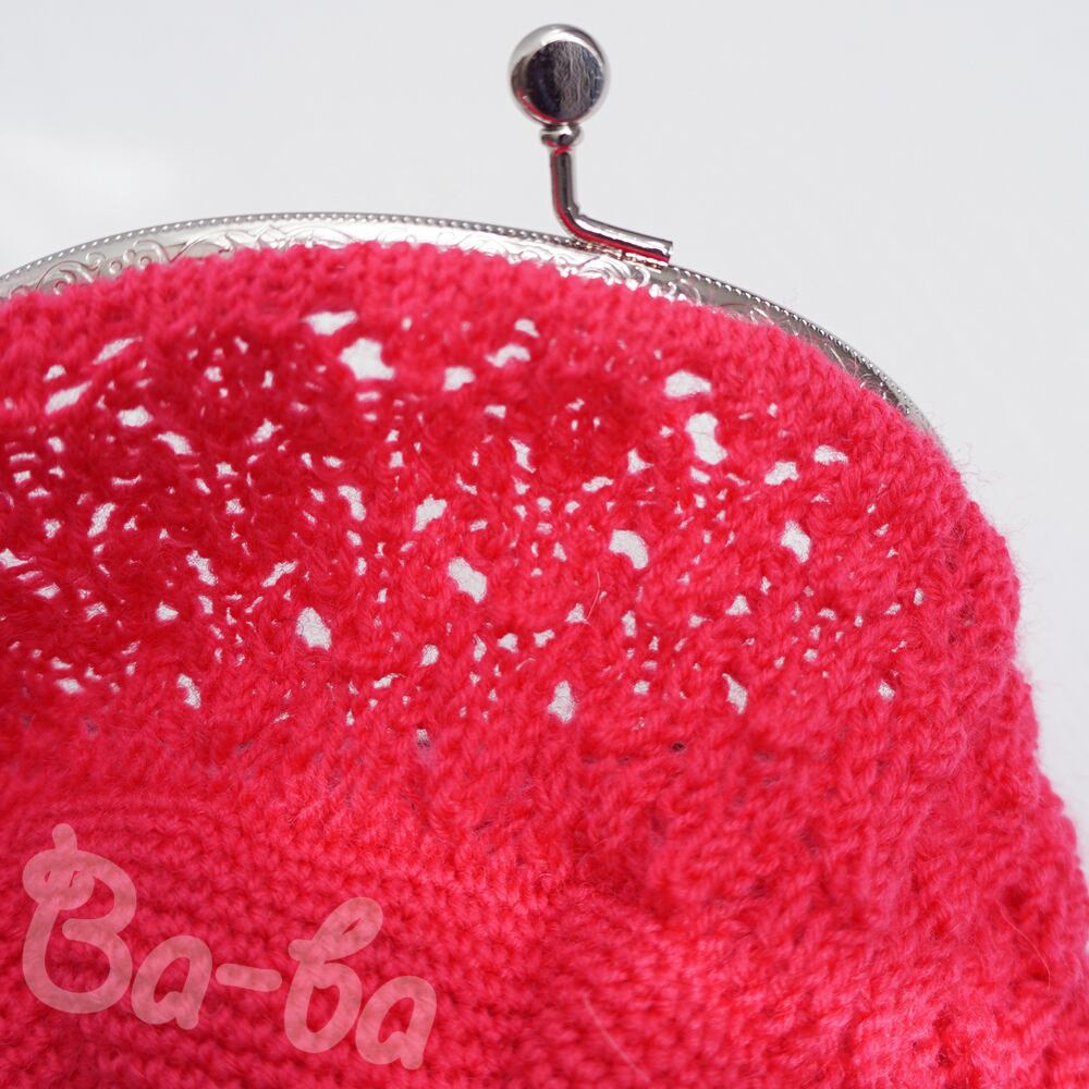 鮮やかなピンク色の毛糸を模様編みで編み上げ、がま口に仕上げました。