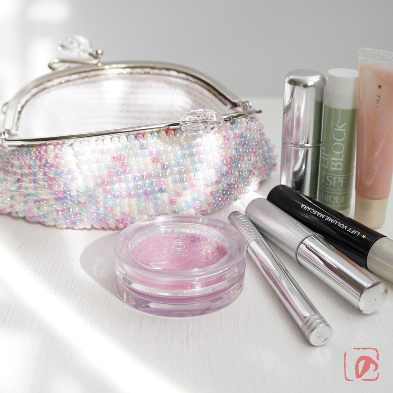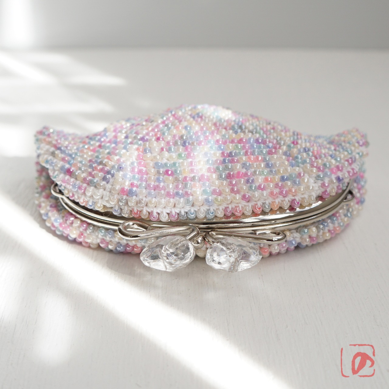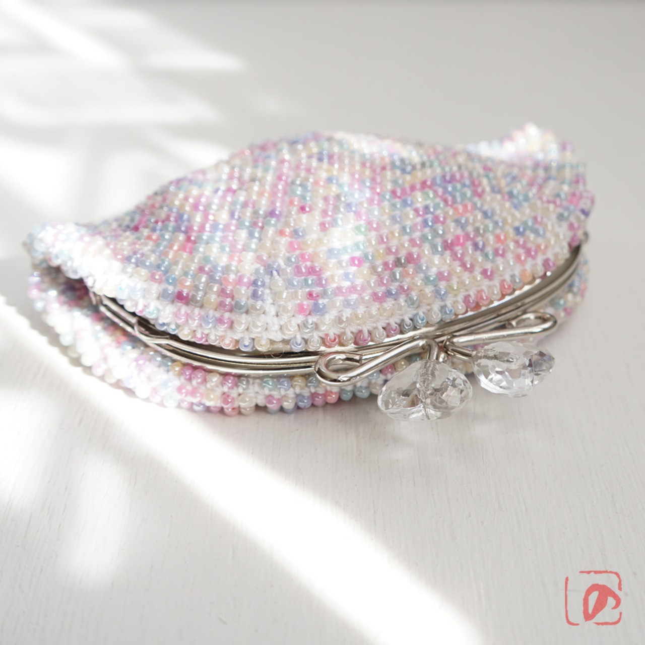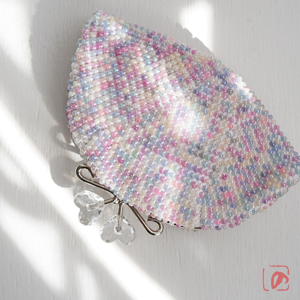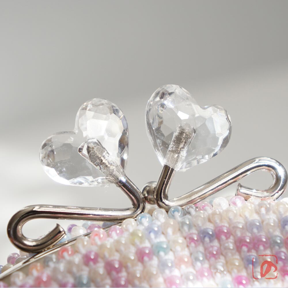 パステルカラーミックスビーズの編み地に、クリアハートのつまみで可愛さをUP!しました。