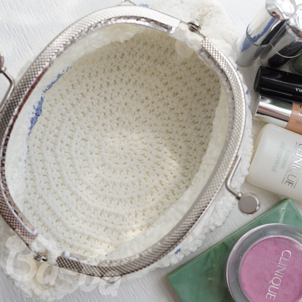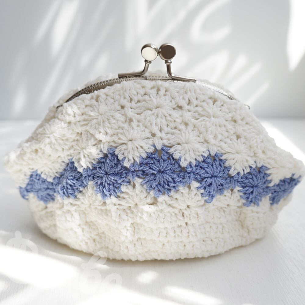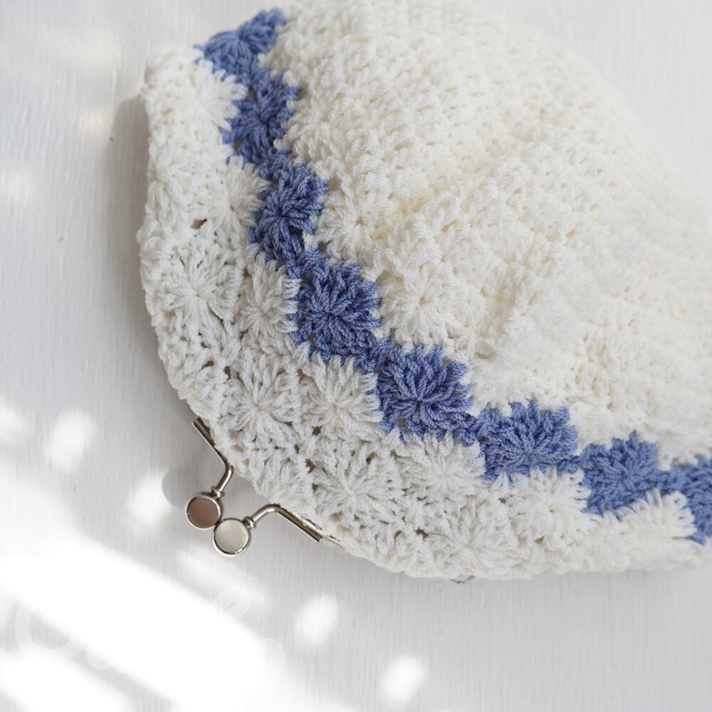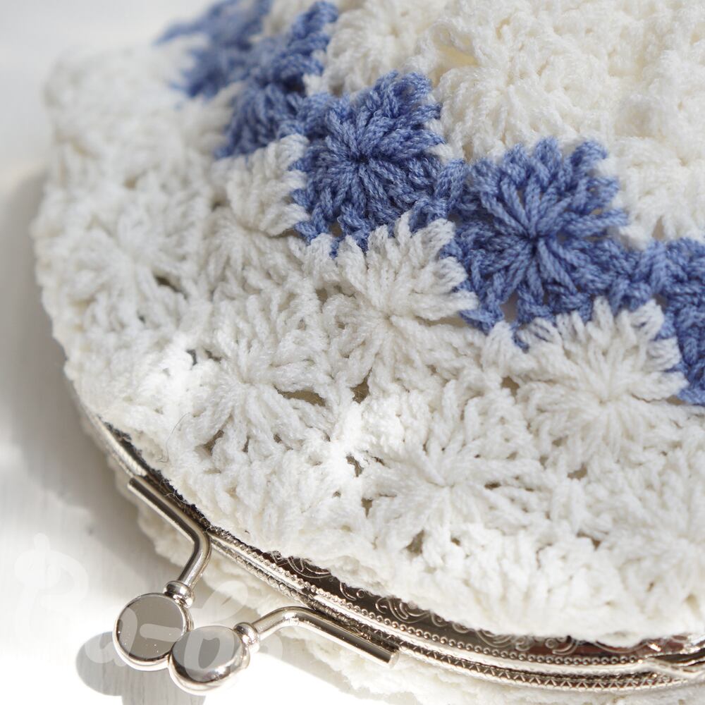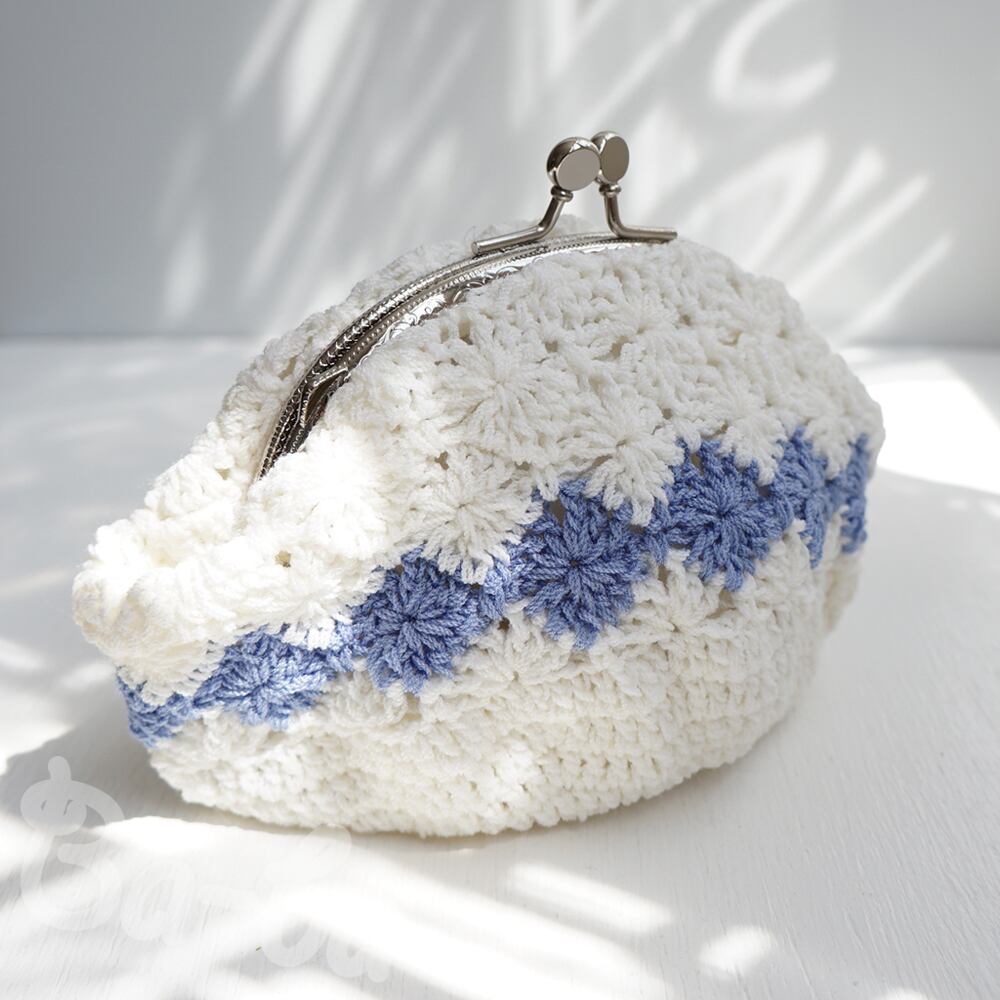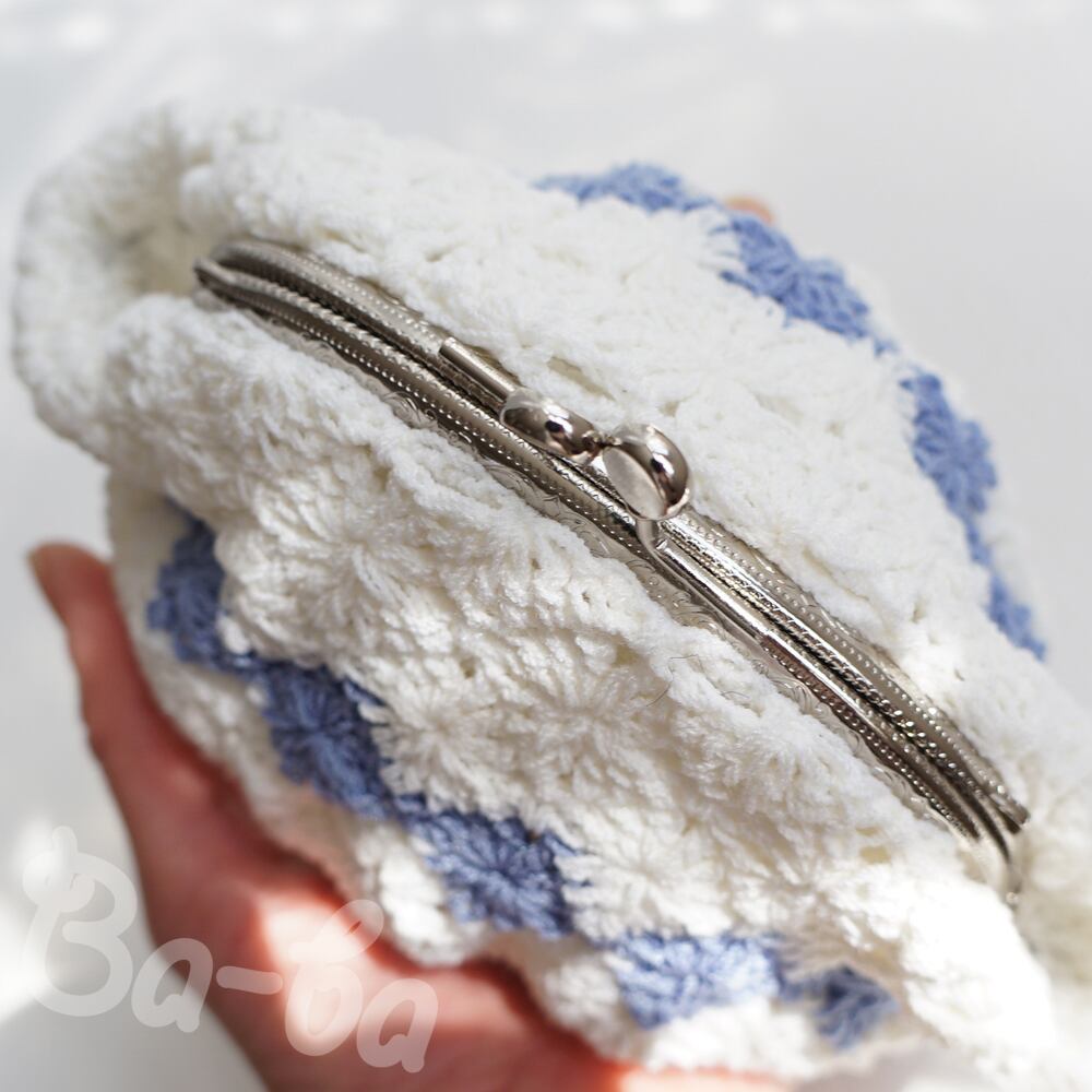 爽やかなホワイトとラベンダー色のサマーヤーンを、ハーレクインステッチという模様で編み上げ、がま口に仕上げました。