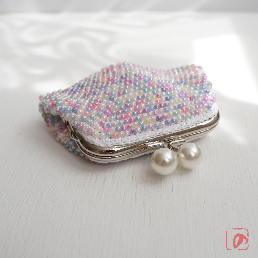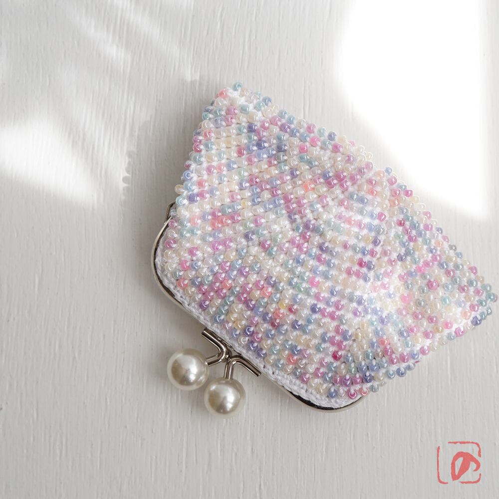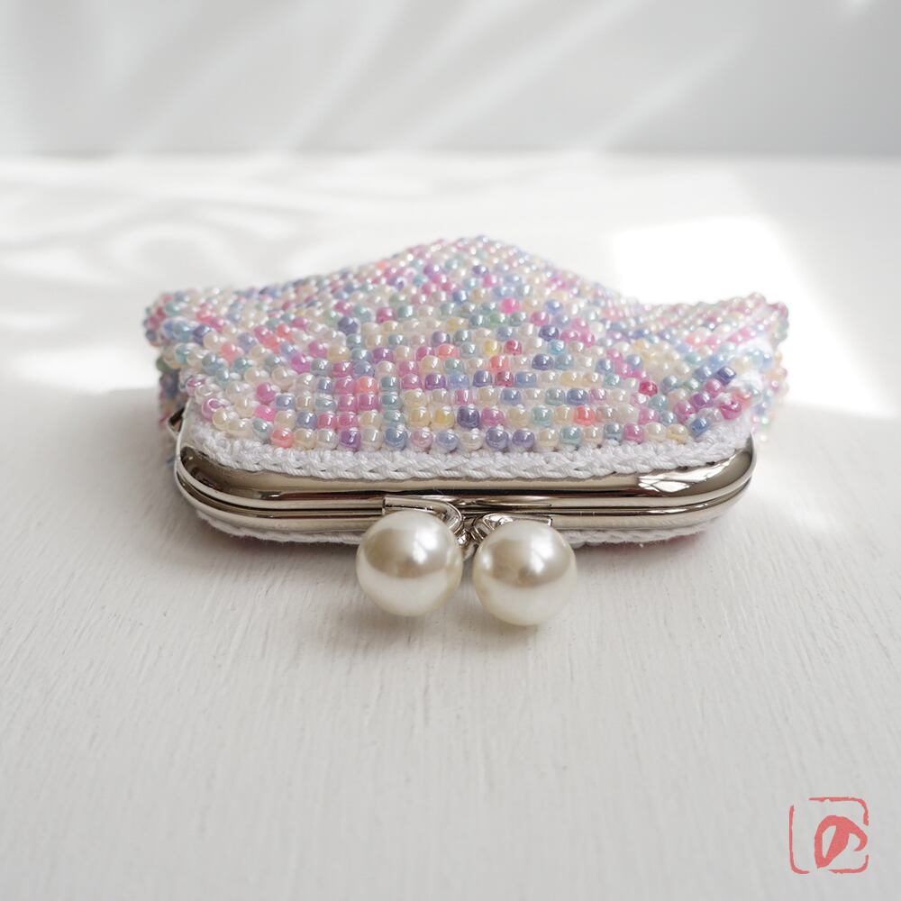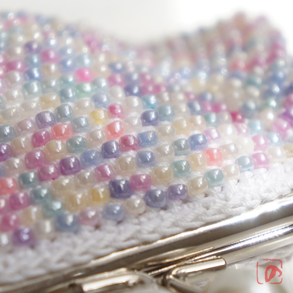 白い糸にパステルカラーのビーズを合わせ、さり気なく輝くパールつまみと