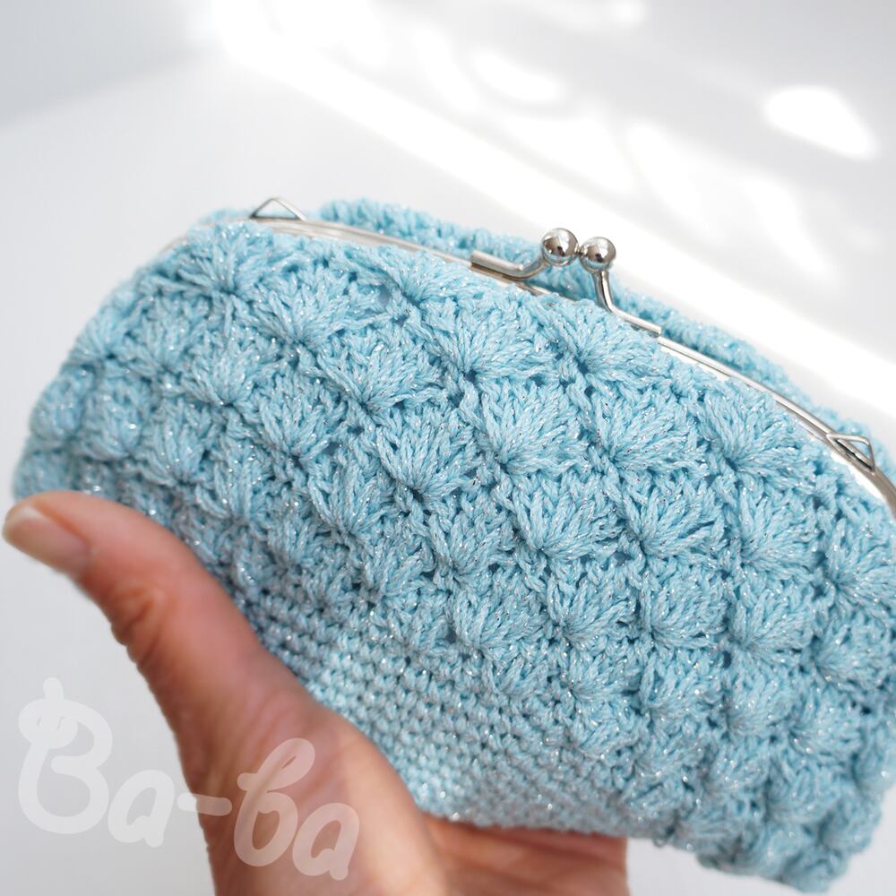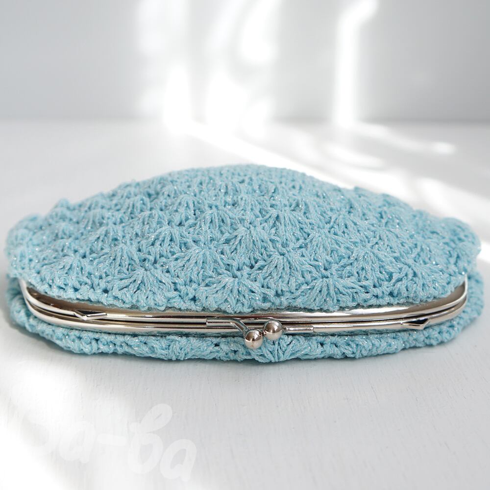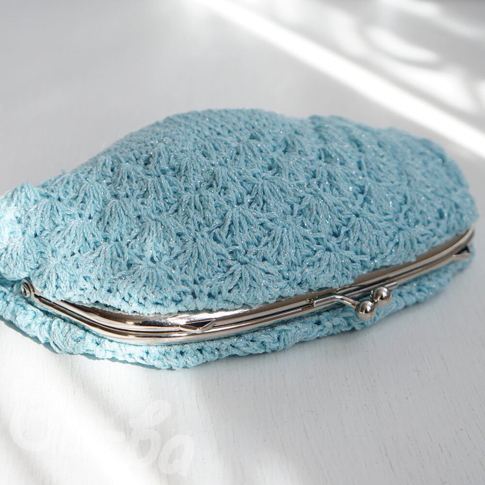 銀色ラメ入りのサマーヤーンを松編みで編み上げ、シンプルな口金を合わせました。