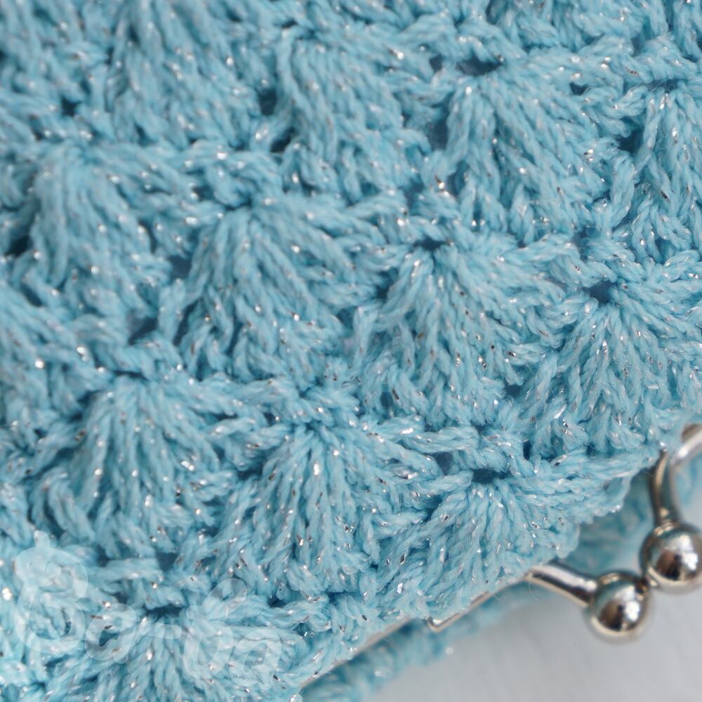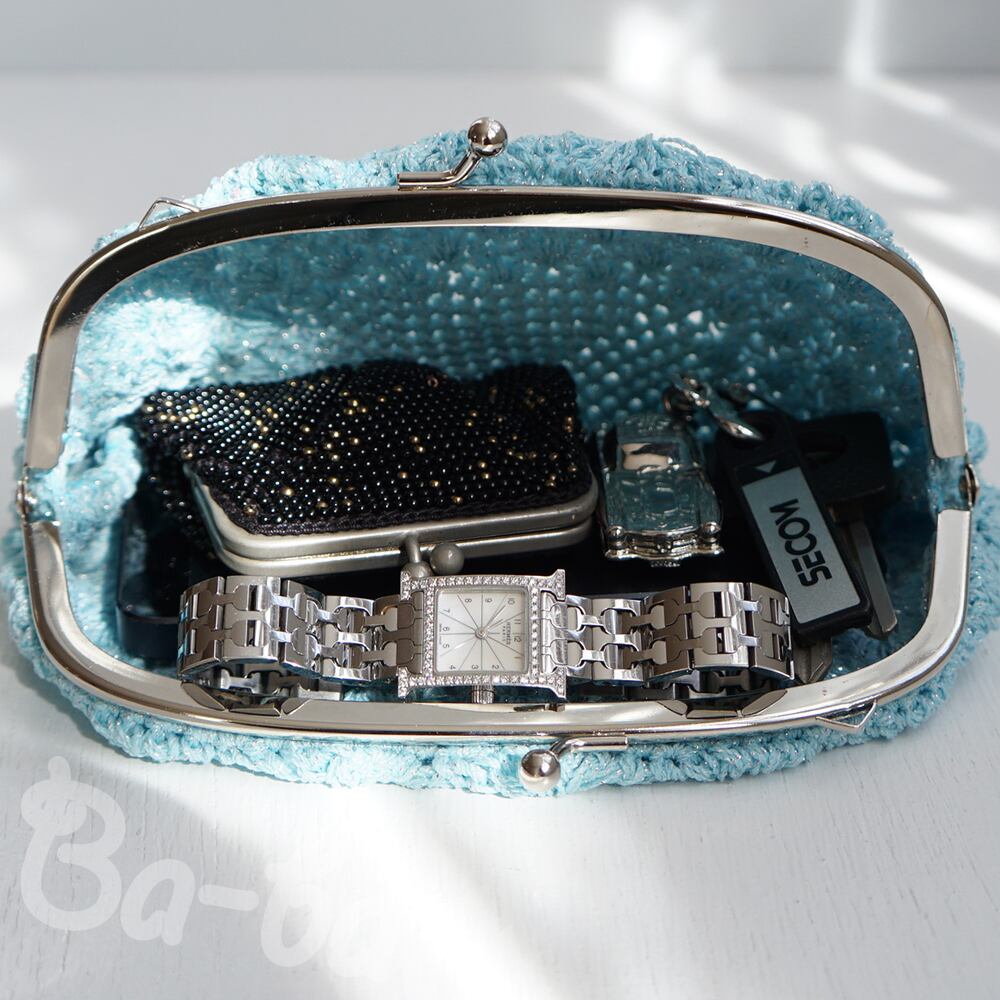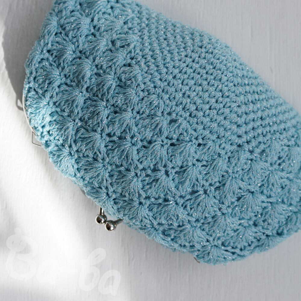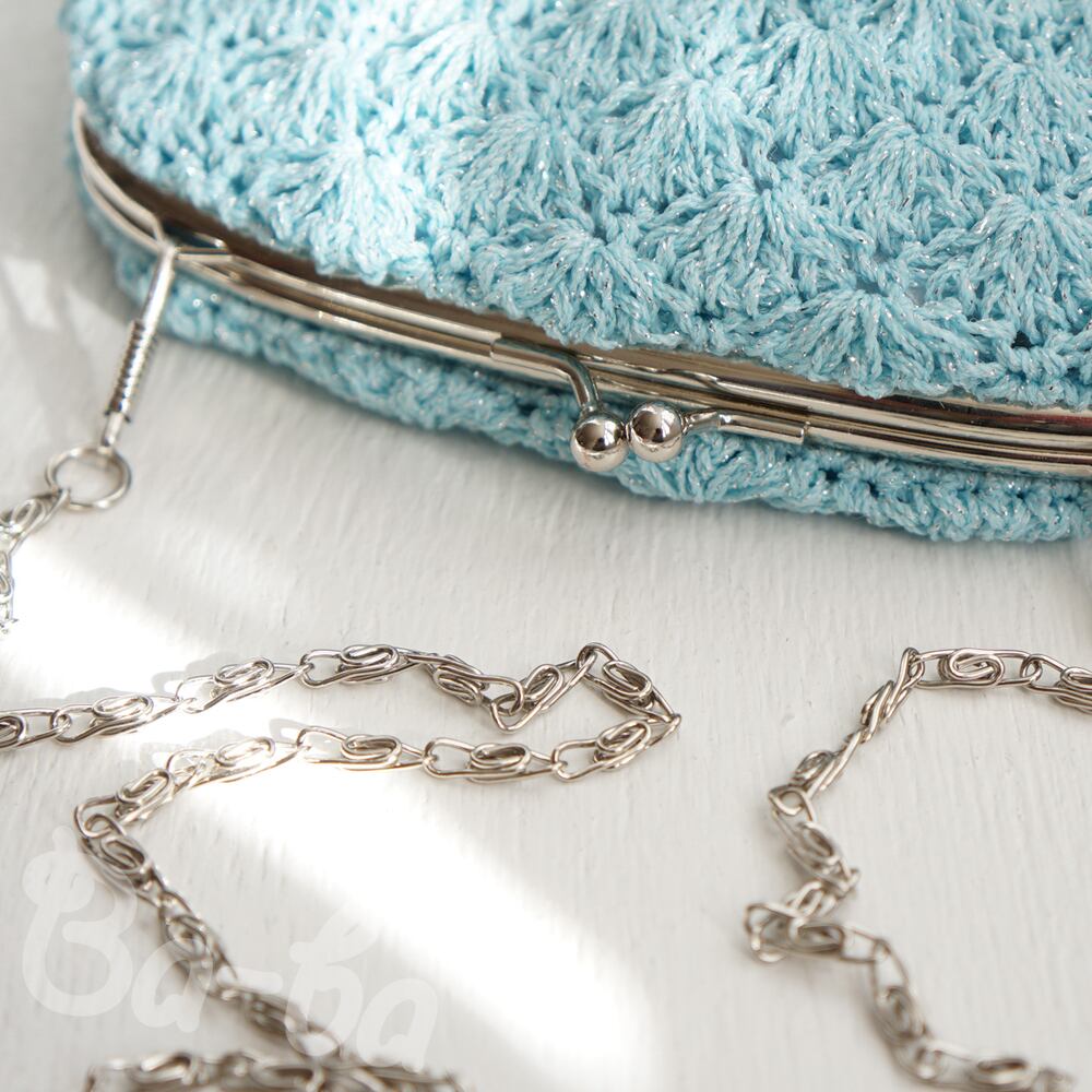 銀色ラメ入りのサマーヤーンを松編みで編み上げ、シンプルな口金を合わせました。