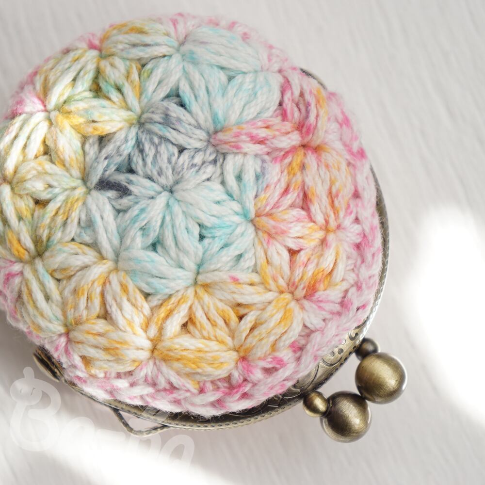 夏色パステルカラーのサマーヤーンで、ふんわりリフ編みのがま口を作りました。