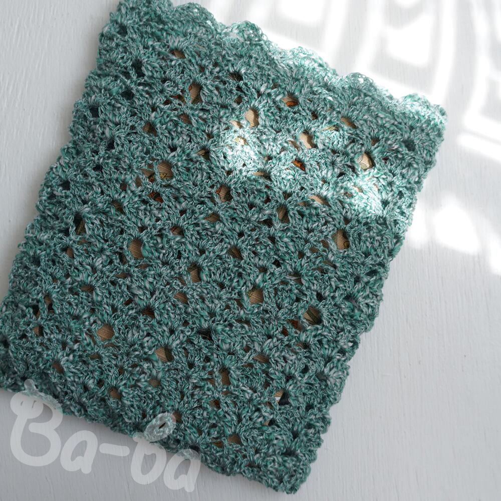 ネップ入り淡いグリーンの混紡サマーヤーンを、波模様のような透かし編みにしました。