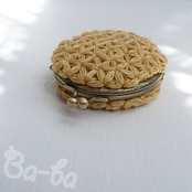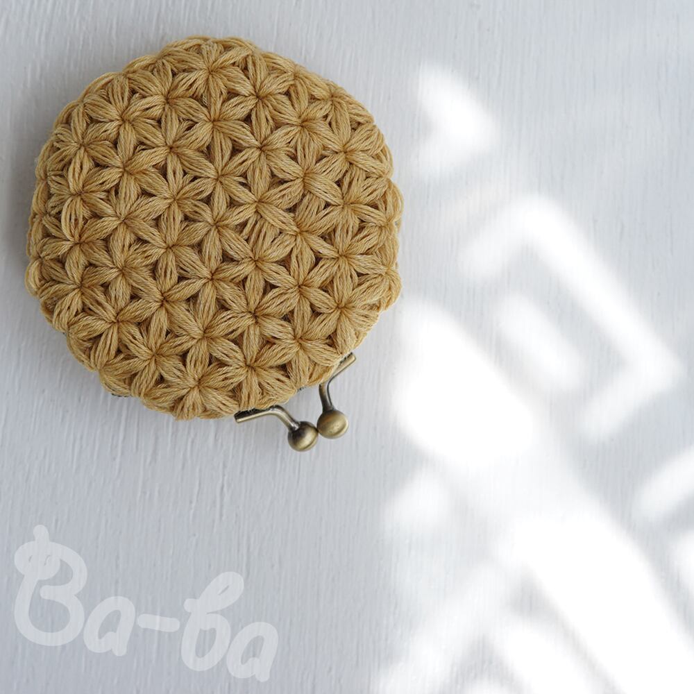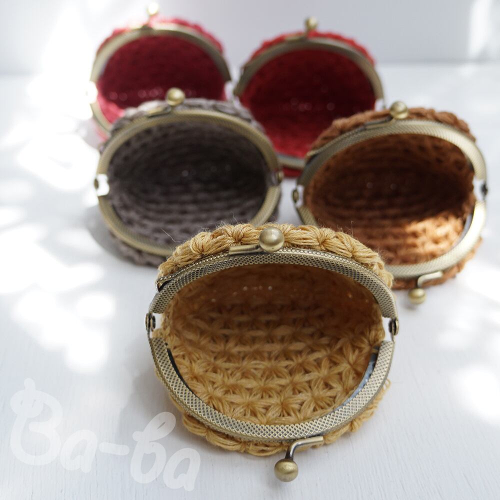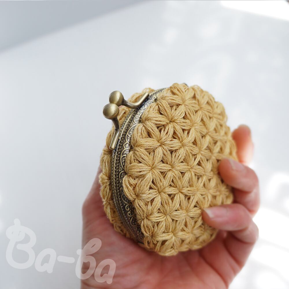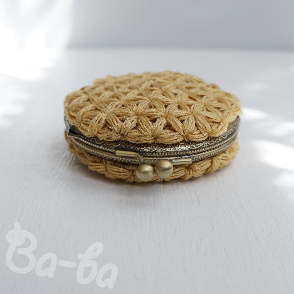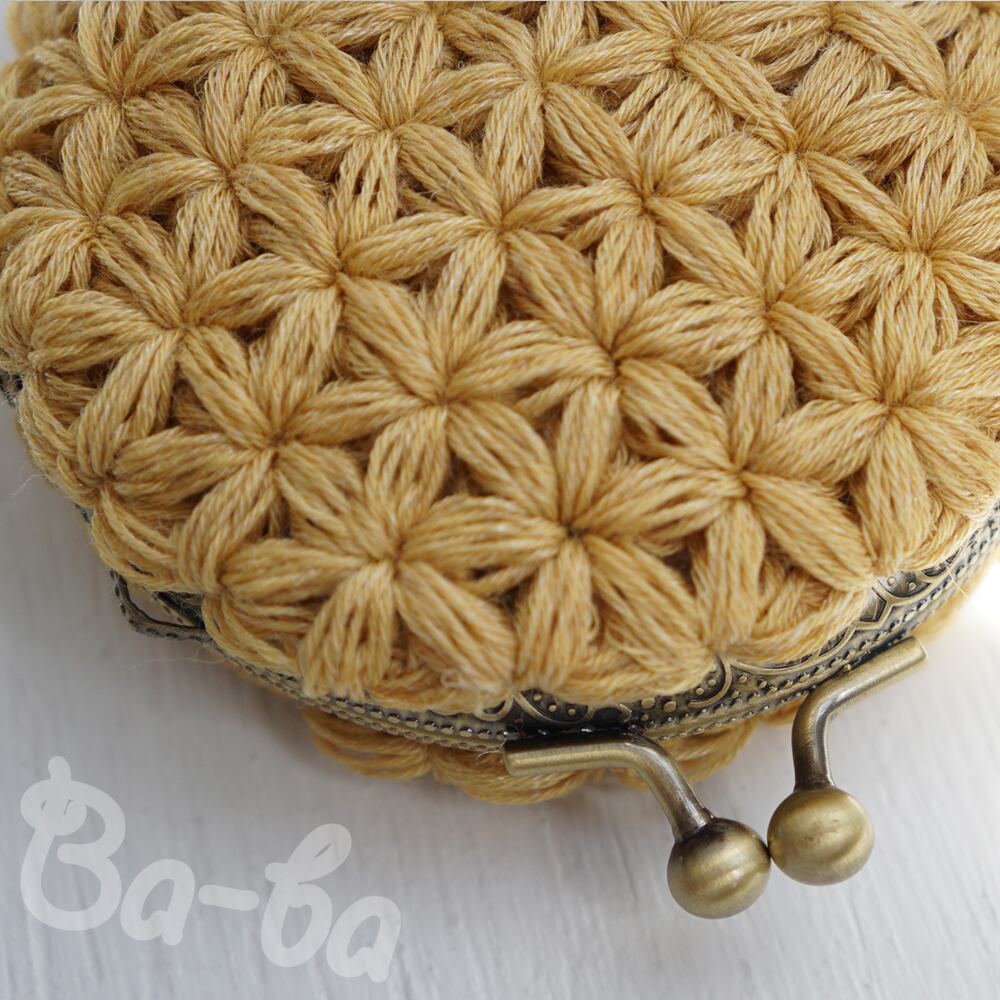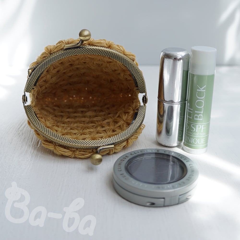 黄楊(つげ)色の麻混紡糸をふんわりと編み上げ、シンプルな口金と組み合わせました。