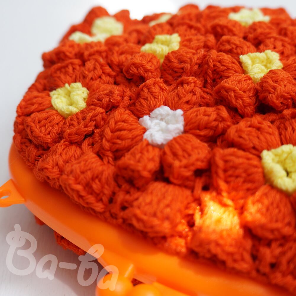 ポピーの花がぎっしり集まったような編み地は、ふんわりとした手触りです。