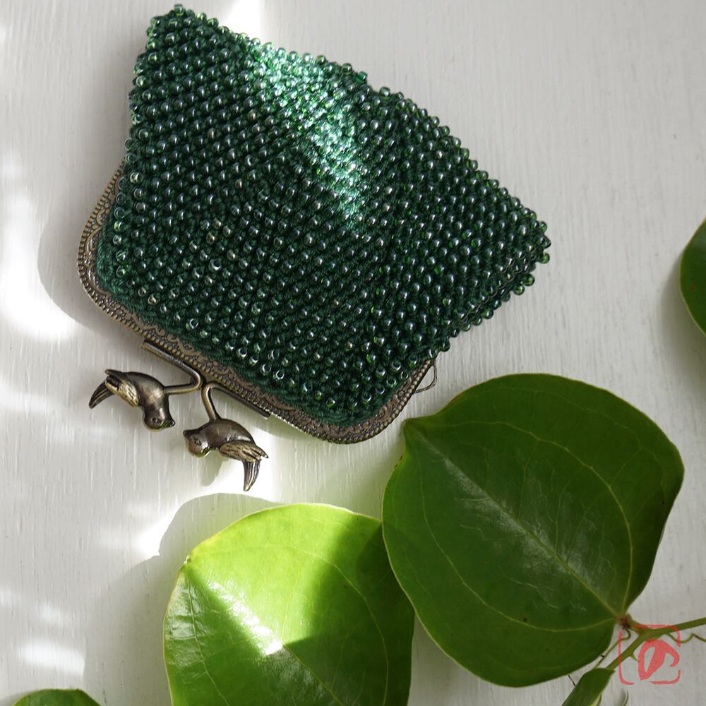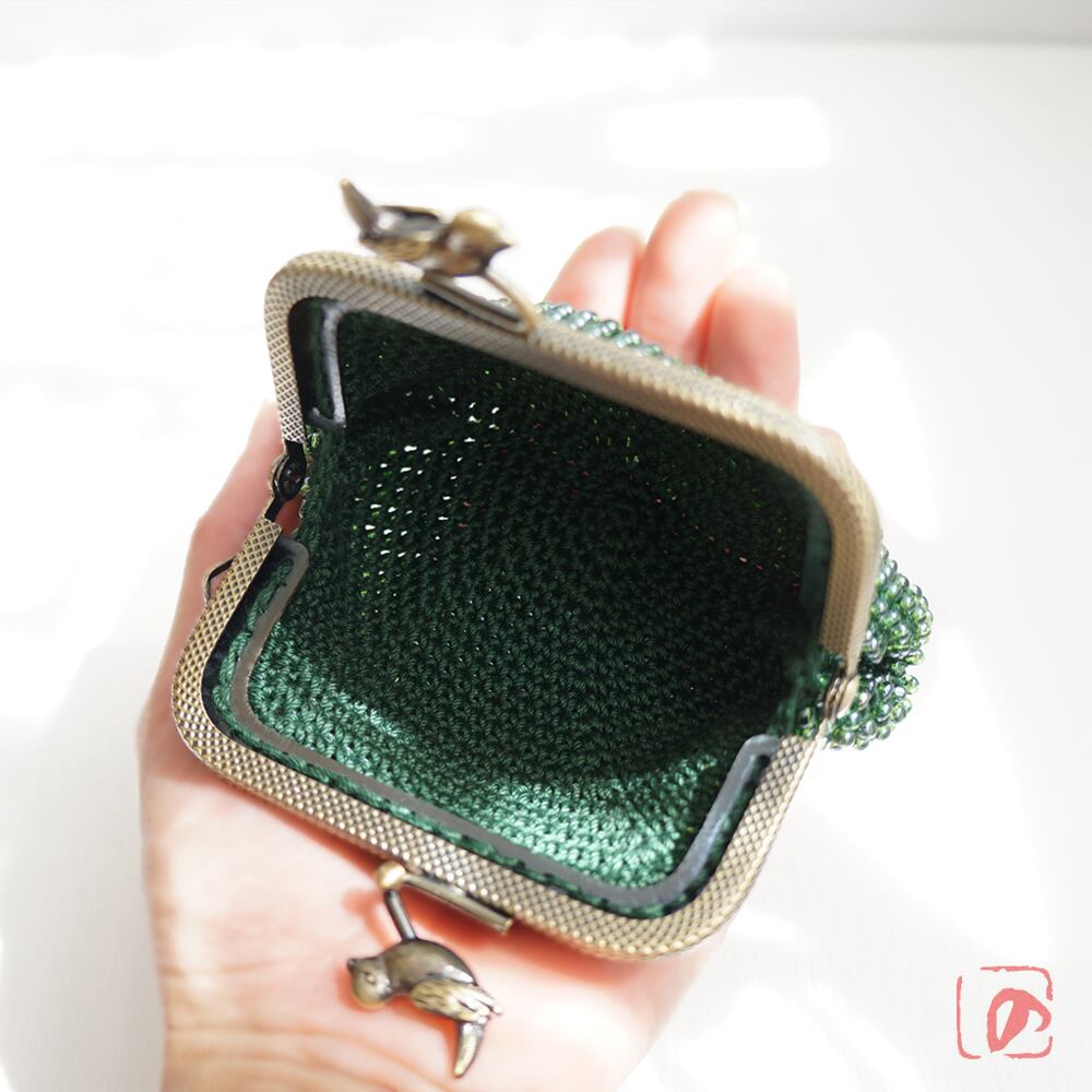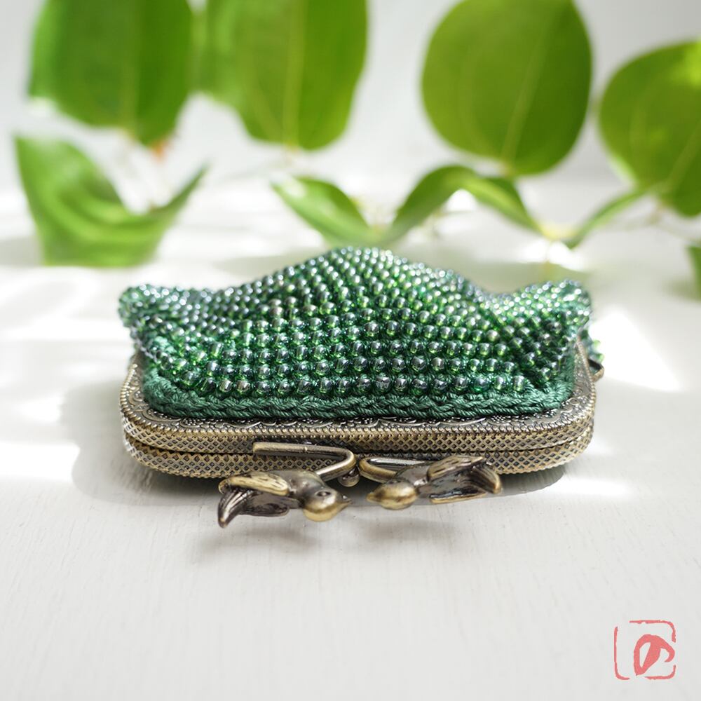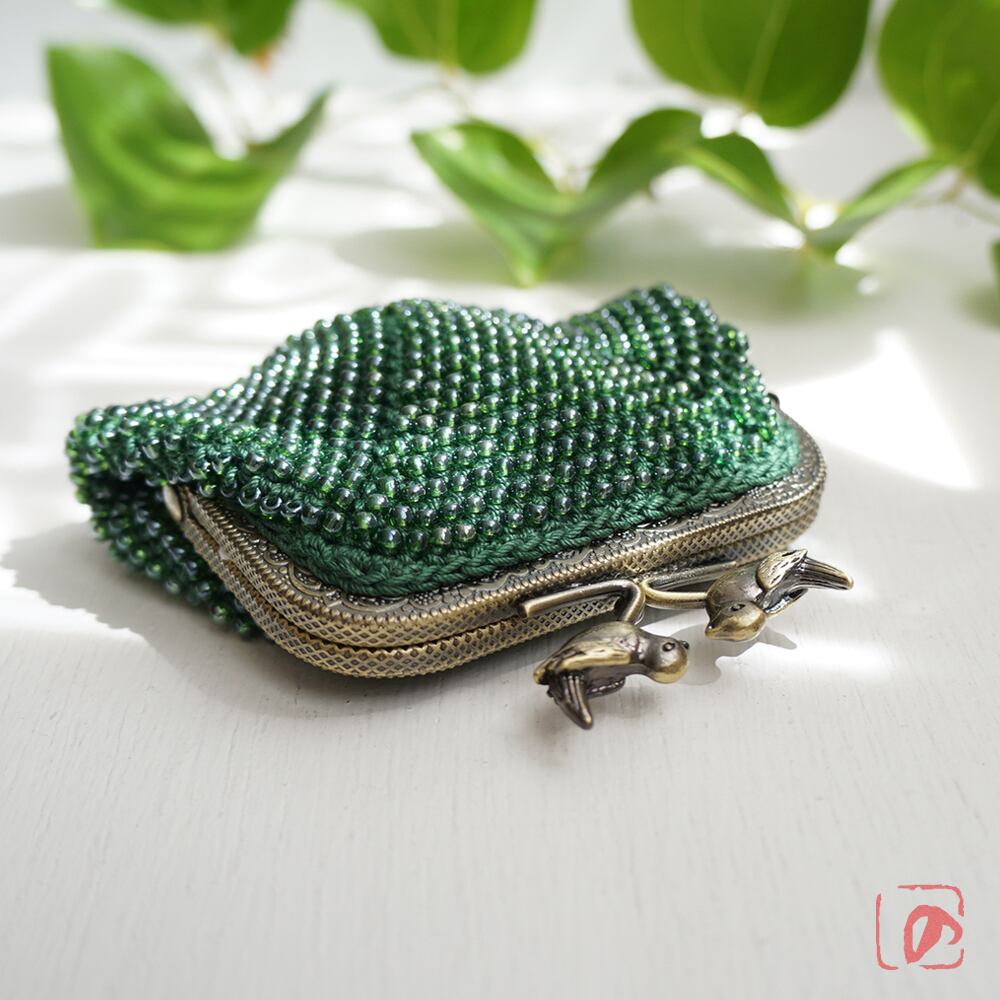 ビーズと糸の鮮やかな緑に、小鳥の口金を組み合わせてかわいらしく仕上げました。