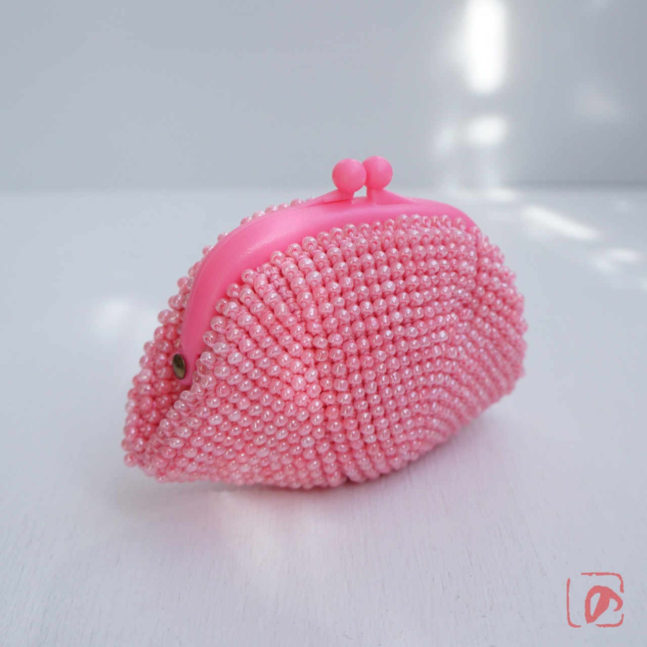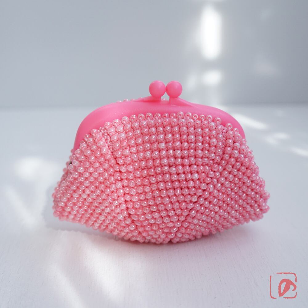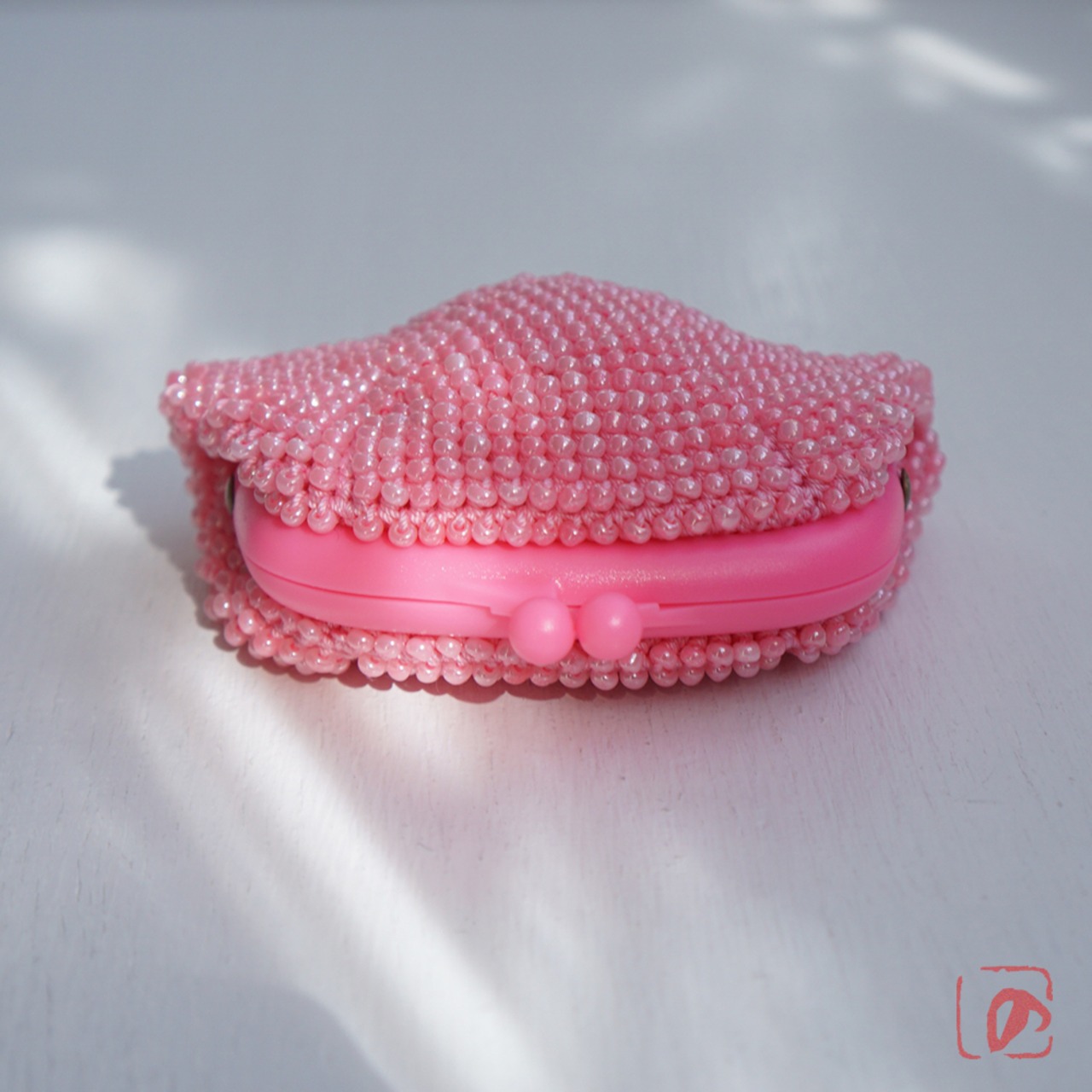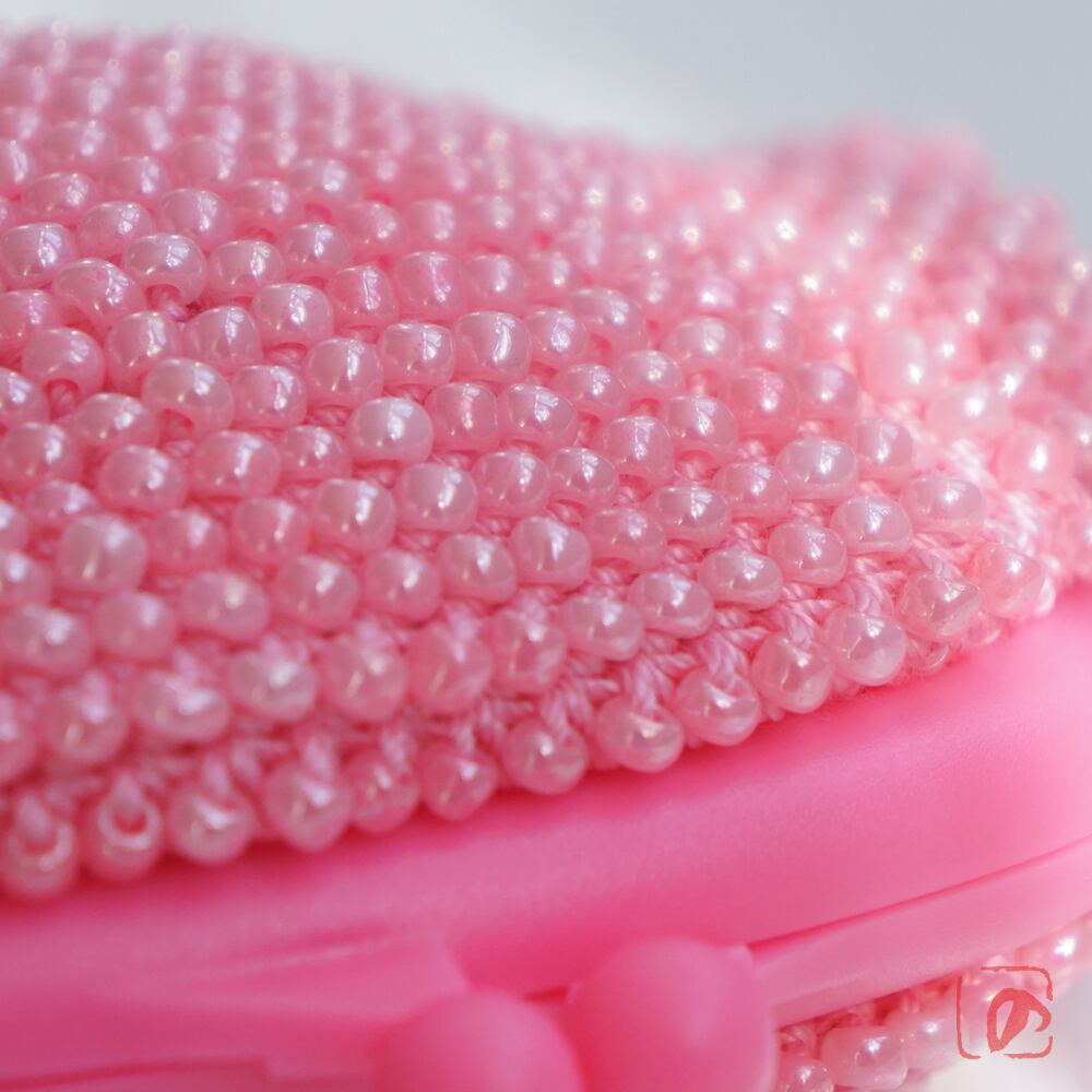 ピーチピンクの3mmガラスビーズをひとつぶづつ全面に編み込んだがま口です。