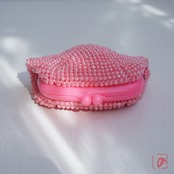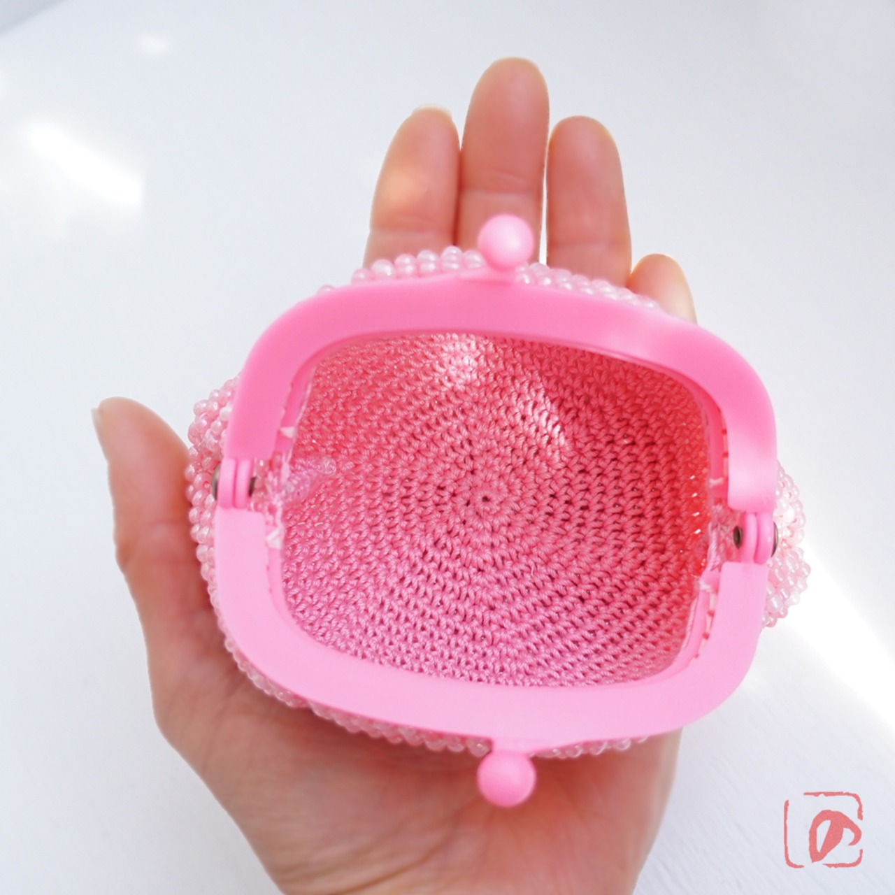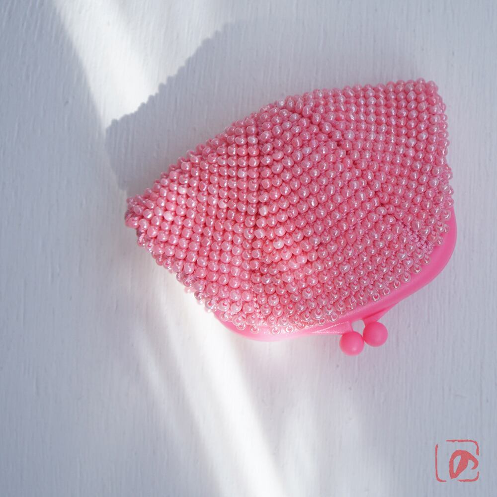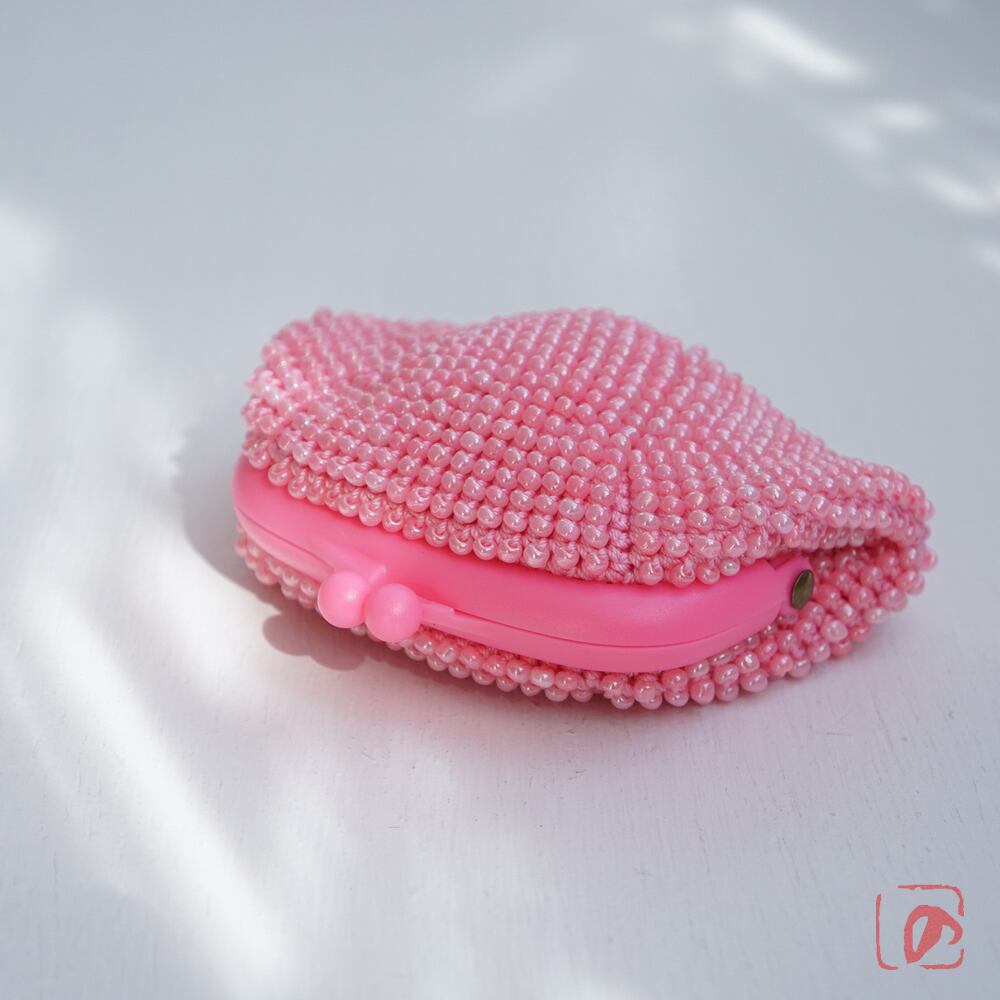 ピーチピンクの3mmガラスビーズをひとつぶづつ全面に編み込んだがま口です。