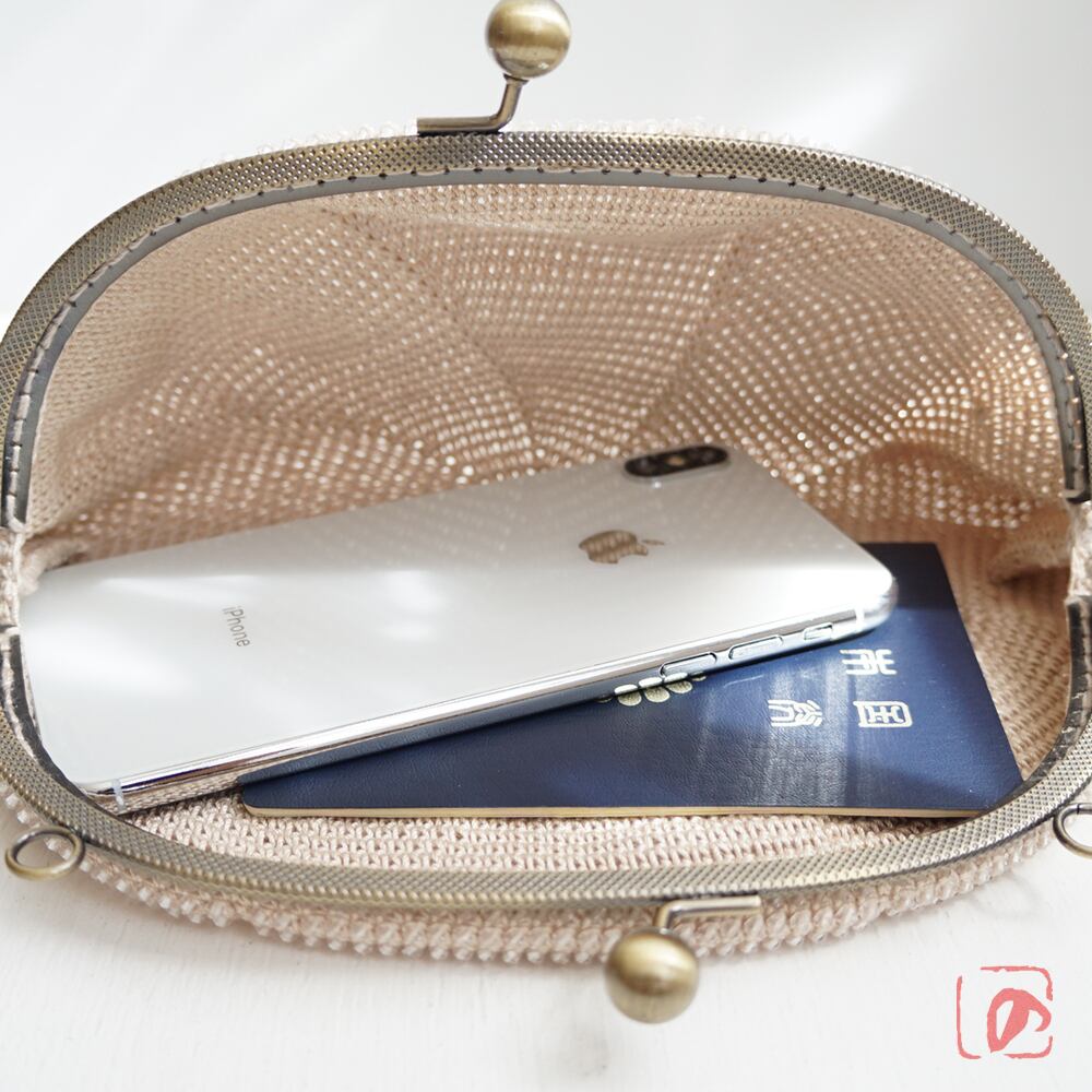 スマホ、12.5cmがま口もすっぽり入る大きさに出来上がりました。