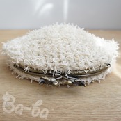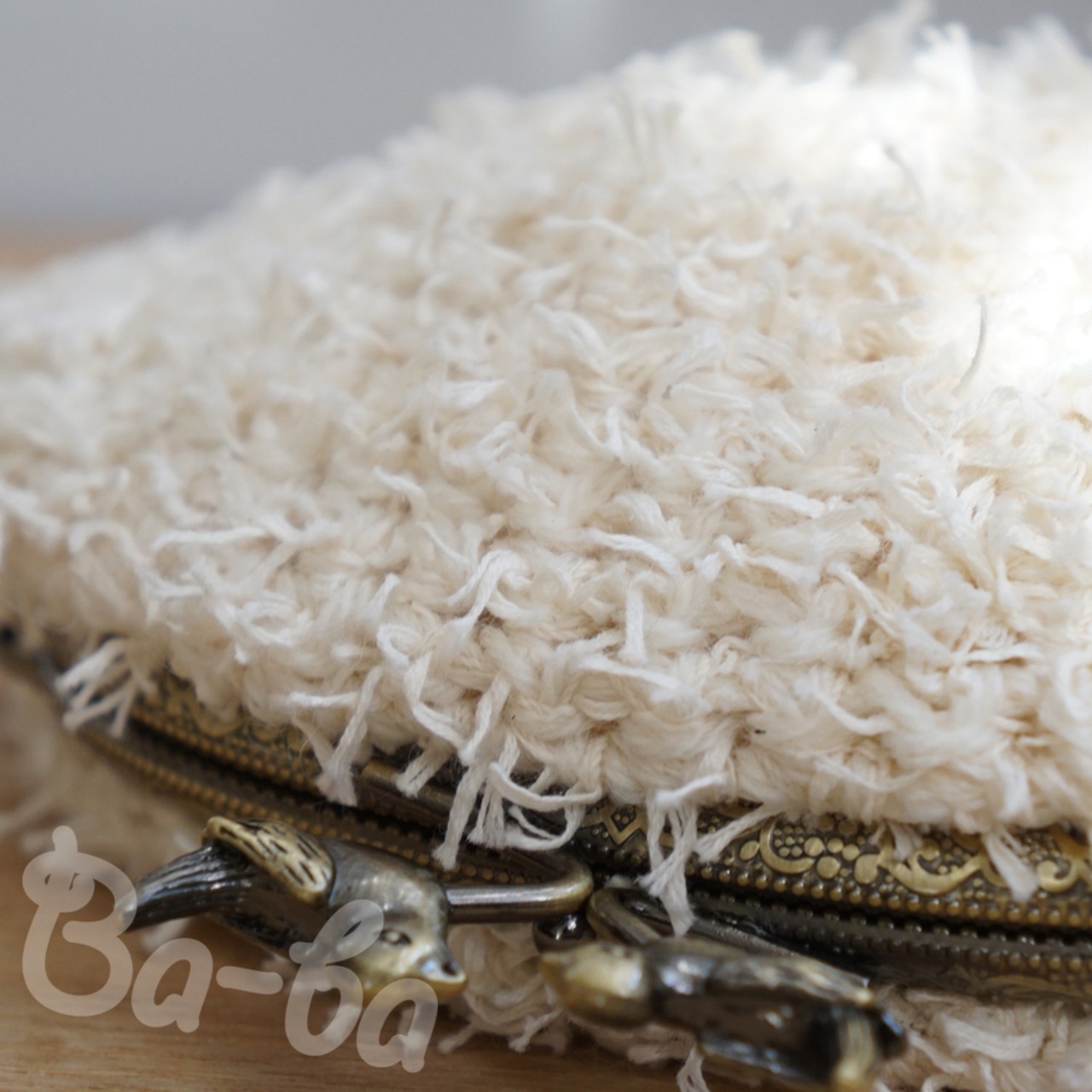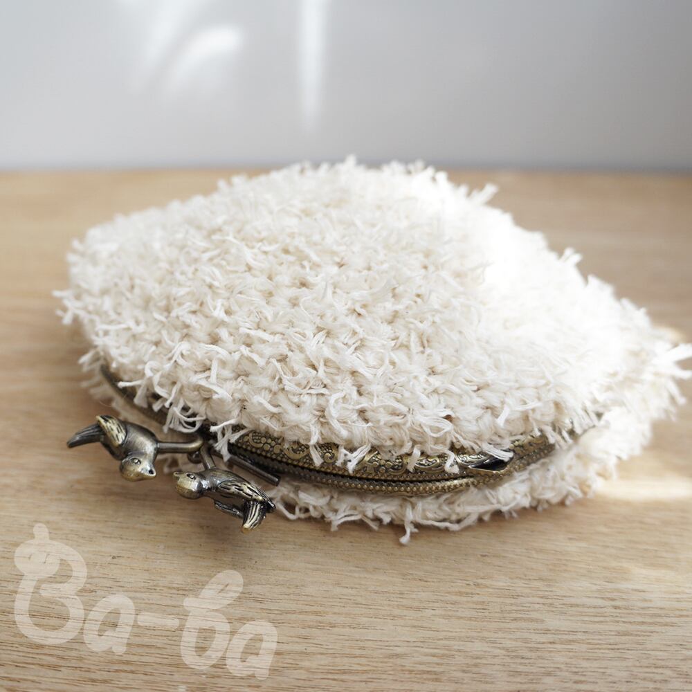 オフホワイトのふわふわフェザーヤーン毛糸をふんわりと編み上げ、
