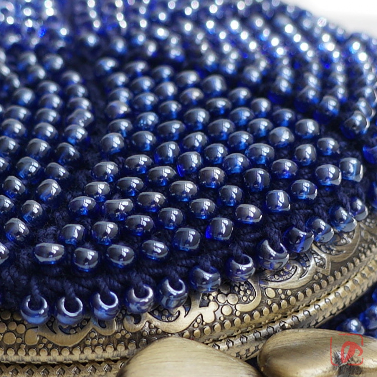 3mmのビーズをひとつぶづつ、まぁるい編み地全面に編み込みました。