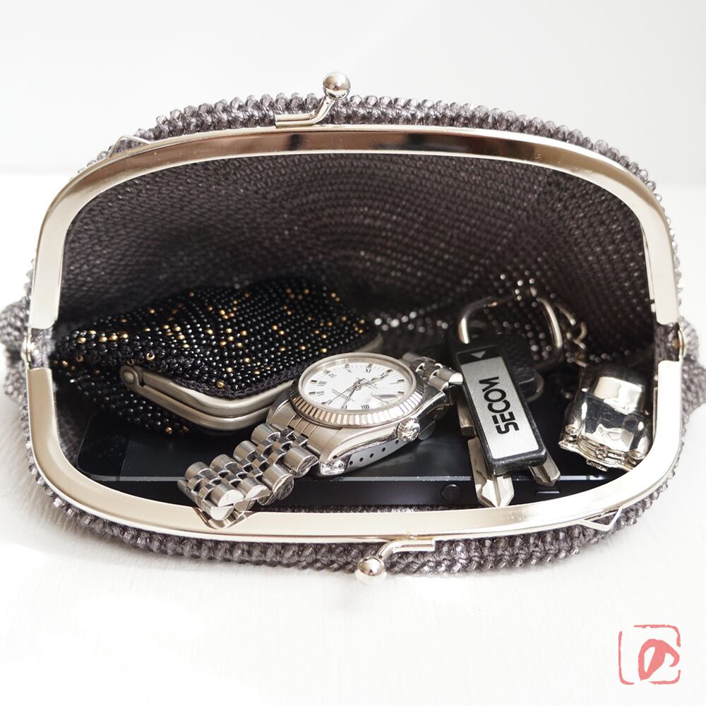 幅15cmくし型の口金を使用、大きめのポーチとして、またオプションのチェーン等で