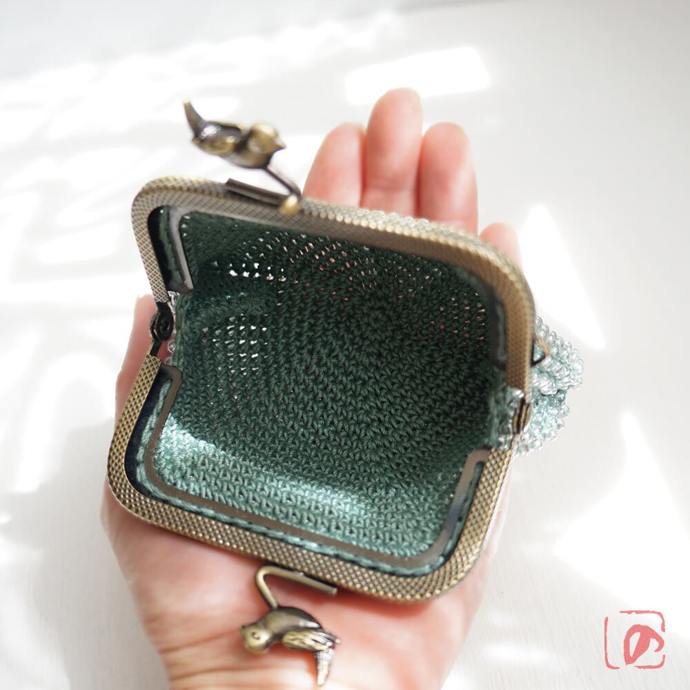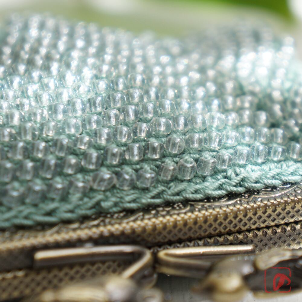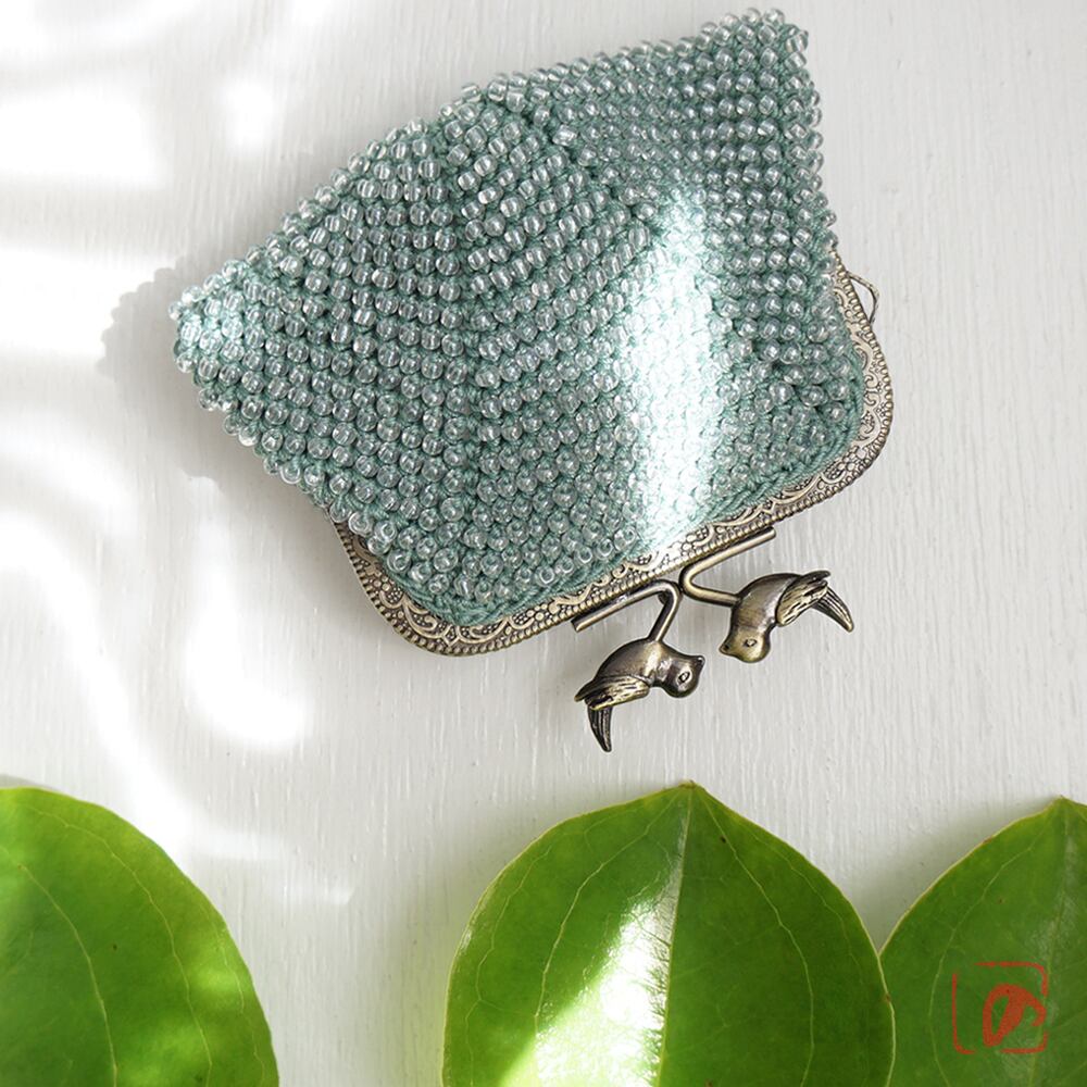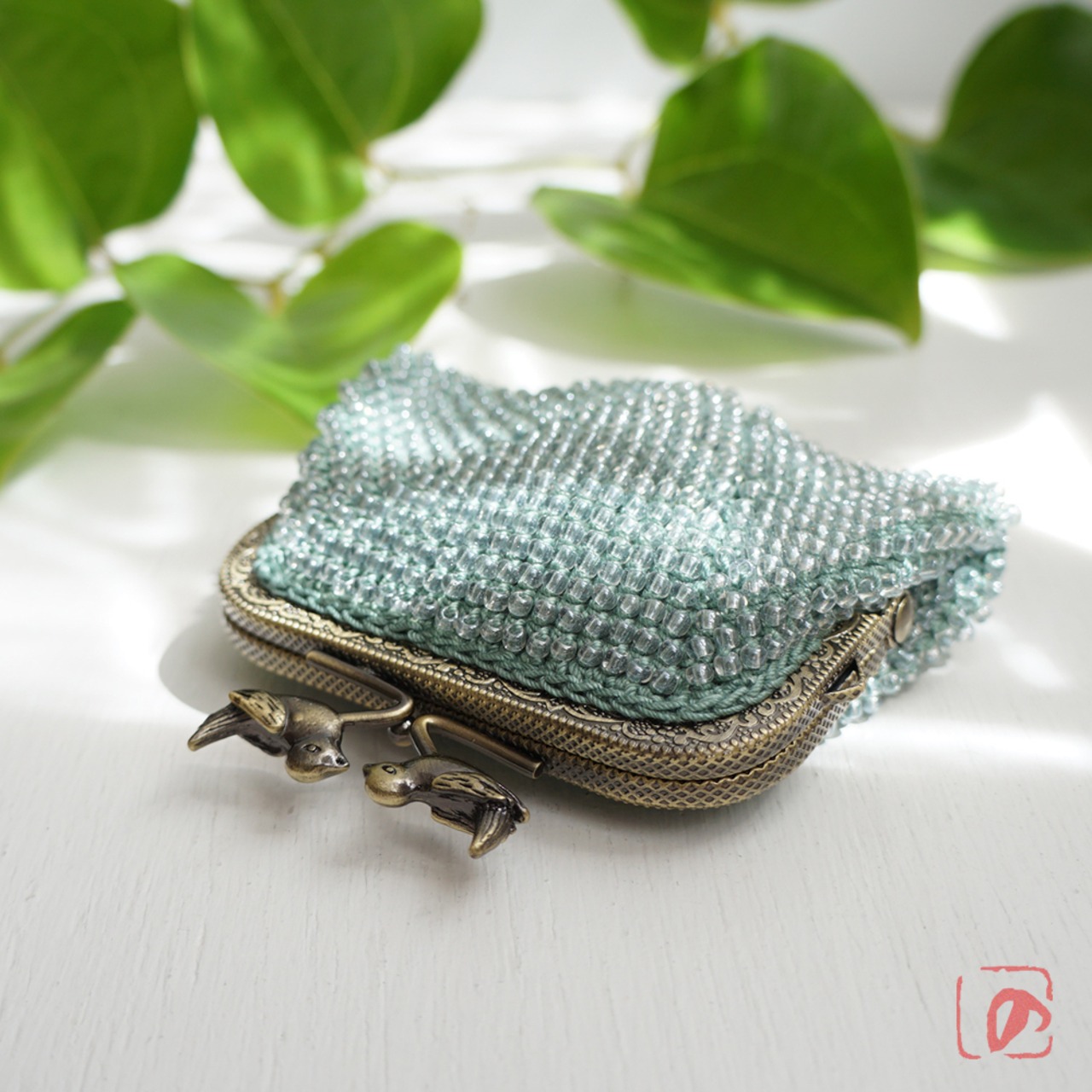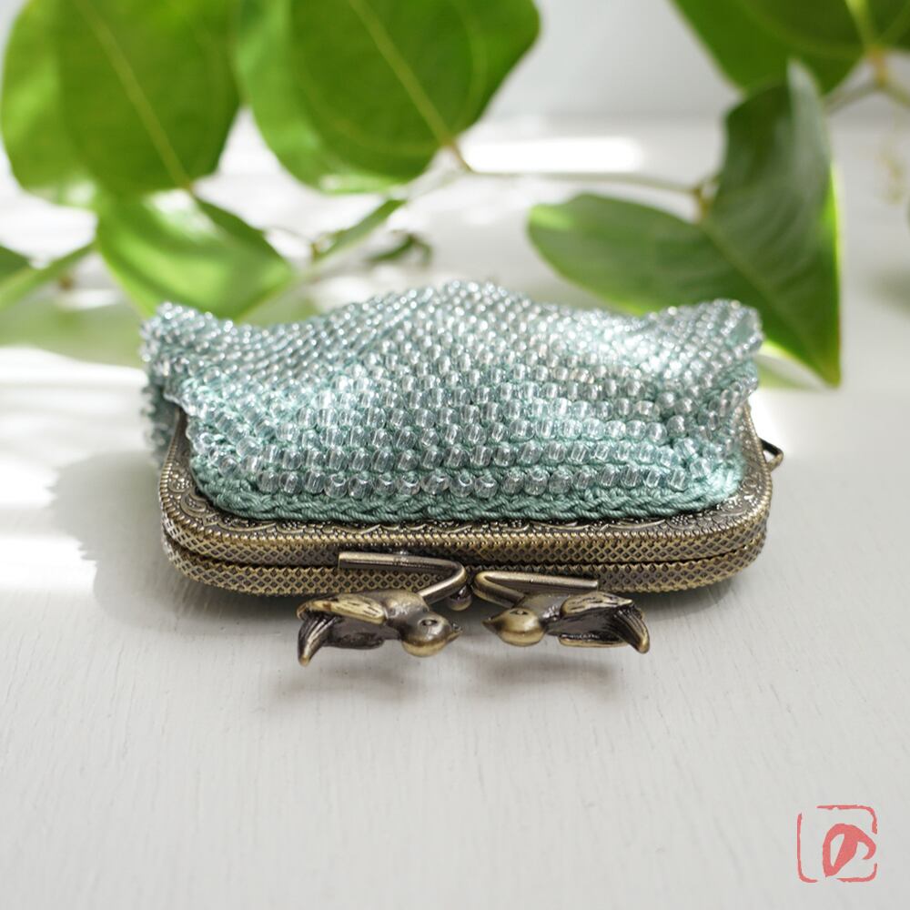 ビーズと糸の鮮やかな緑に、小鳥の口金を組み合わせてかわいらしく仕上げました。