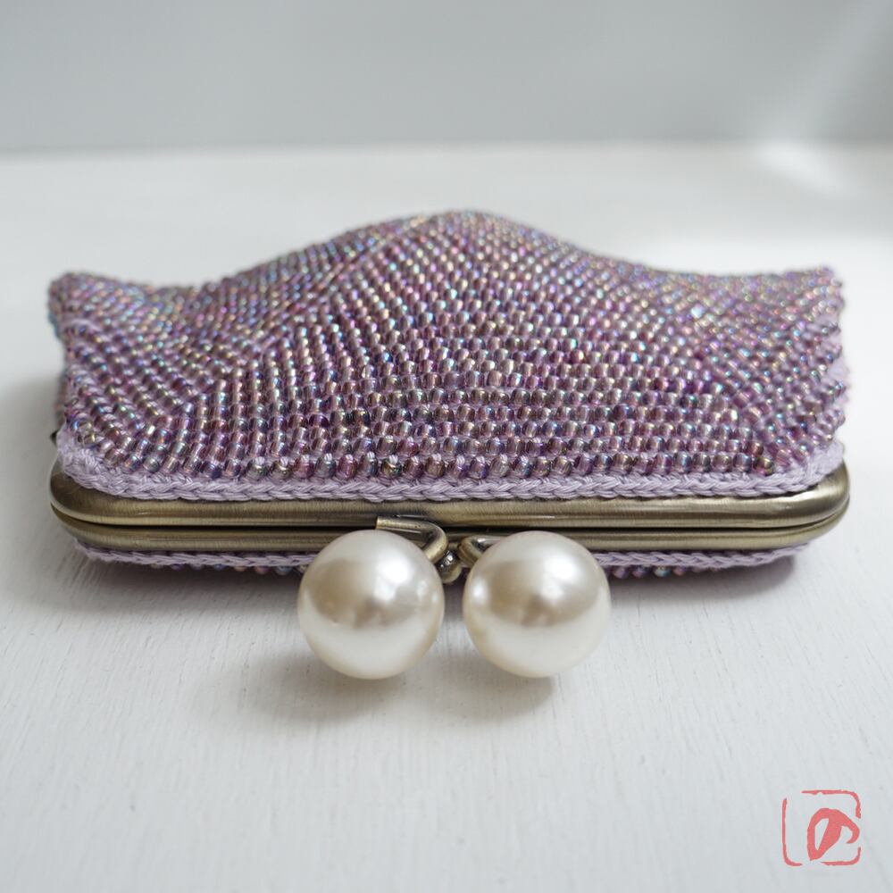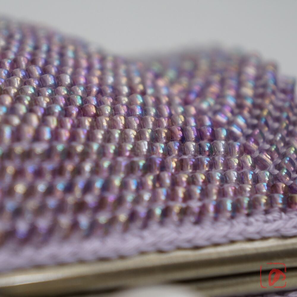 キラキラ輝く3mmのパープルレンボーのビーズをひとつぶづつ、全面に編み込みました。