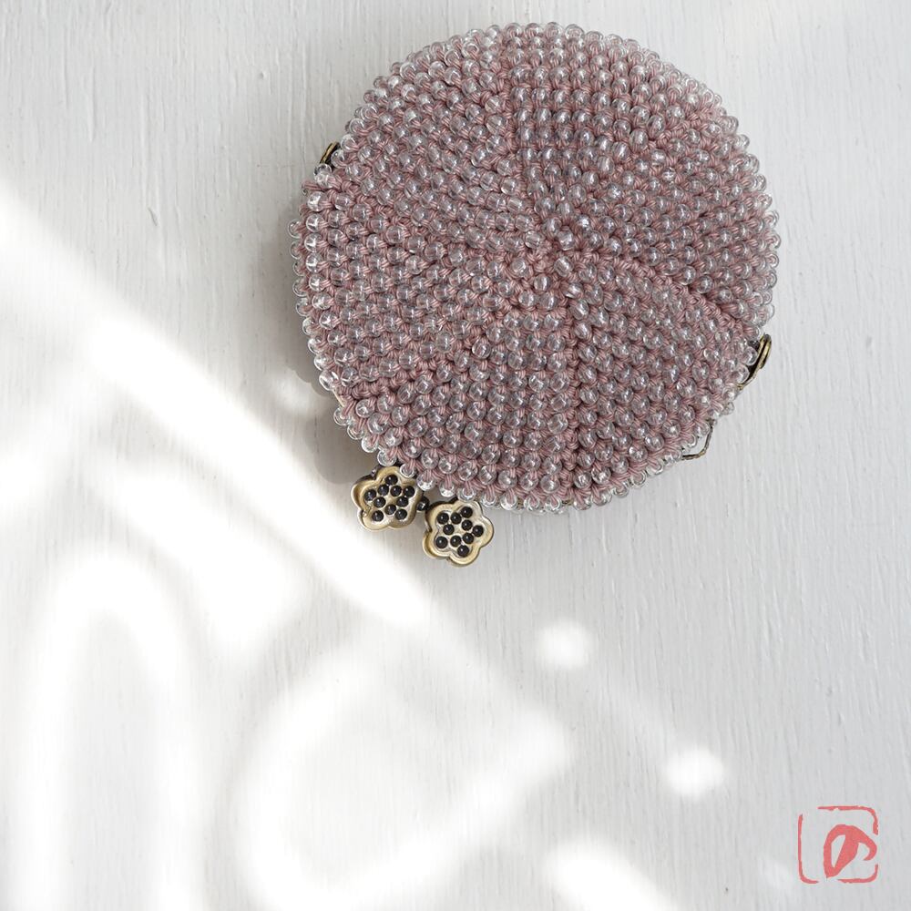 クリアビーズを落ち着いたくすみピンクの糸に通した編み地で、シックな雰囲気に仕上げました。
