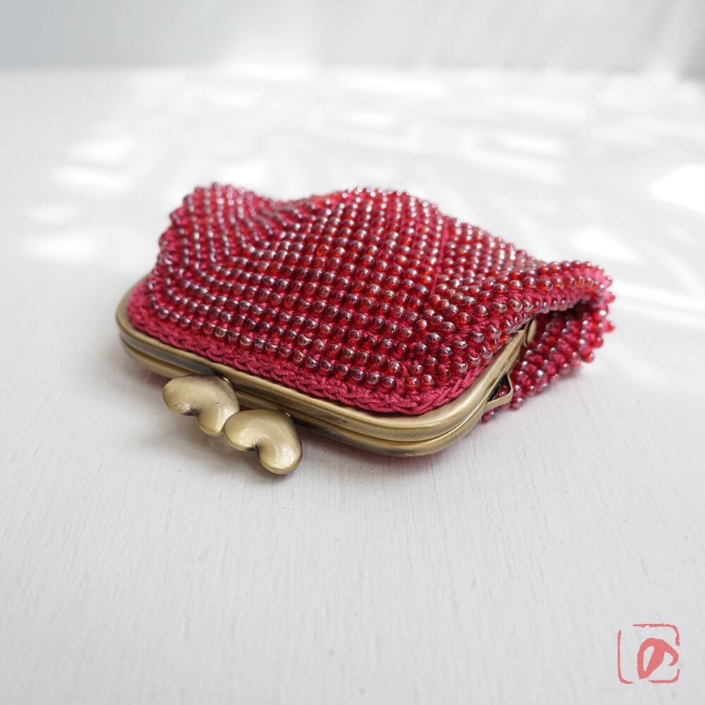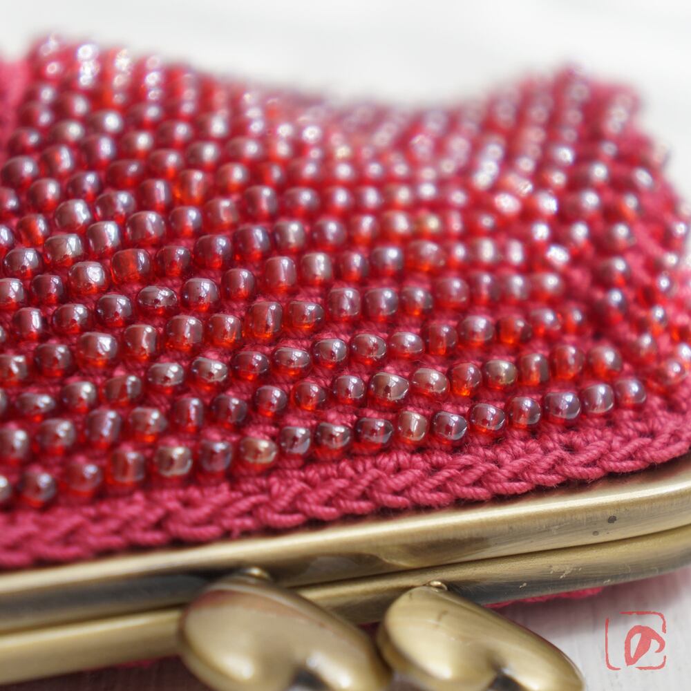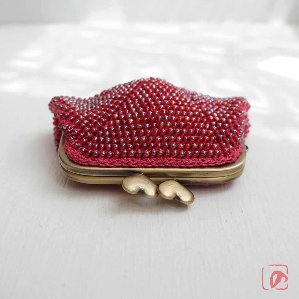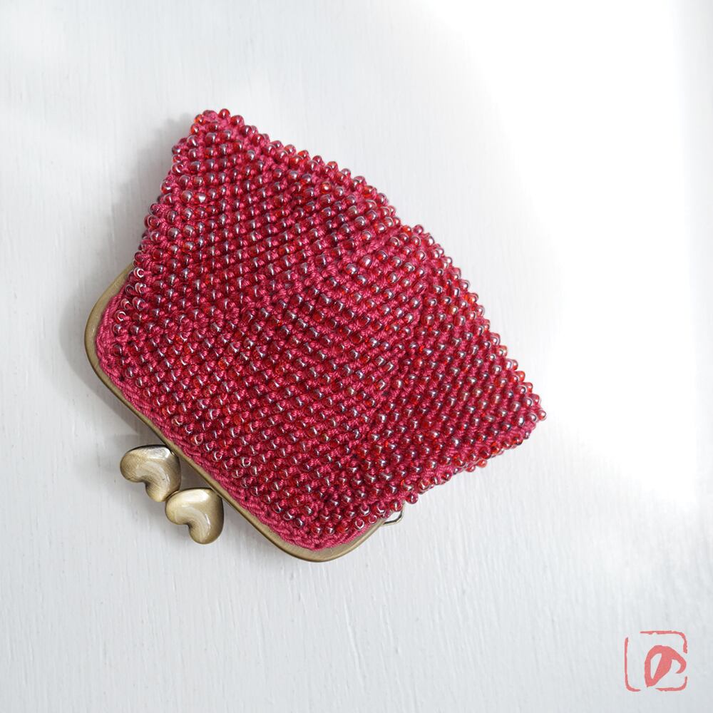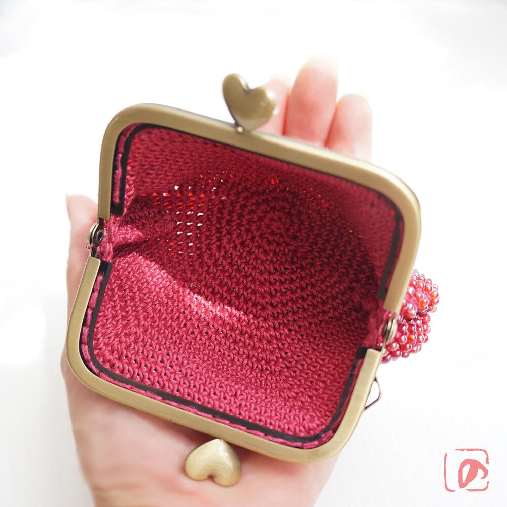 ベリー色の糸×赤のビーズ♡ハートの口金を組み合わせてかわいらしく仕上げました。