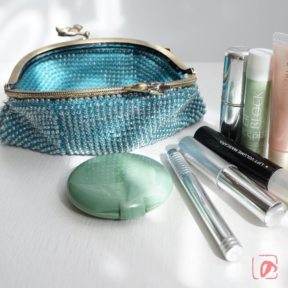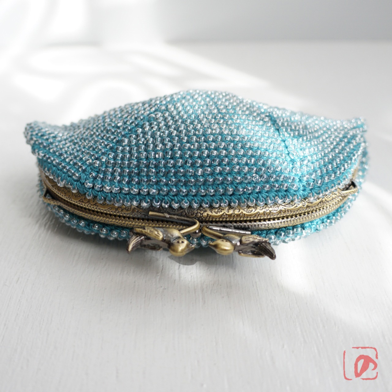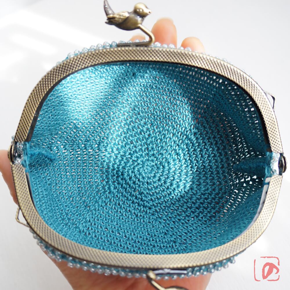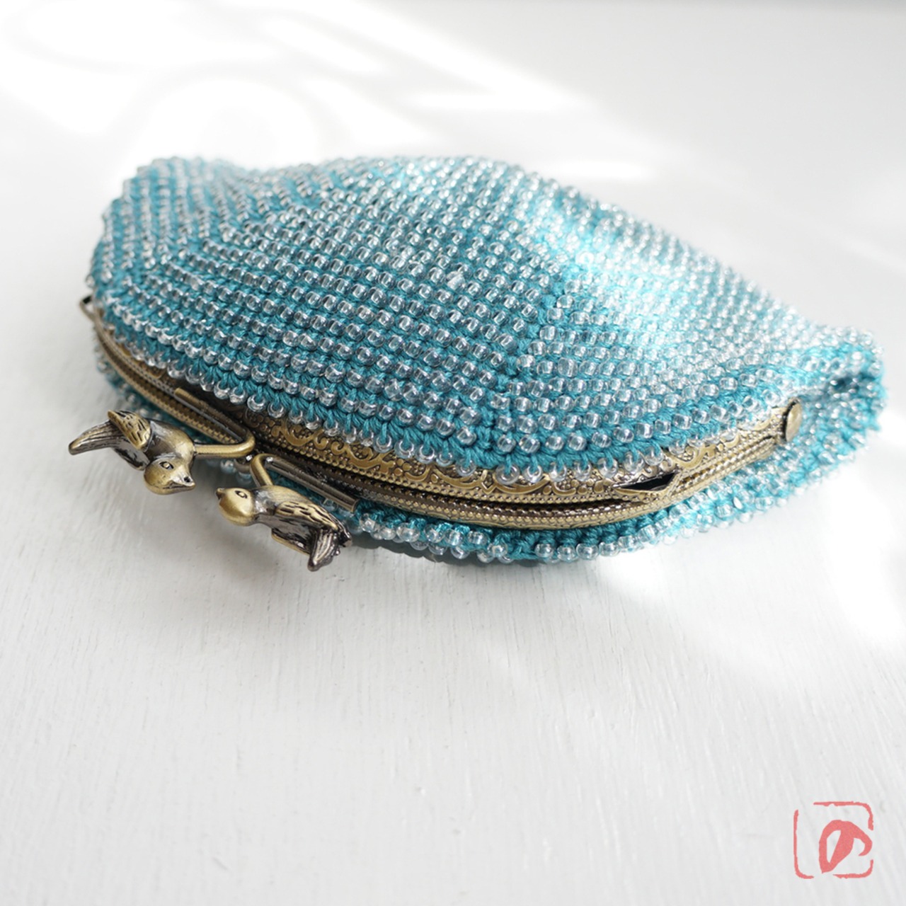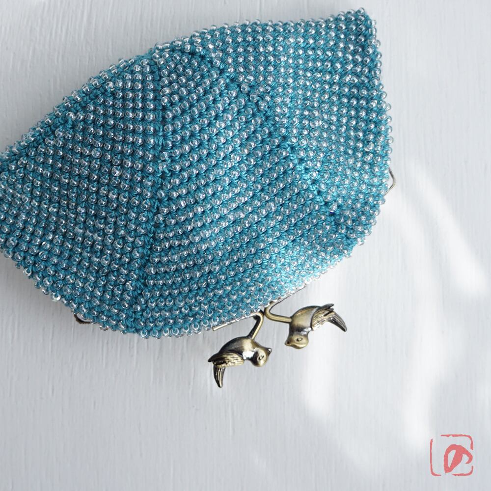 緑青色のビーズの編み地と小鳥のつまみが相性ピッタリ。