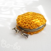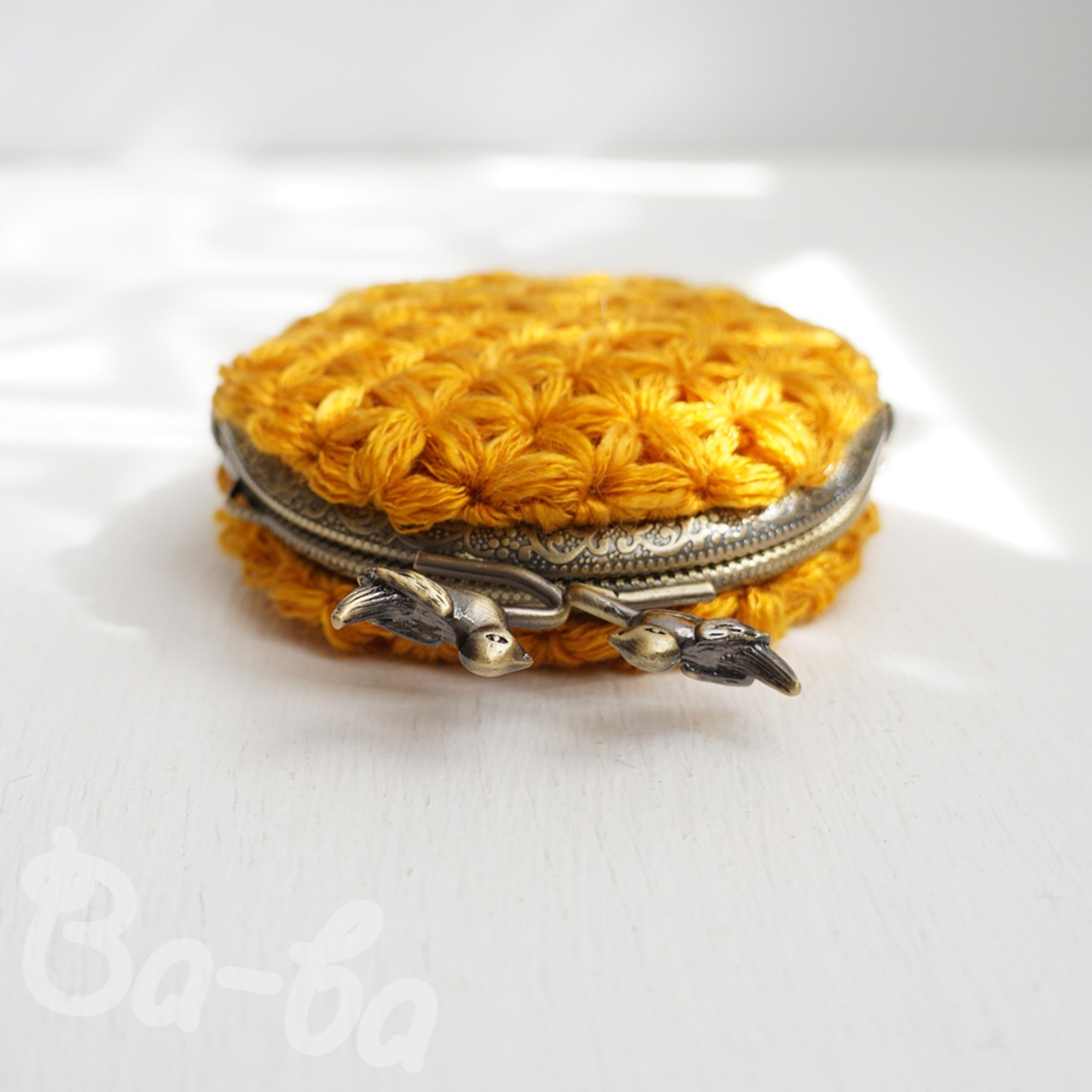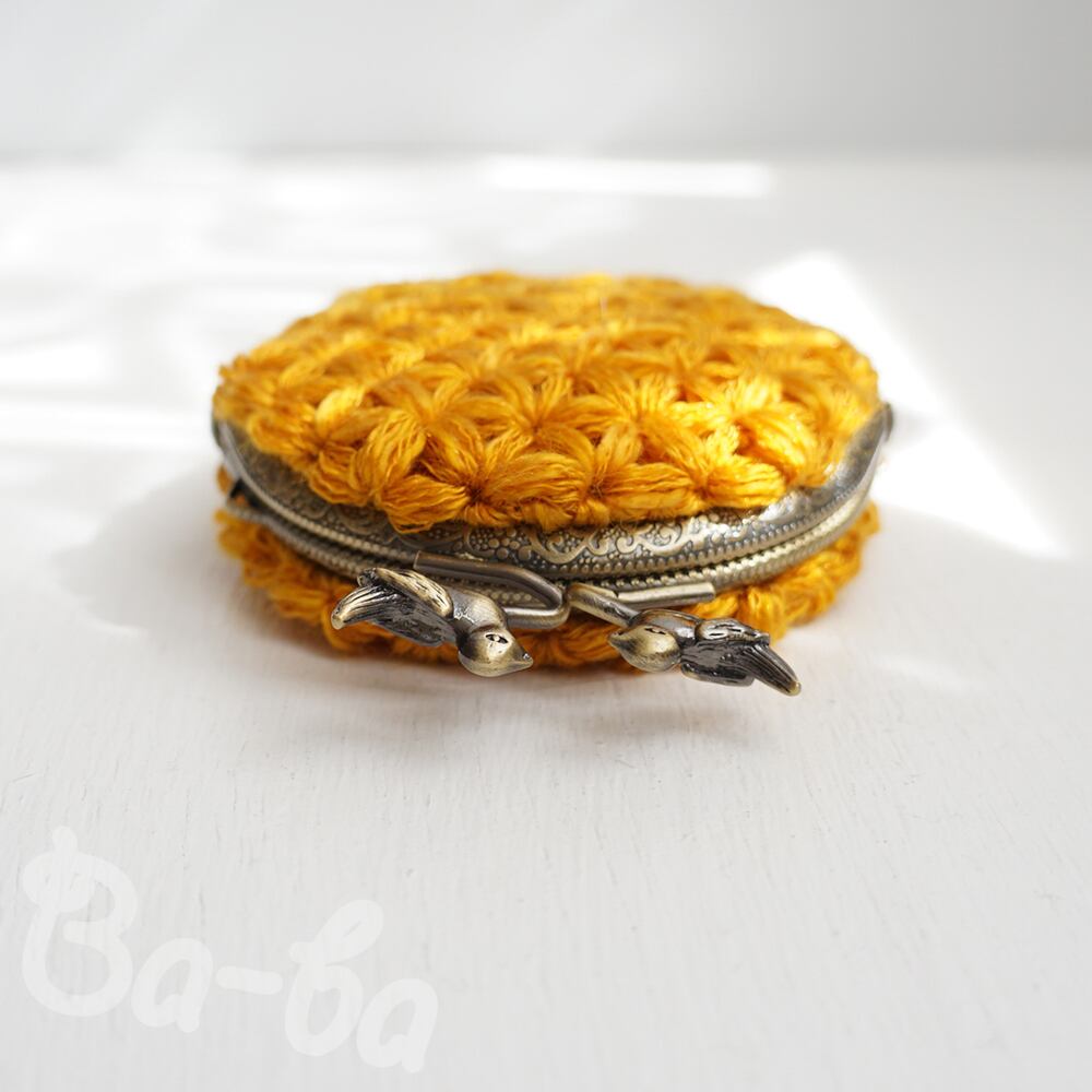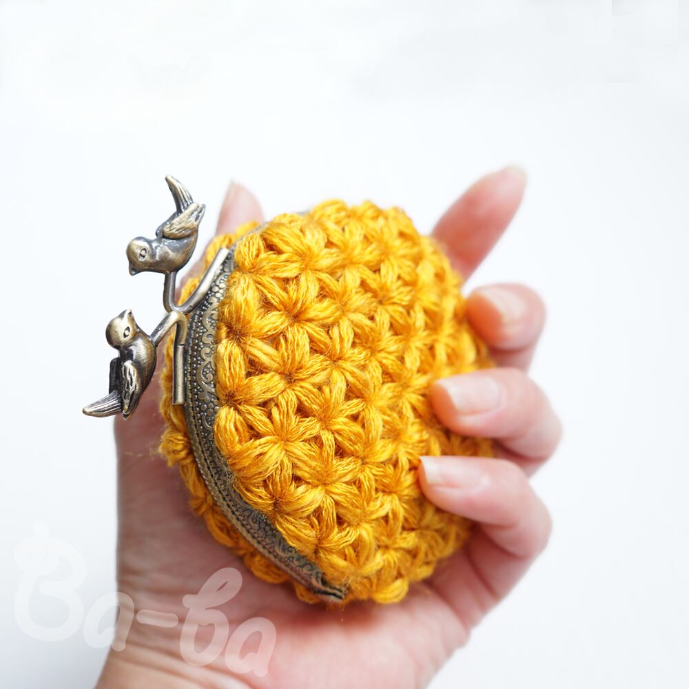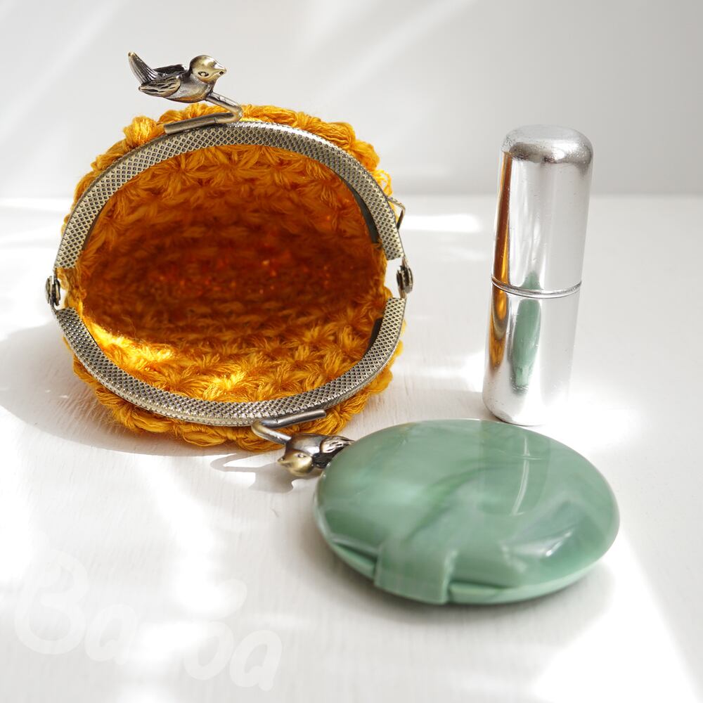 光沢のあるオレンジ色のサマーヤーンでふんわりと編み上げ、小鳥の口金と組み合わせました。