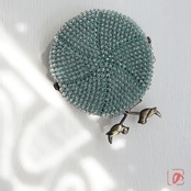 3mmのビーズをひとつぶづつ、まぁるい編み地全面に編み込みました。