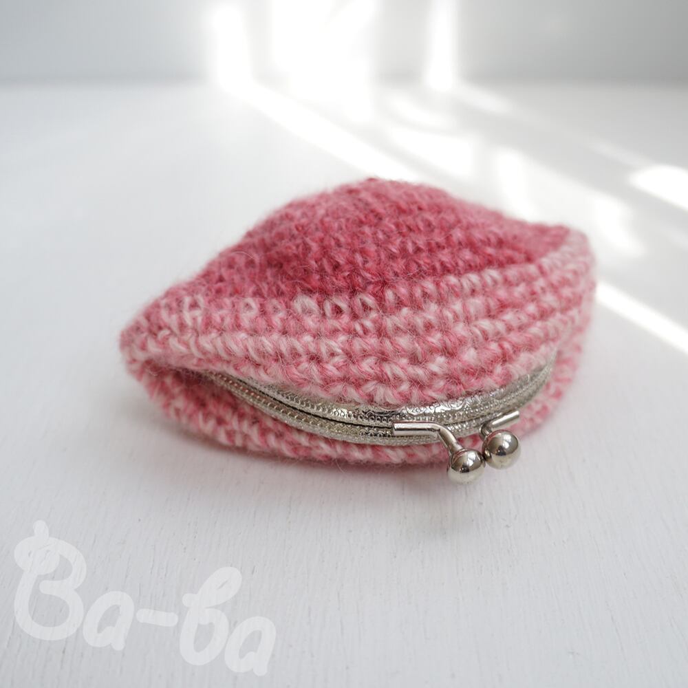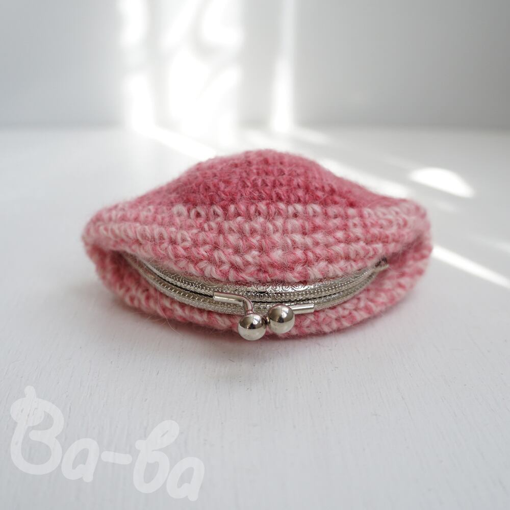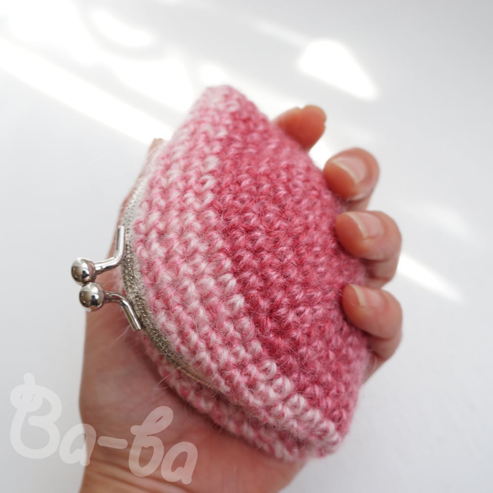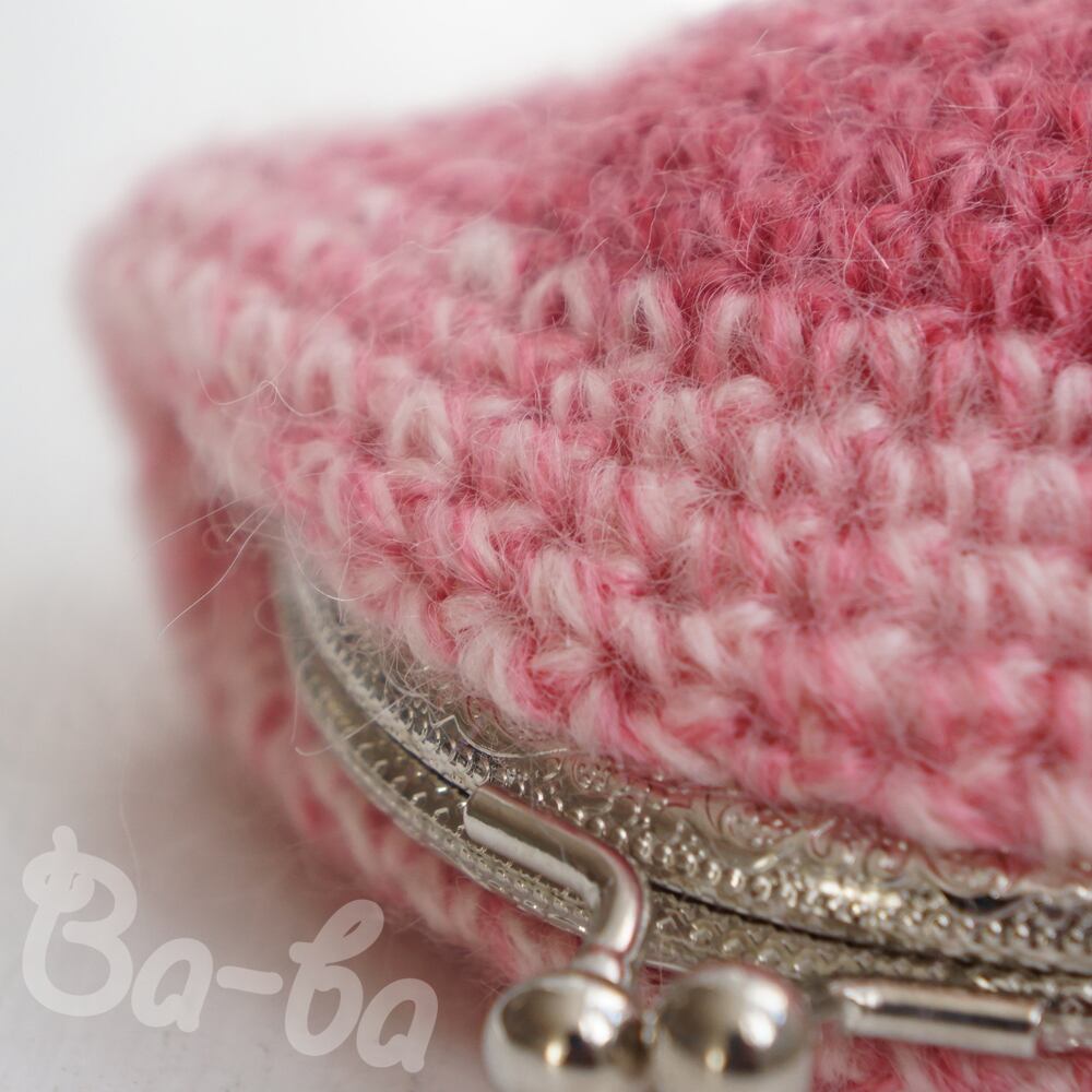 ピンクのモヘヤ毛糸を編み上げ、ふんわり軽~いがま口に仕上げました。