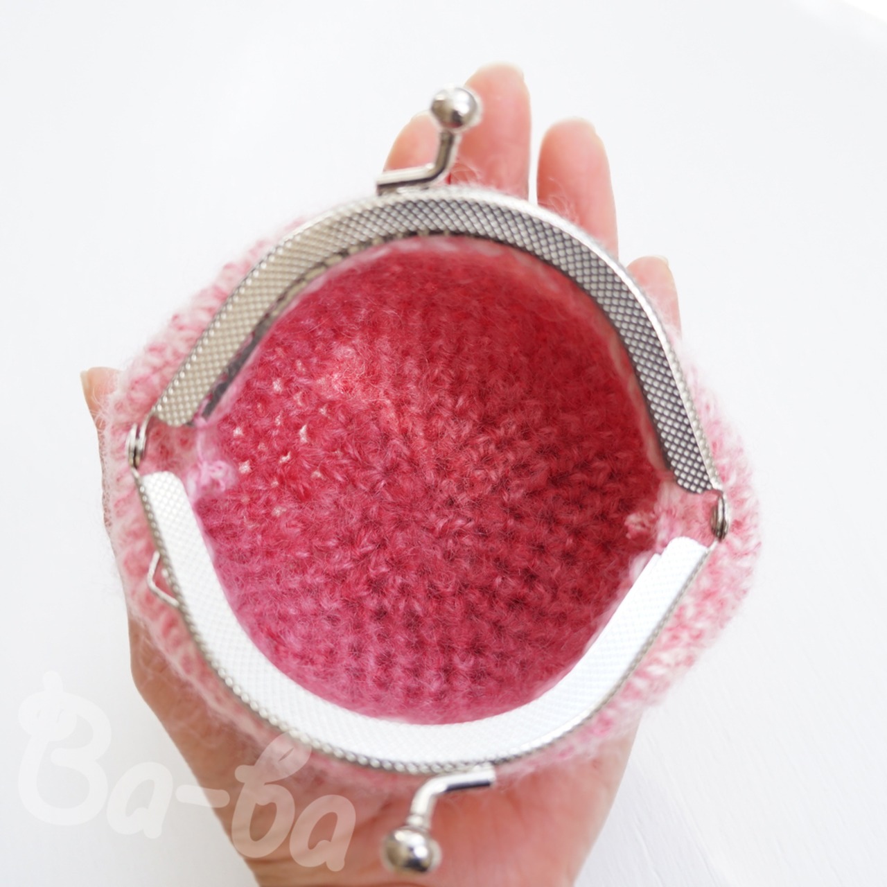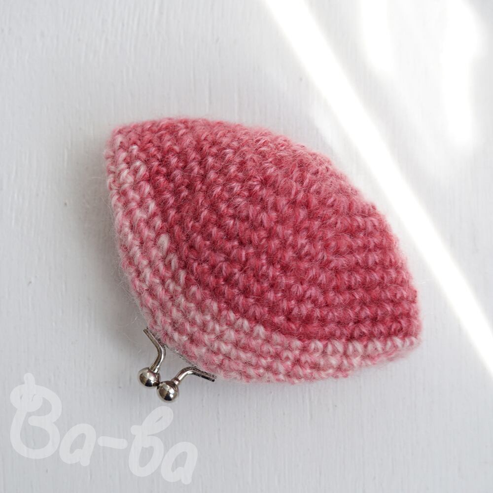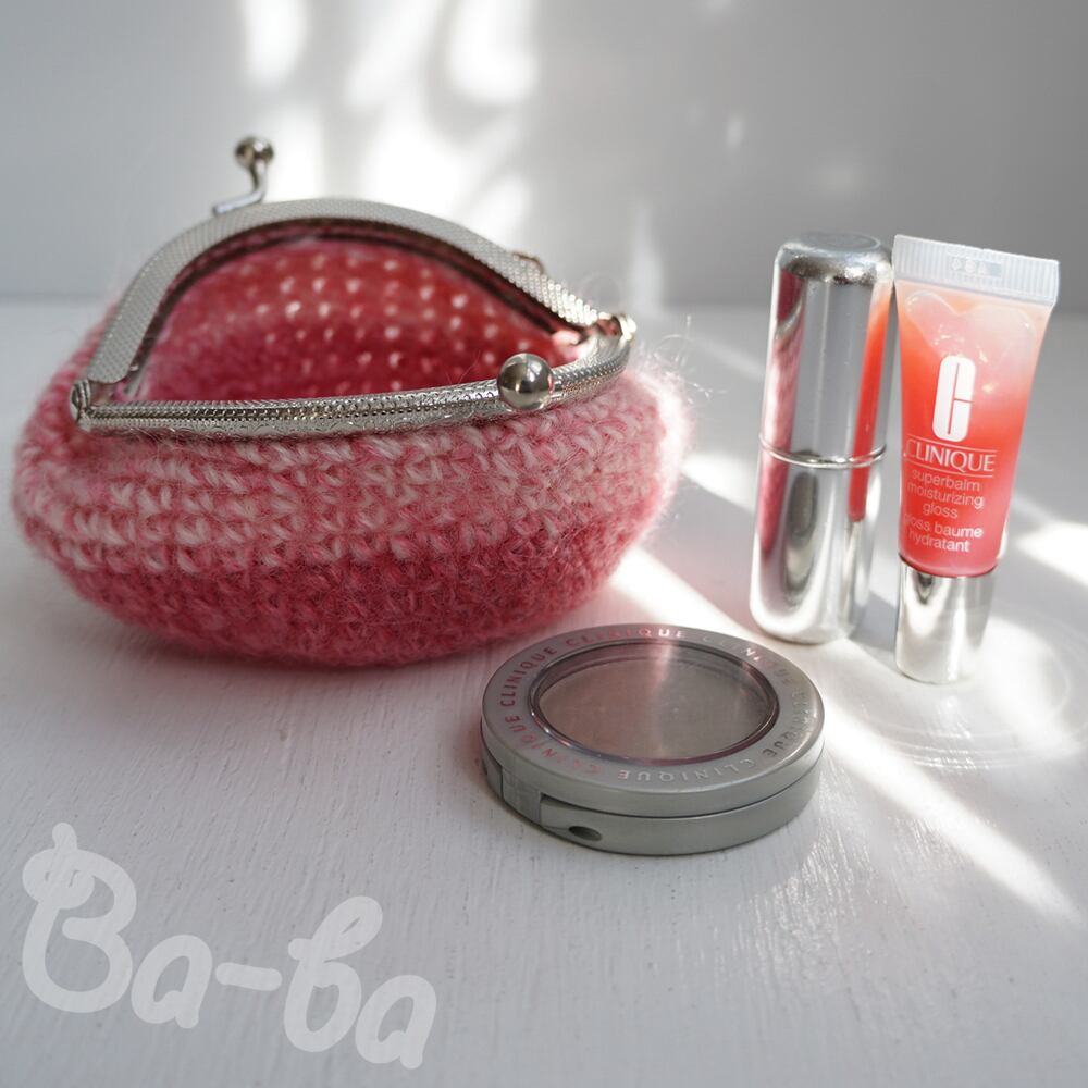 ピンクのモヘヤ毛糸を編み上げ、ふんわり軽~いがま口に仕上げました。