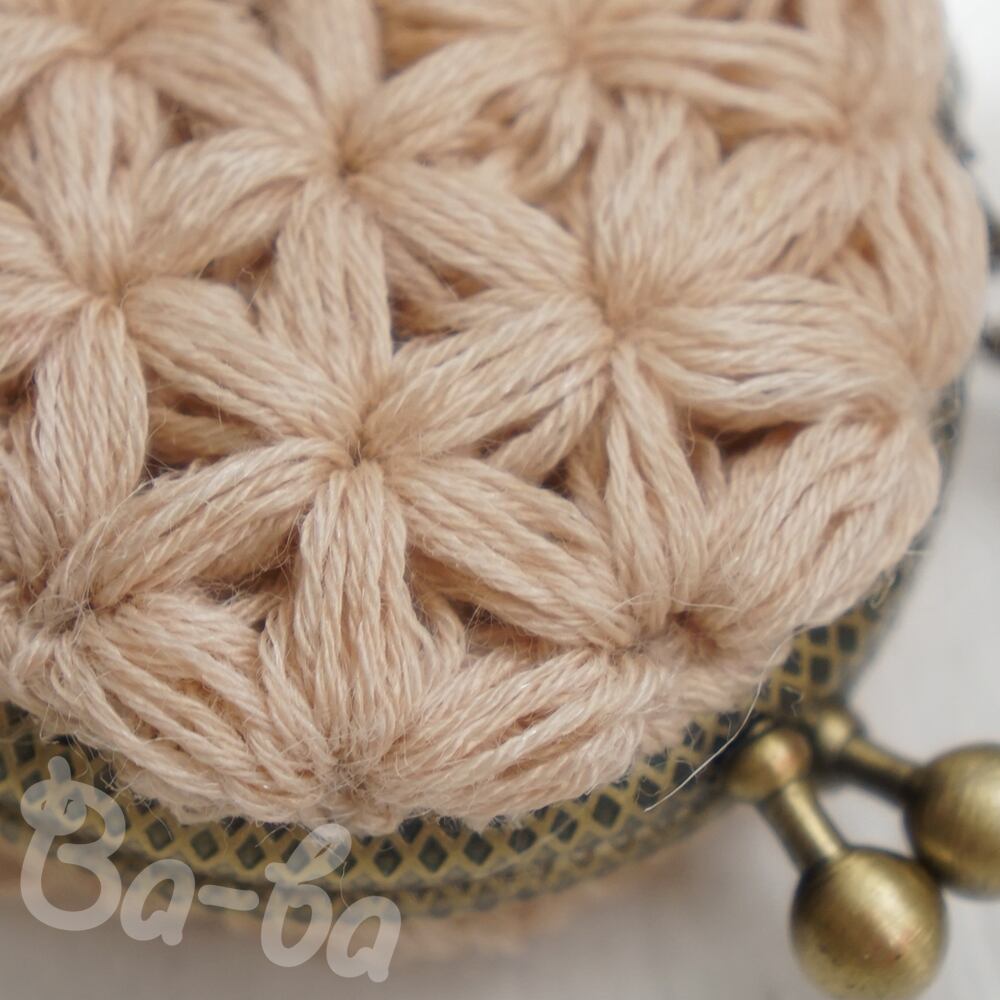 明るいベージュ色のサマーヤーンで、ふんわりリフ編みのがま口を作りました。