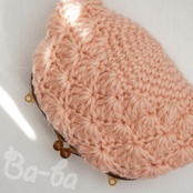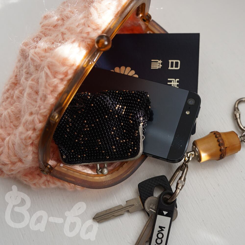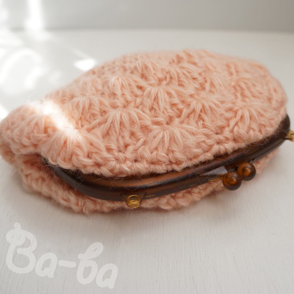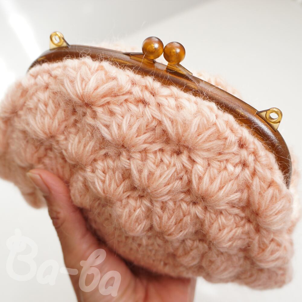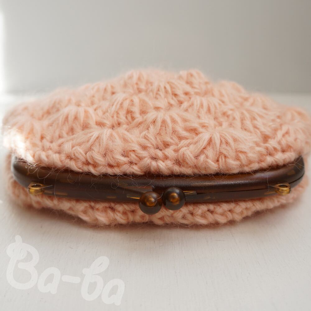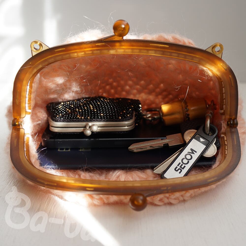 モヘア松編みのふんわり編み地に、プラ口金を合わせました。