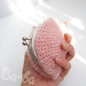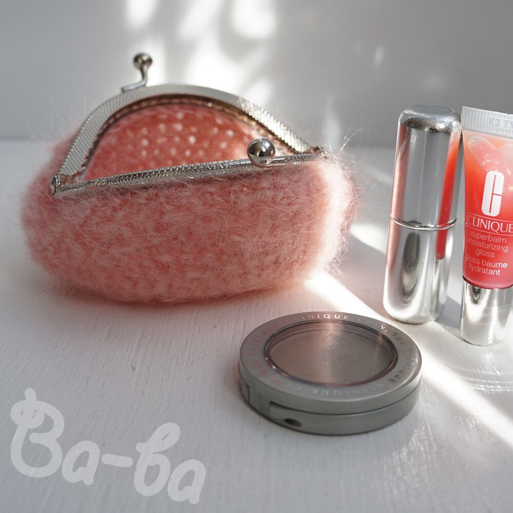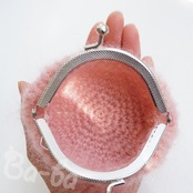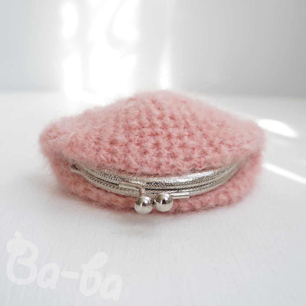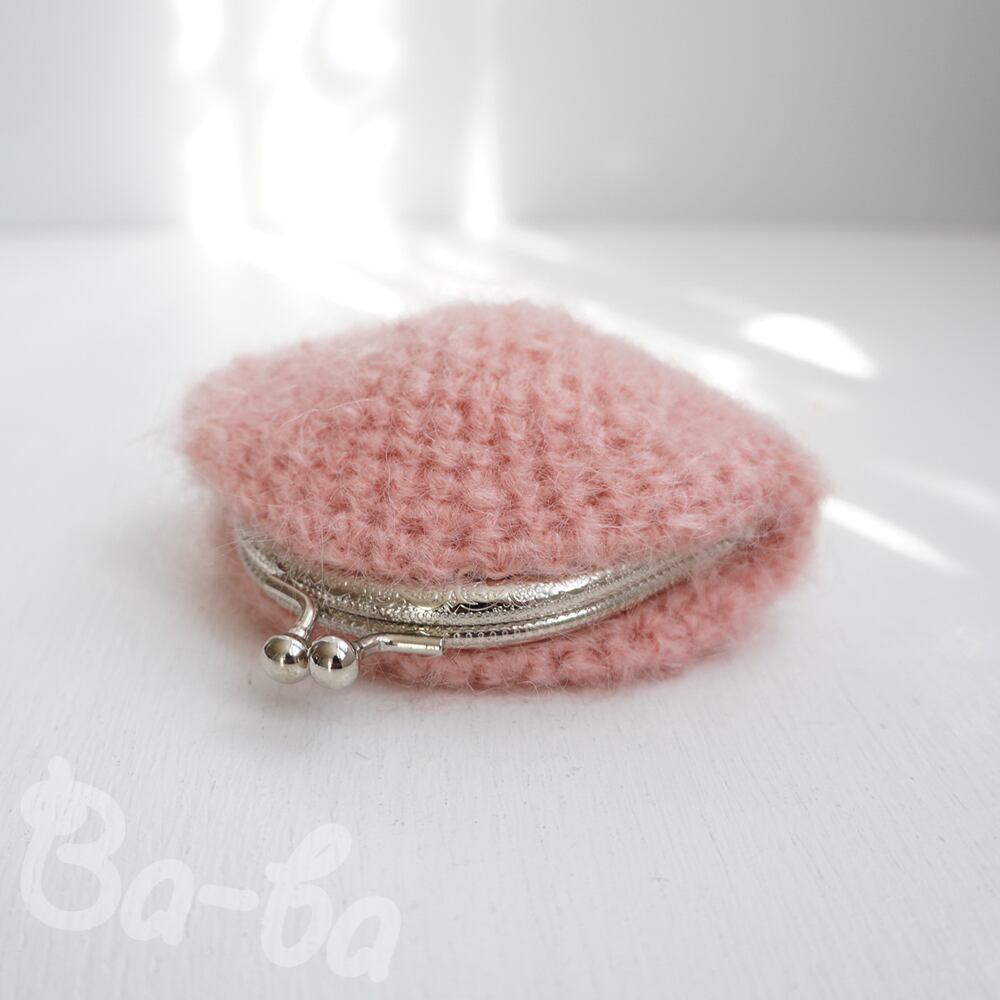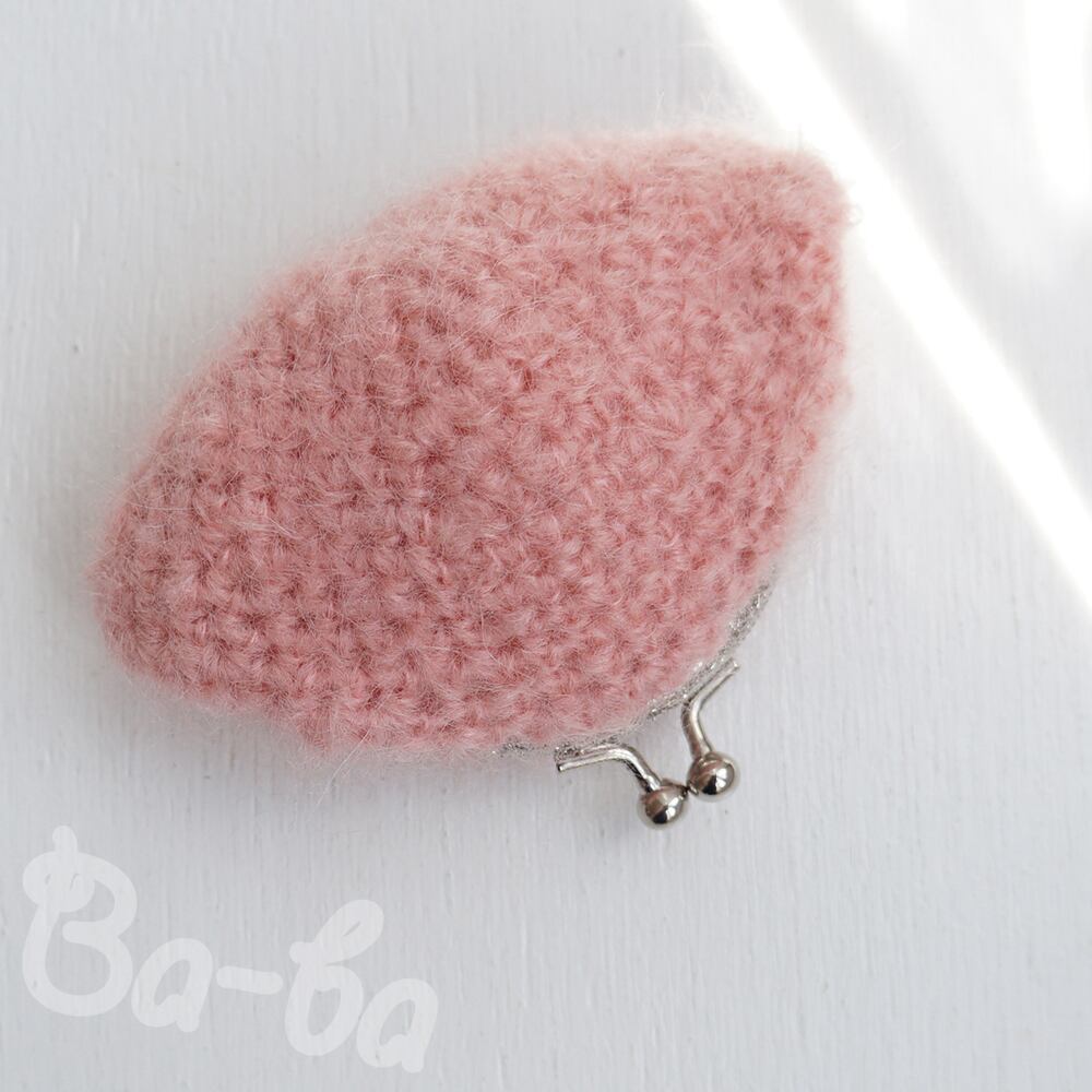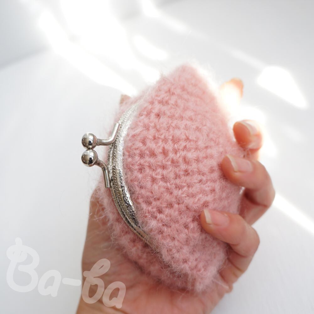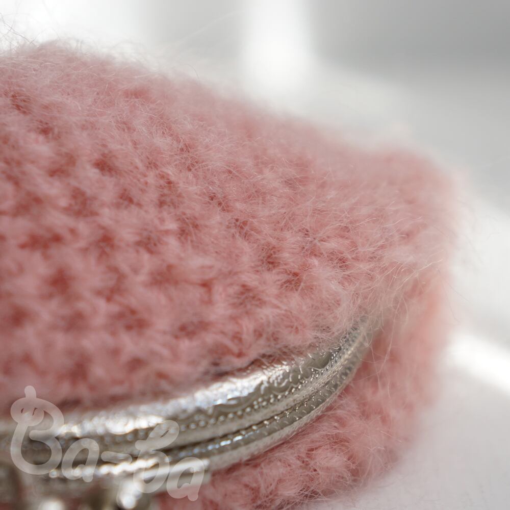 ピンクのモヘヤ毛糸を編み上げ、ふんわり軽~いがま口に仕上げました。