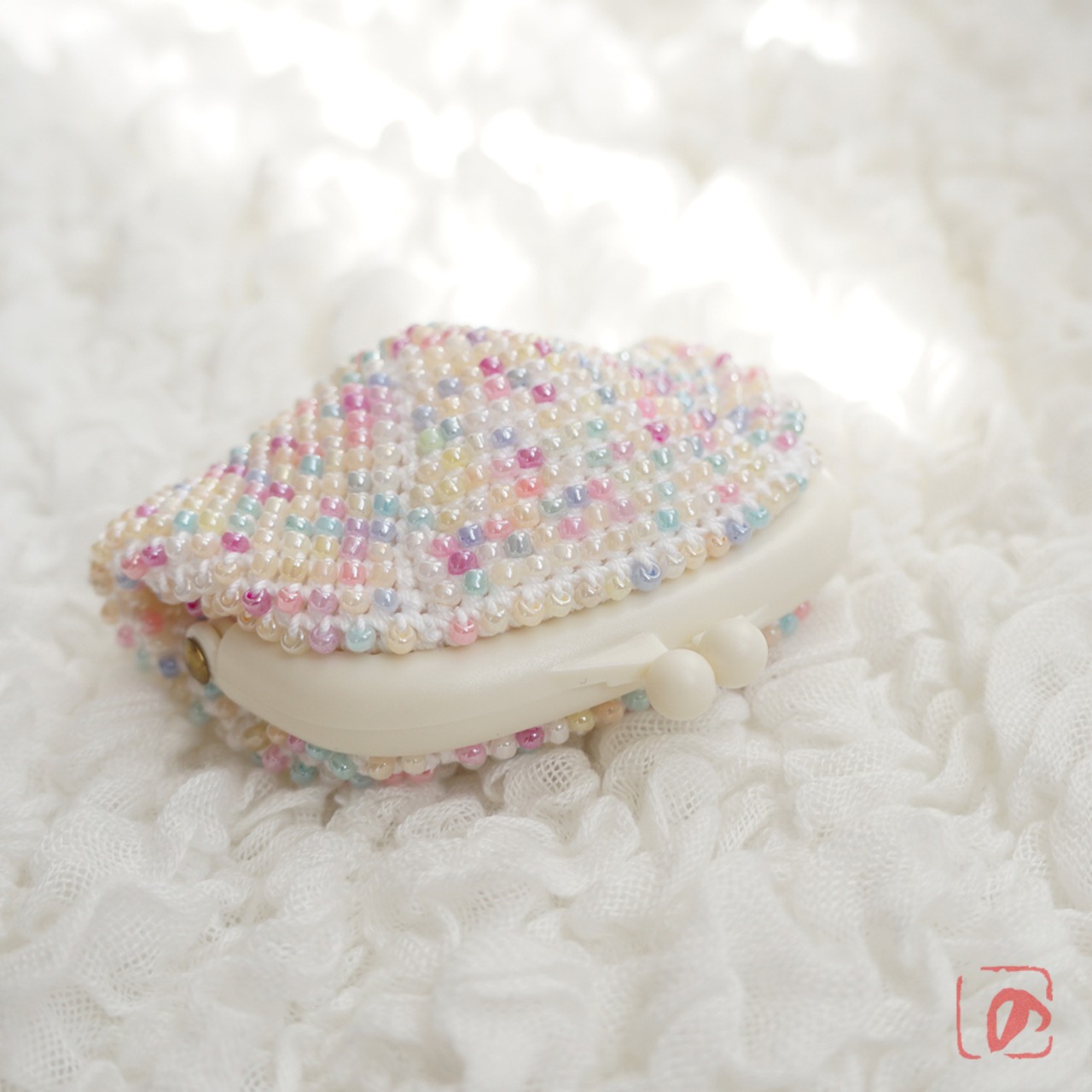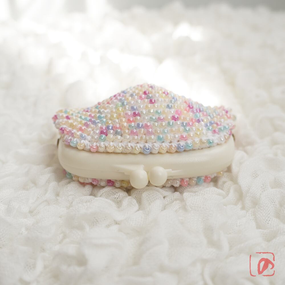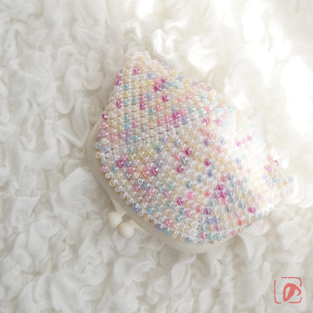 3mmのガラスビーズをひとつぶづつ全面に編み込んだがま口です。